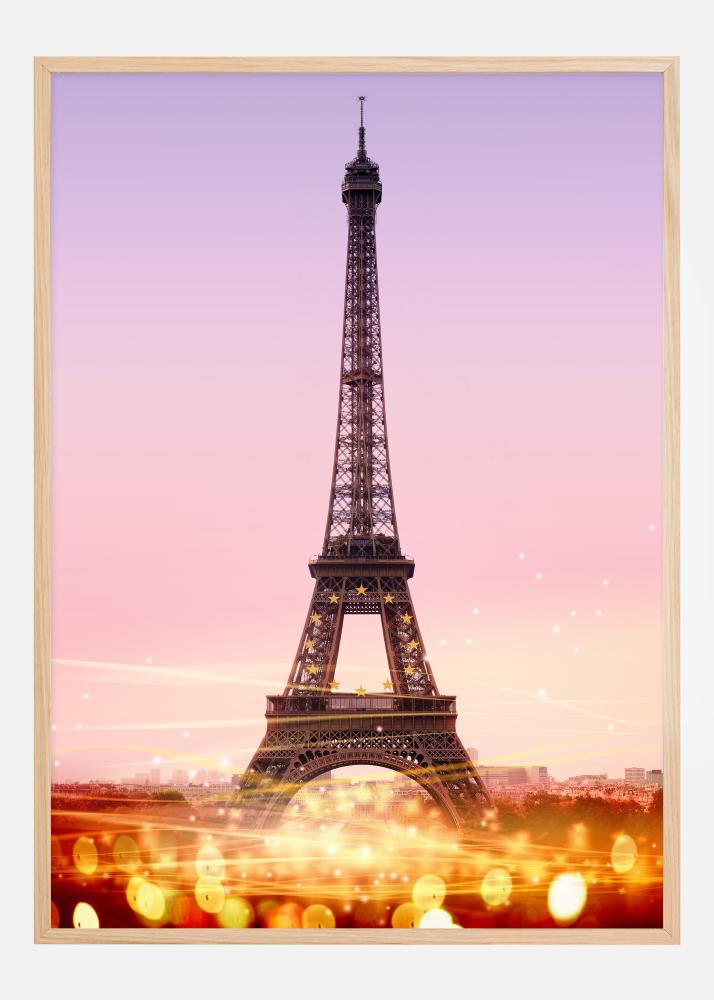 Ten plakat uchwyca majestatyczną Wieżę Eiffla o nastrojowym zmierzchu. Miękkie pastele na niebie tworzą romantyczne tło dla tego ikonicznego zabytku, podczas gdy światła miasta poniżej migoczą jak gwiazdy, dodając poczucia magii i marzycielskiego nastroju. Jest to hołd dla Paryża, miasta światła, i jego zdolności do inspirowania miłości i podziwu.