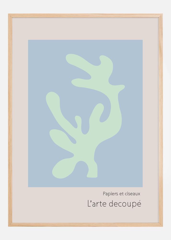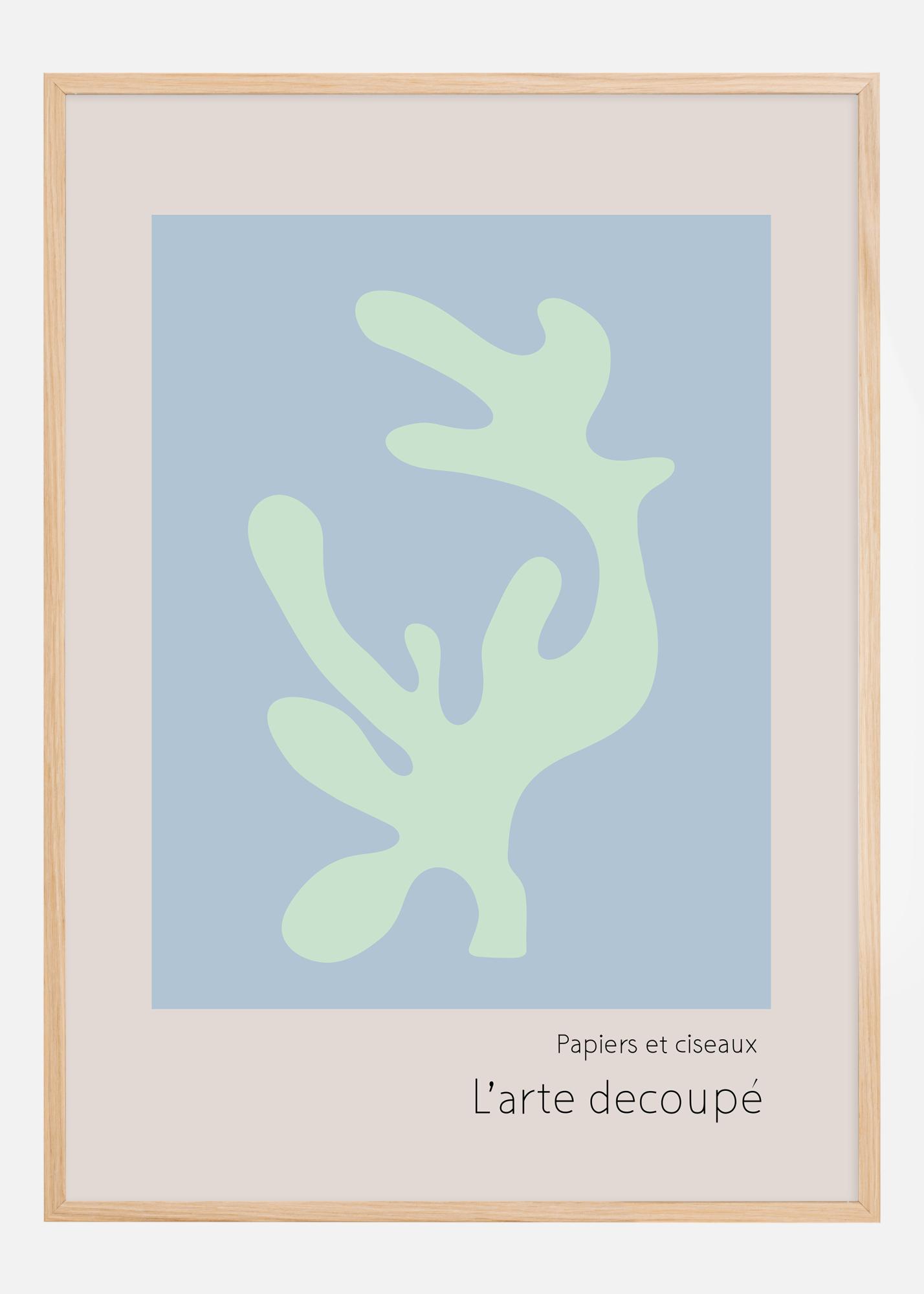Ten wyrafinowany i minimalistyczny plakat oddaje hołd 'L'arte decoupé', sztuce wycinania w papierze, która jest elegancką i ponadczasową formą artystycznego wyrazu. Przedstawia abstrakcyjną formę w kojącym pastelowym zielonym odcieniu unoszącą się na miękkim niebieskim tle, co daje iluzję lekkości i ulotności. Prosta forma, która jest zarówno organiczna, jak i otwarta na interpretację, zaprasza widza do eksploracji negatywnych przestrzeni i znalezienia własnego znaczenia w wyciętym wzorze.