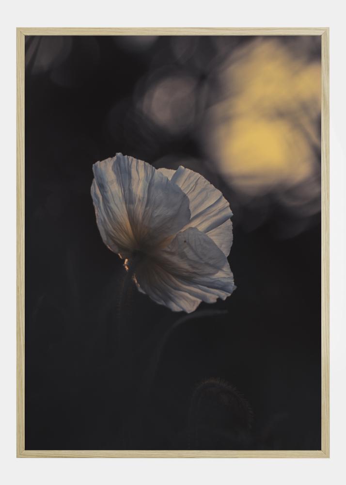 Ten plakat uchwyca istotę spokojnego zmierzchu z pojedynczym makiem na pierwszym planie, oświetlonym ostatnimi promieniami zachodzącego słońca. Kwiat jest delikatny i szczegółowy, jego płatki mają jasny, niemal przezroczysty odcień bieli i jasnoniebieskiego, kontrastujący z ciepłym, rozmytym tłem zachodu słońca w odcieniach pomarańczy i brązu.