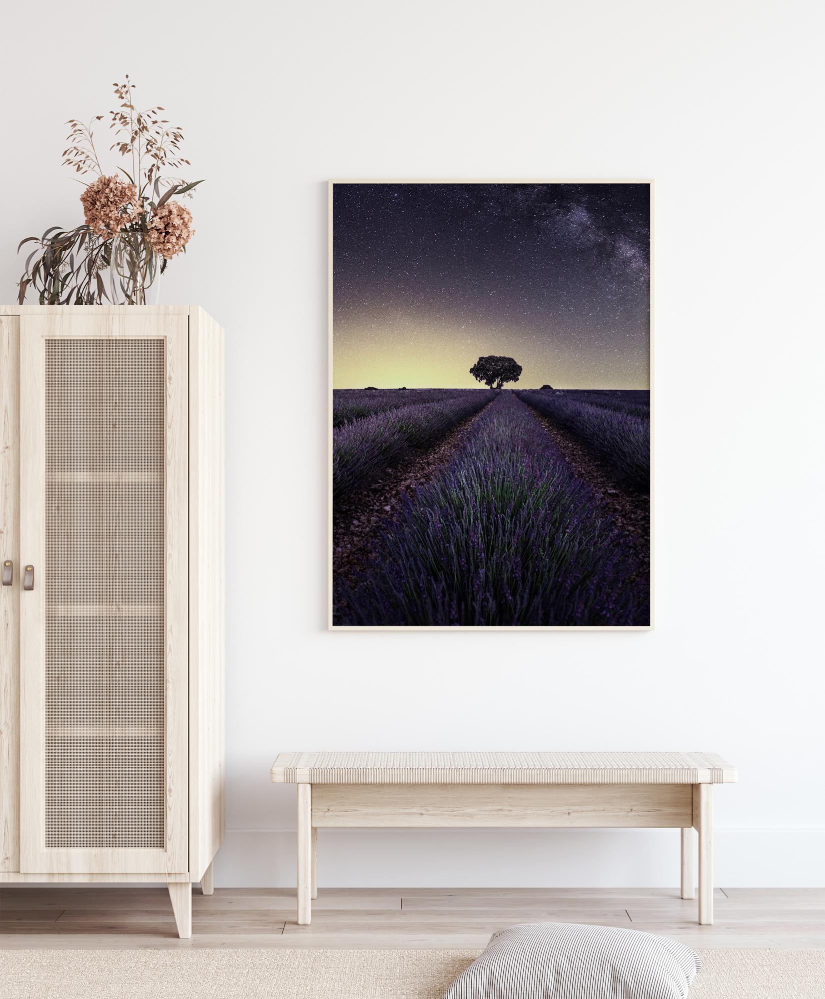 Całkowicie czarujący plakat przedstawiający pole lawendy. Intensywne odcienie fioletowej lawendy, doskonale do siebie dopasowane, tańczą w porannym wietrze. Samotne drzewo rozświetla wczesnoporanne słońce i uzupełnia je ciemne, gwiaździste niebo. Powieś ten druk w swojej kuchni, aby uzyskać naturalny nastrój.
