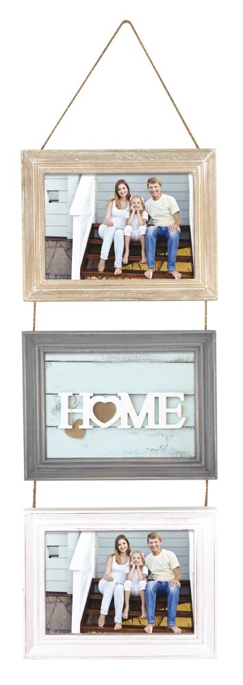 Wypełnij dom oprawionymi zdjęciami bliskich, aby stworzyć ciepłą i przytulną atmosferę. Ta rustykalna ramka collage mieści trzy najlepsze zdjęcia w formacie poziomym 10x15 cm. Ramki są w kolorze drewnianym, szarym i białym z zużytymi detalami. Są połączone dekoracyjnym, cienkim sznurkiem, który również służy do łatwego zawieszania.