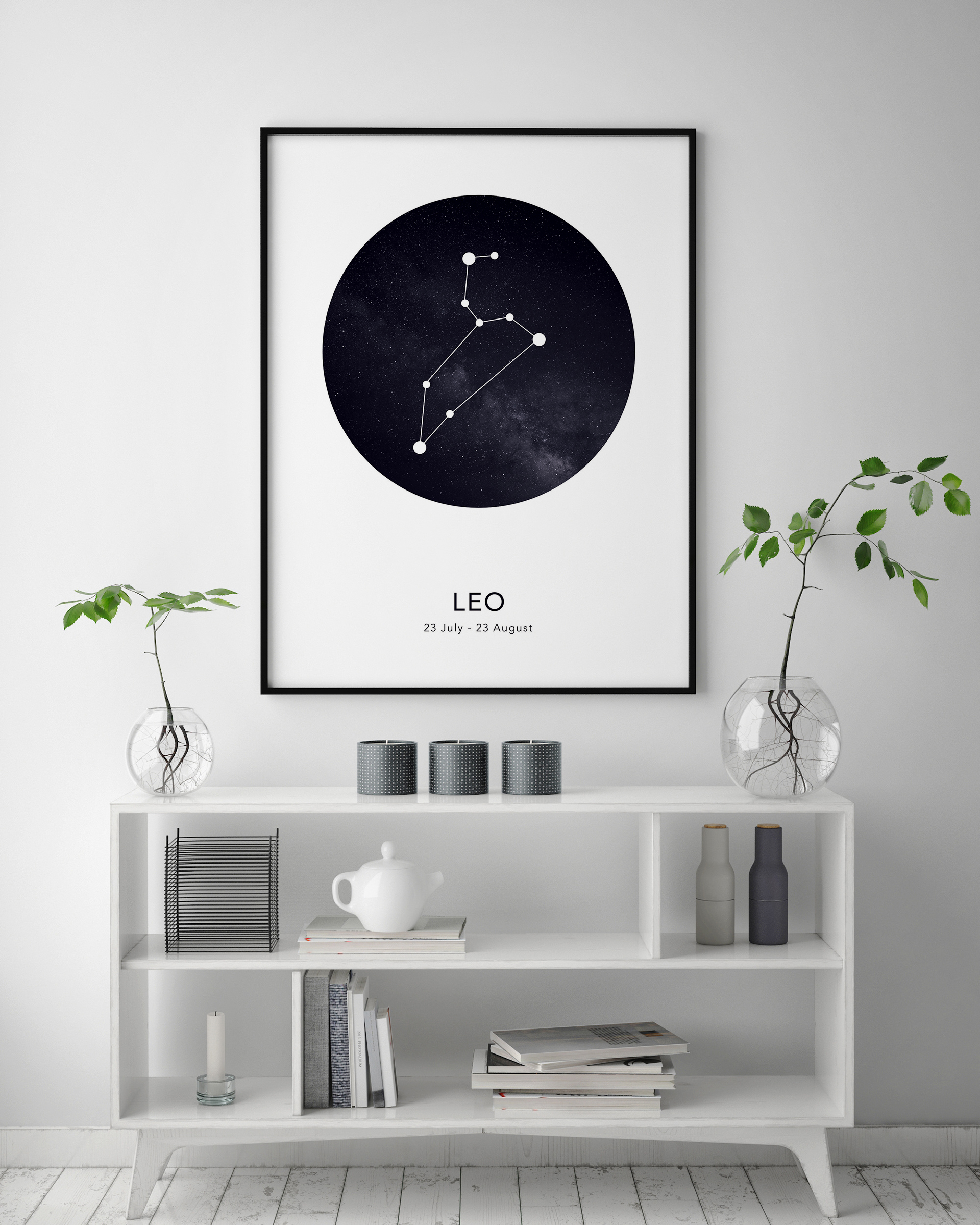 Podaruj spersonalizowany obrazek komuś, kogo lubisz! Ten elegancki plakat przedstawia znak zodiaku Lew na tle czarno-niebieskiego nieba pełnego gwiazd. Poniżej znajduje się nazwa wraz z obowiązującymi datami po angielsku.