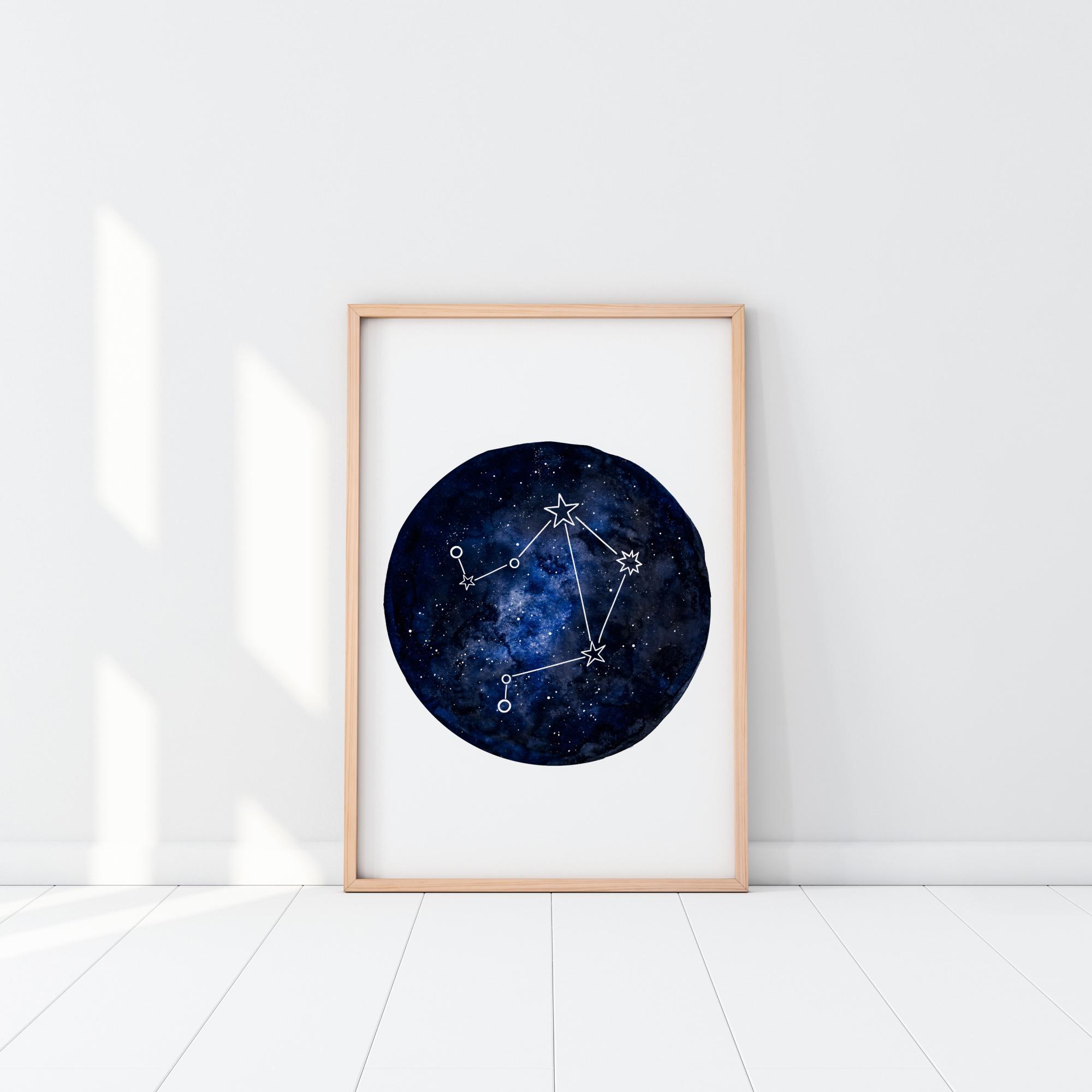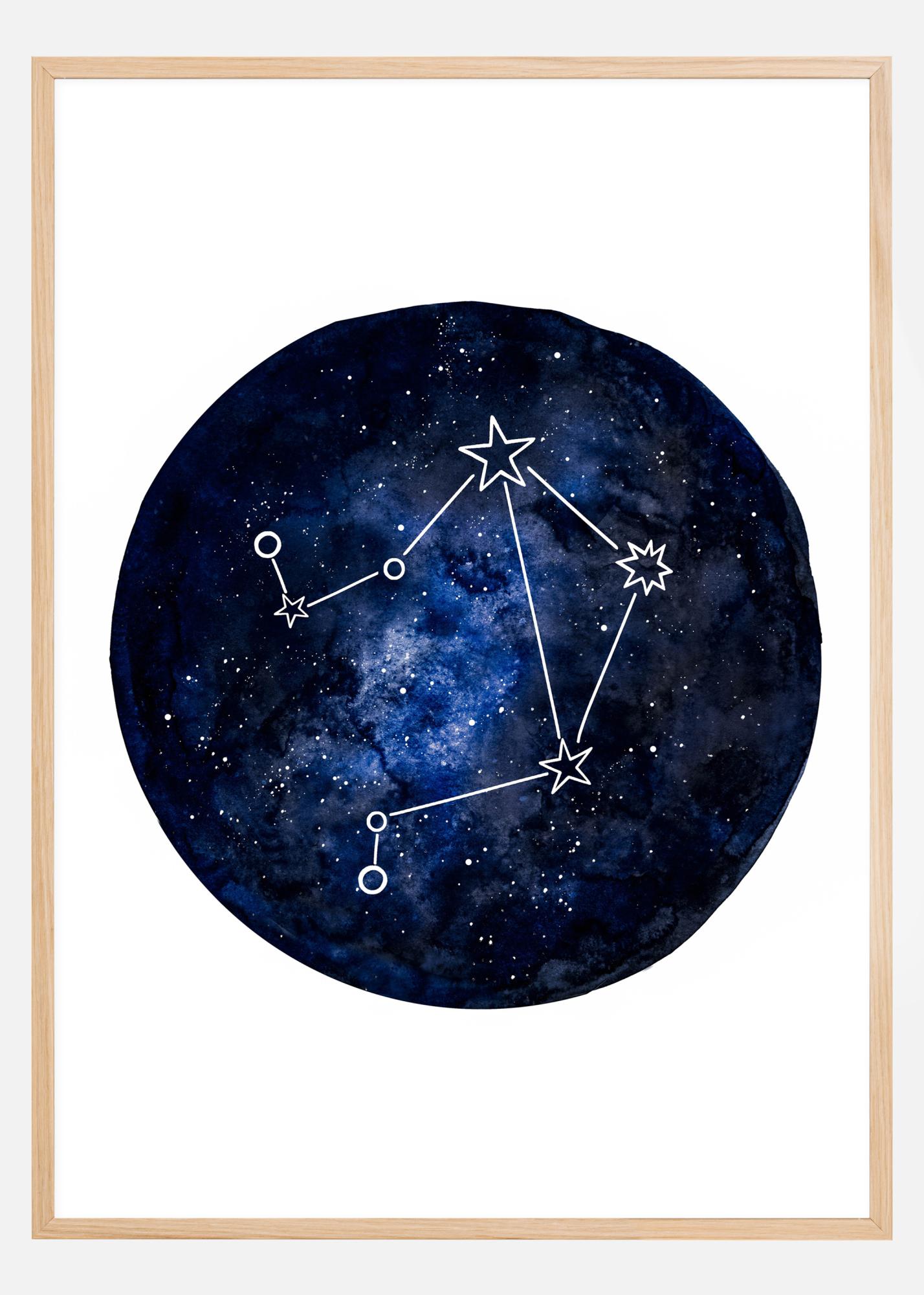 Astrologiczna mapa w małej skali przedstawiająca konstelację Wagi. Granatowa mapa znajduje się na prostym białym tle i jest podkreślona białymi liniami pokazującymi konstelację Wagi. Plakat, który jest idealnym prezentem dla wszystkich urodzonych pod tym znakiem zodiaku.