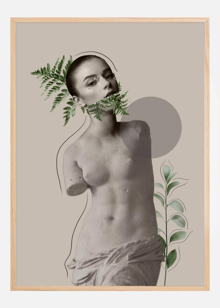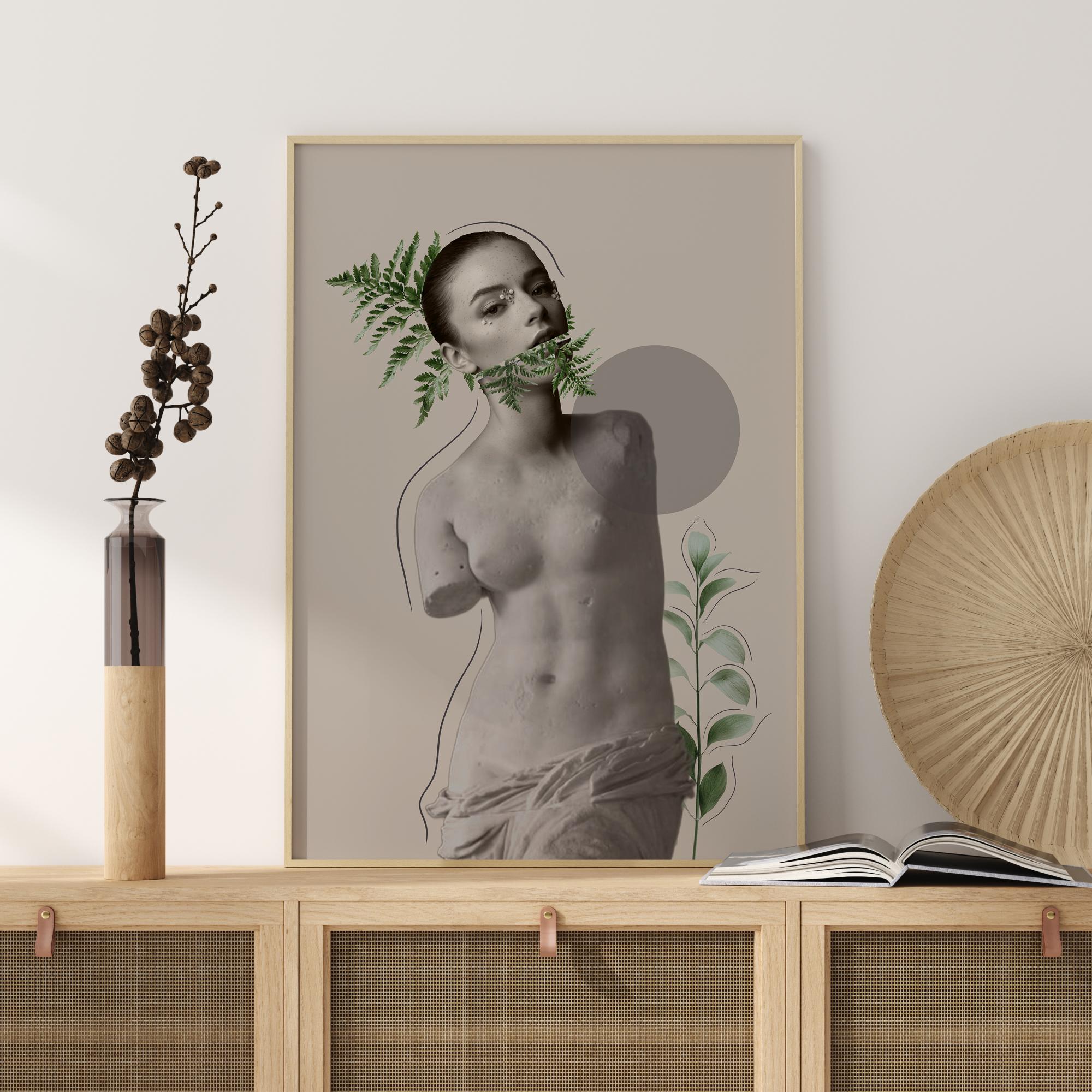 Ekspresyjny plakat, który podkreśla piękno motywu w kolażu. Główna bohaterka to piękna kobieta otoczona zielenią na starej greckiej rzeźbie. Subtelny kontrast między nowoczesnością a antykiem. Ten obraz jest silnym wyrazem minimalistycznego salonu.