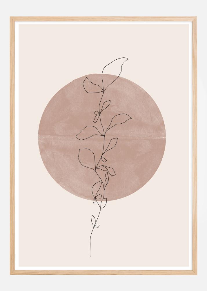Ten plakat przedstawia delikatną ilustrację liniową kwitnącej gałęzi, której kontury współgrają z dużym, malowanym kołem w uspokajającym, ziemistym odcieniu. Kontrast między minimalnym motywem kwiatowym a intensywnym kolorem tła tworzy ciekawą dynamikę, która jest zarówno uspokajająca, jak i estetycznie atrakcyjna.