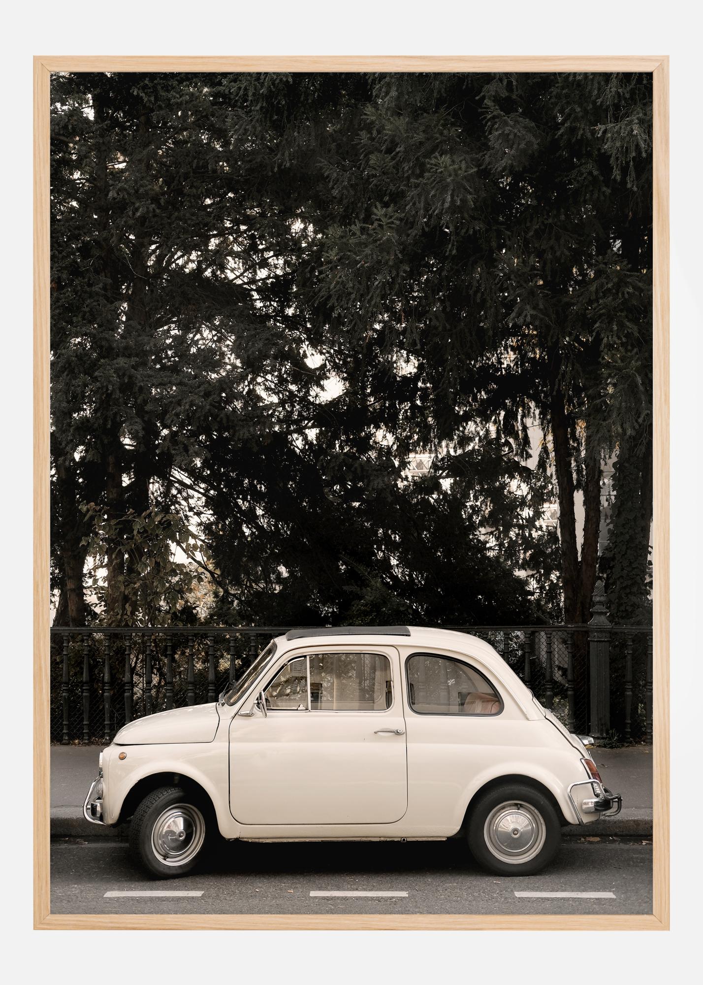 Na tym plakacie ukazana jest doskonała równowaga między czystą białą powierzchnią pojazdu a ciemniejszymi zielonymi tonami drzew w tle, które razem tworzą spokojny i harmonijny obraz. Sepiowe niebo i subtelne miejskie otoczenie dodają dodatkowy wymiar ciepła i głębi. Ten plakat wniesie odrobinę wyrafinowania do każdego pokoju i jest idealnym prezentem dla miłośników samochodów lub dla tych, którzy cenią klasyczną estetykę w swoim wnętrzu.