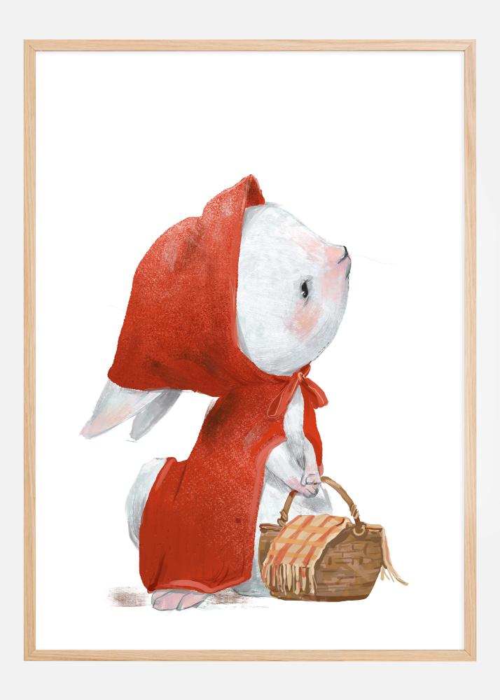 Ten uroczy plakat przedstawia nową interpretację klasycznej bajki o Czerwonym Kapturku, z uroczym małym królikiem w roli głównej. Królik jest ubrany w jaskrawoczerwony kaptur i niesie koszyk, co stanowi przyjazne nawiązanie do słynnej opowieści. Technika akwarelowa dodaje obrazowi miękkiego i marzycielskiego elementu, a delikatne pociągnięcia pędzlem podkreślają niewinność królika i zabawny charakter ilustracji.