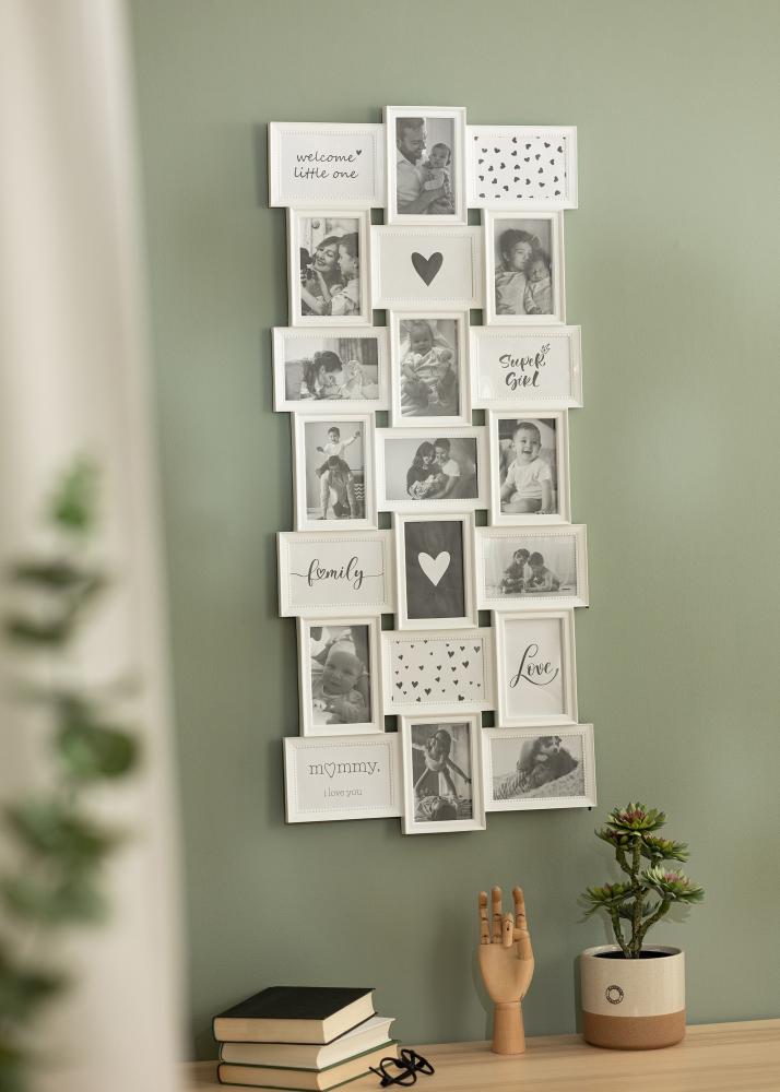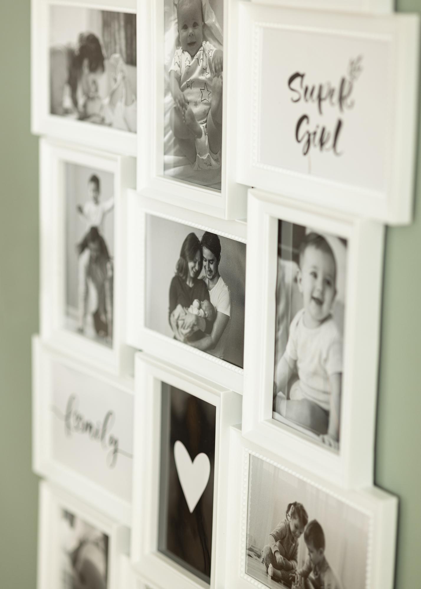 Ta ramka na kolaż mieści aż 21 zdjęć o wymiarach 10x15 cm. Dzięki temu możesz umieścić wszystkie swoje ulubione zdjęcia rodziny, znajomych i bliskich. Jeśli dodatkowo połączysz swoje fotografie z obrazkami z cytatami lub motywami graficznymi, uzyskasz zawieszenie, które jest zarówno piękne, jak i fascynujące!