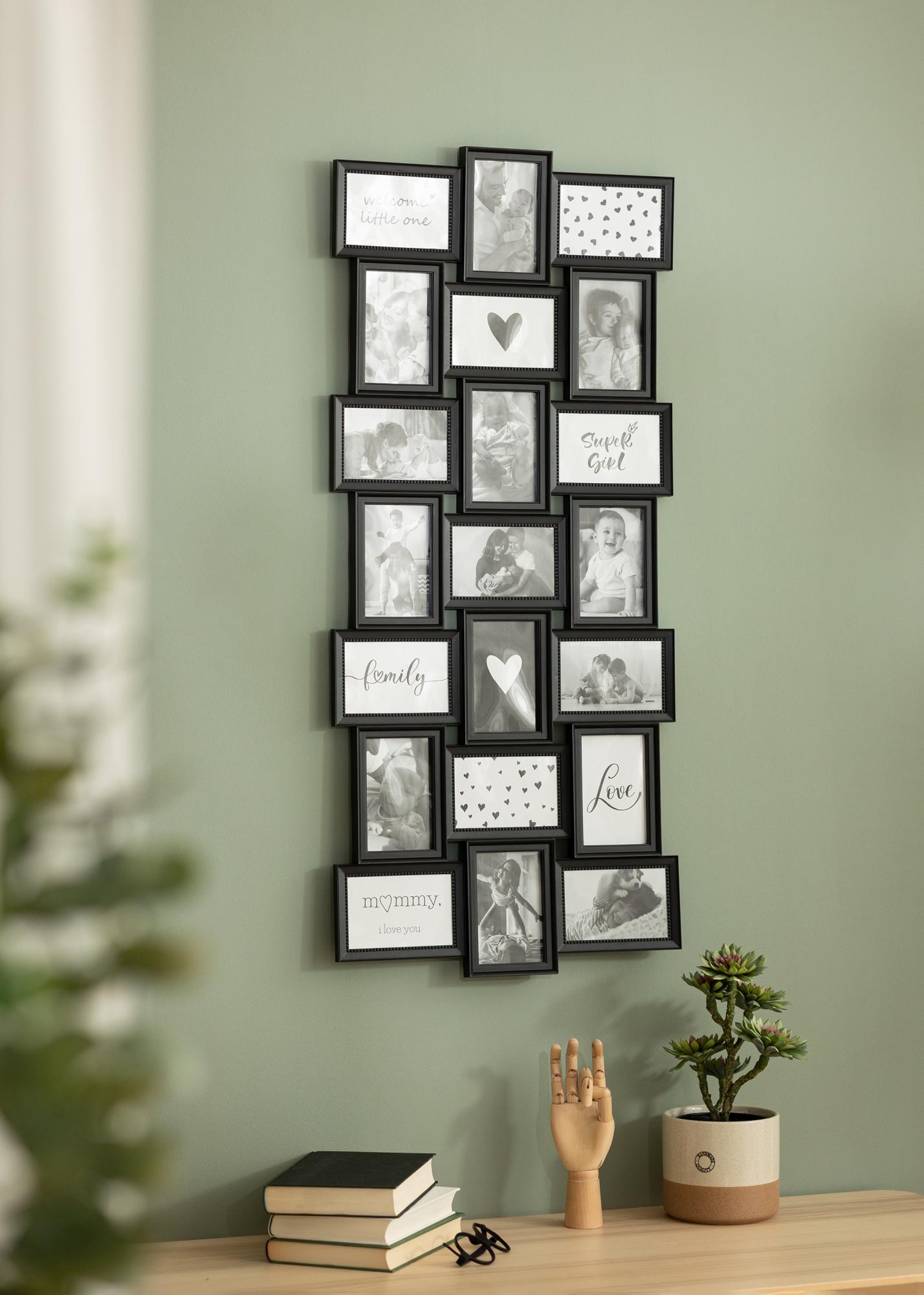 Czy masz dużą rodzinę, której wiele zdjęć chcesz zawiesić na ścianie? W takim razie ta ramka na kolaż to dobry wybór – mieści bowiem aż 21 fotografii! Ramka pasuje do zdjęć o wymiarach 10x15 cm i łączy obrazy zarówno w pozycji pionowej, jak i poziomej. Różne formaty są ułożone symetrycznie, co nadaje bardzo elegancki wygląd. Możesz samodzielnie zdecydować, czy chcesz zamontować ramkę w pozycji pionowej czy poziomej.