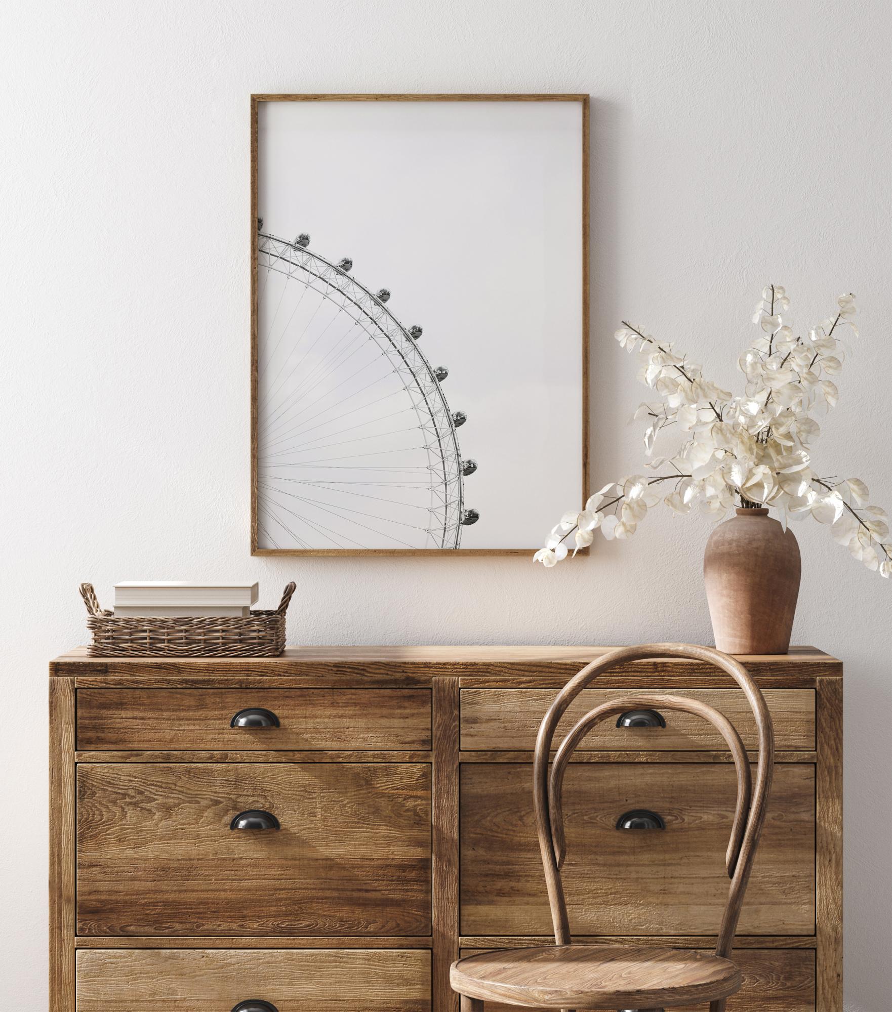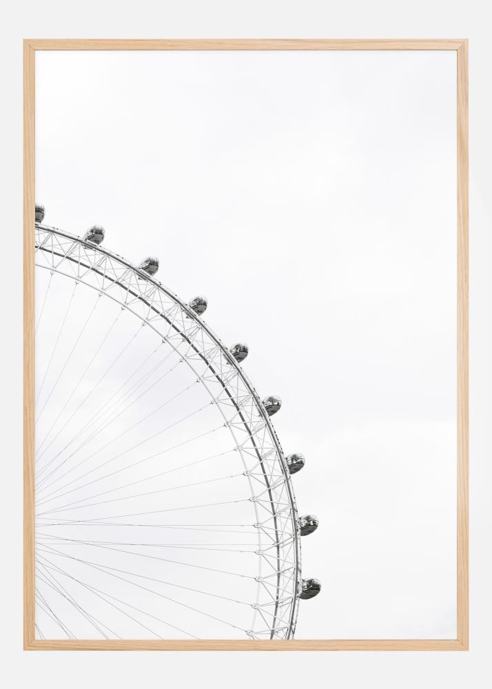 Imponujące czarno-białe zdjęcie London Eye. Na tle szarego londyńskiego nieba, szprychy koła przyciągają wzrok do dziewięciu kabin pasażerskich. Naprawdę imponujący plakat, który uwydatnia tę wspaniałą konstrukcję techniczną. Wyobraź sobie widok z jednej z tych kabin.