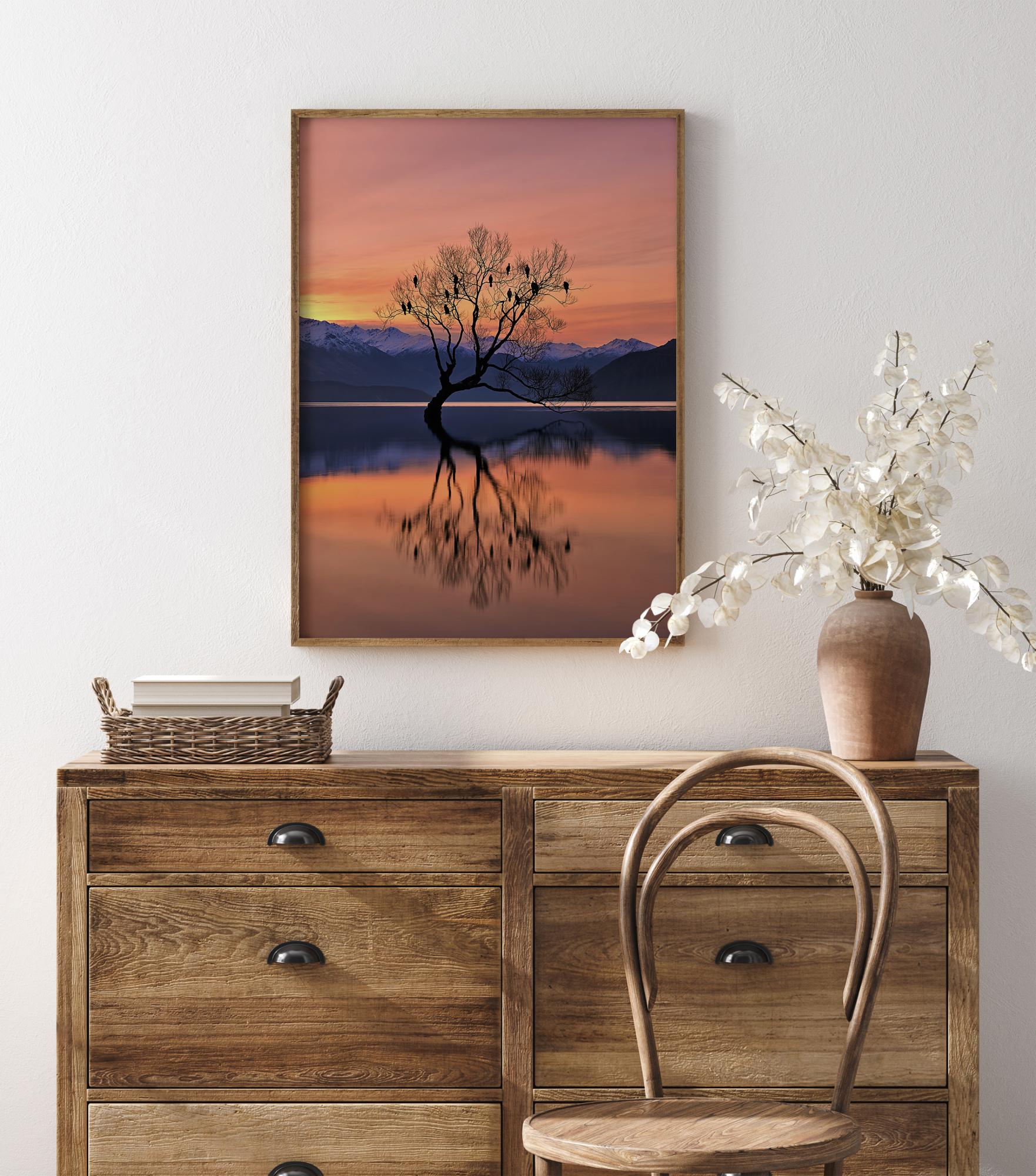 Piękny plakat przyrodniczy z samotnym drzewem pośrodku jeziora. Z ptakami siedzącymi spokojnie na gałęziach, ten pastelowy obrazek odbija drzewo w jeziorze, tworząc doskonały efekt lustrzanego odbicia zarówno natury, jak i kolorów. Poczuć ciszę w tym kojącym obrazie.