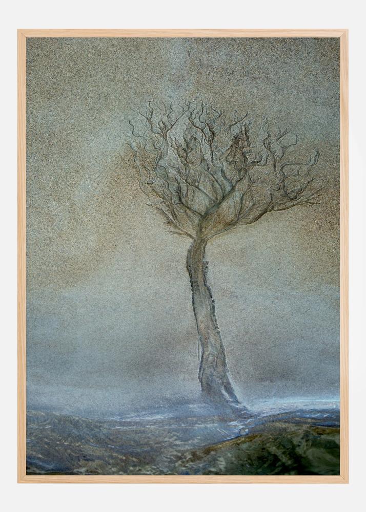 Plakat krajobrazowy z melancholijnym samotnym drzewem. Wydruk przedstawia bladą panoramę równin z pagórkami na pierwszym planie. Samotne bezlistne drzewo dominuje na pierwszym planie. Miękkie szare i brązowe kolory tworzą melancholijny i zagubiony nastrój. Powieś ten wydruk w spokojnym miejscu.