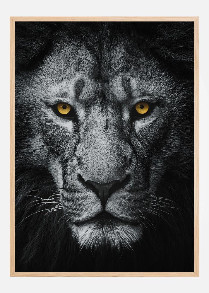 Ten odważny i sugestywny plakat przedstawia portret lwa z imponującą szczegółowością. Obraz jest w czerni i bieli z wyjątkiem oczu lwa, które świecą w jasnym i żywym żółtym kolorze, tworząc nieodpartą atrakcję w motywie. Przemyślane użycie koloru i kontrastu nadaje poczucie intensywności i obecności, które przyciągają i utrzymują uwagę obserwatora. Ten plakat jest idealny dla tych, którzy szukają poczucia dzikiej i naturalnej siły w swoim wystroju.