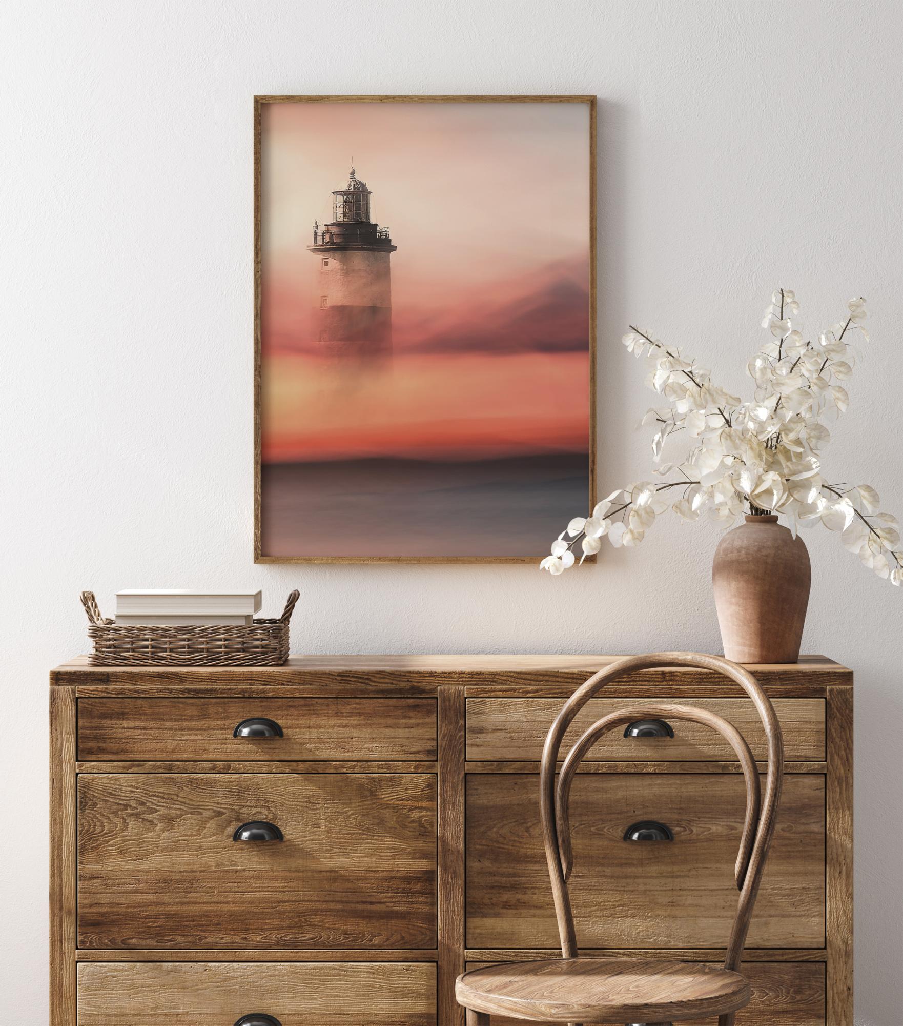 Piękny romantyczny nadruk latarni morskiej w mgle morskiej. Delikatne, różowe pastelowe kolory tworzą poczucie romantyzmu, podczas gdy miękkie niebieskie morze nadaje ciemniejszy ton temu pięknemu plakatowi. Poczuj i usłysz morską bryzę, gdy zawiesisz ten obraz w swoim domu.