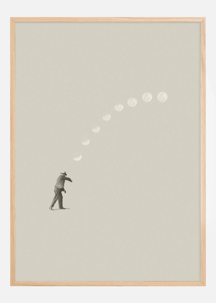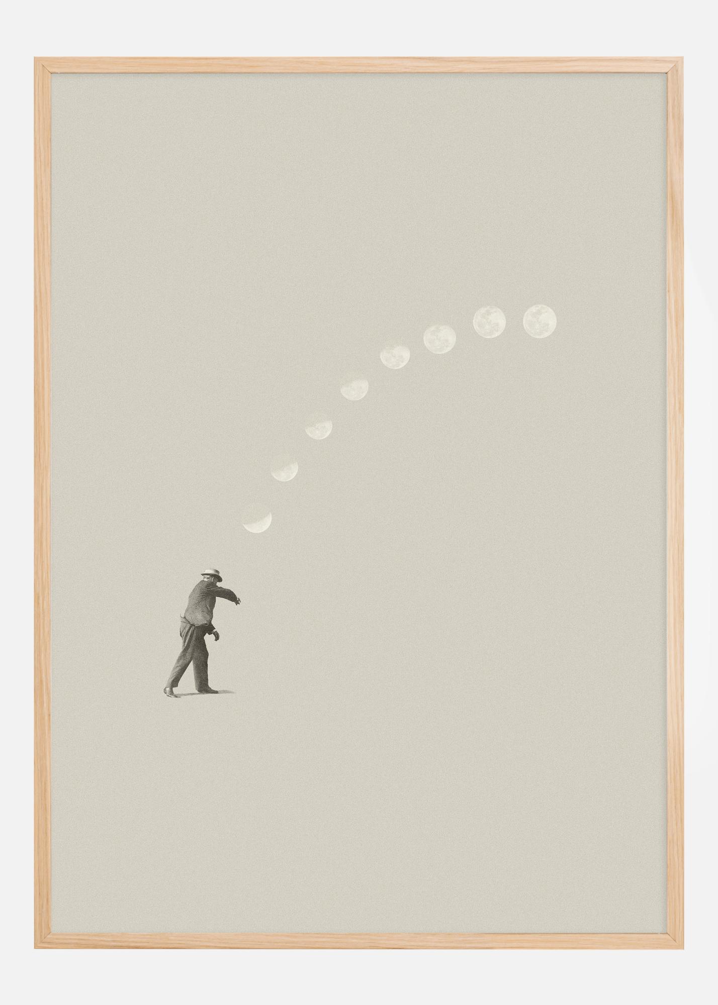 Ten poetycki plakat przedstawia sylwetkę mężczyzny, który z potężnym ruchem rzuca księżyc na niebo. To scena, która uchwyca moment, kiedy księżyc jest elegancko wysyłany i tworzy trajektorię różnych faz księżyca. Ten akt symbolizuje być może marzenia i ambicje, które są skierowane ku nieskończonym możliwościom. Minimalizm obrazu wzmacnia potężny gest i pozostawia przestrzeń dla widza, aby dopełnić własną historię i znaczenie.