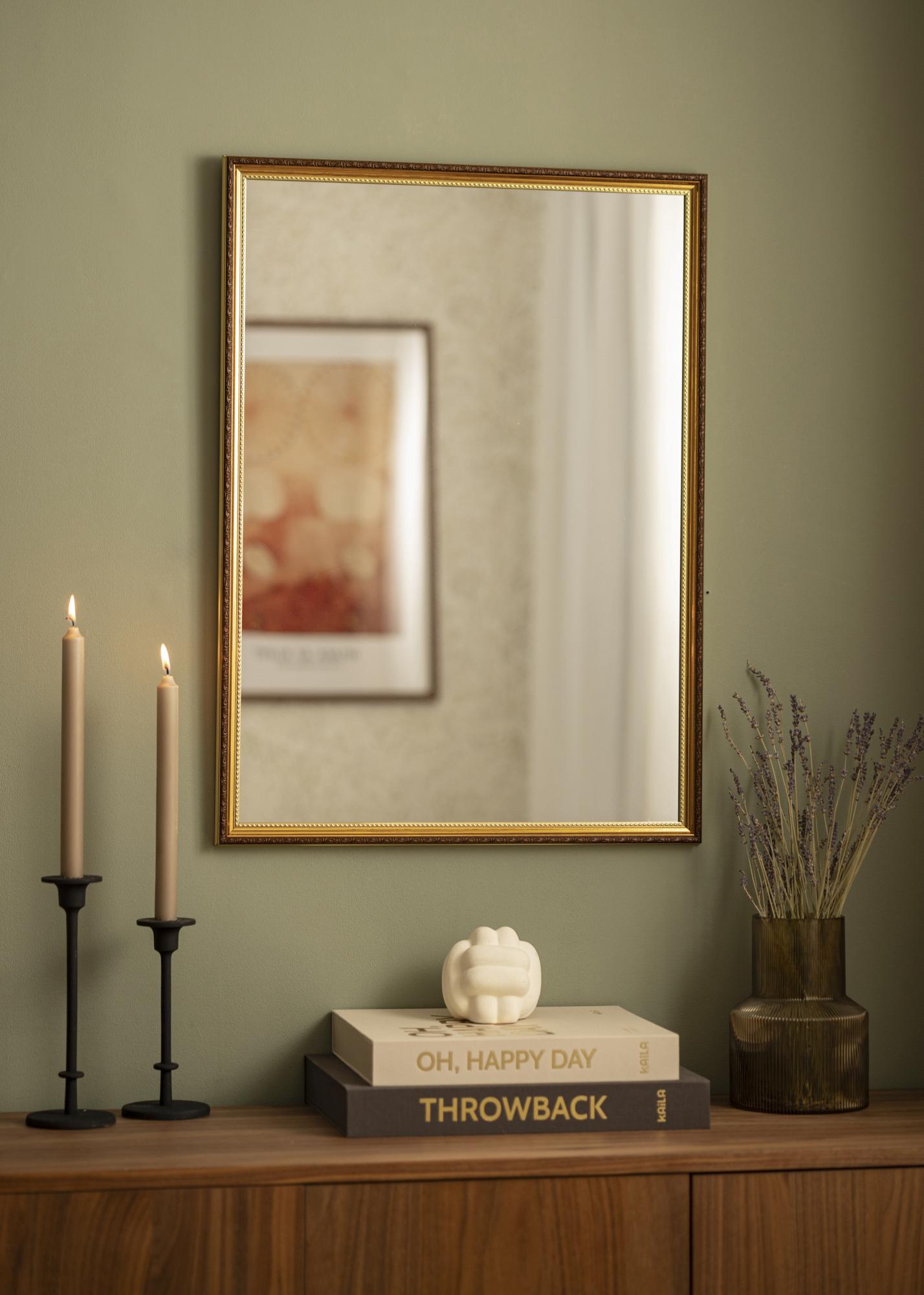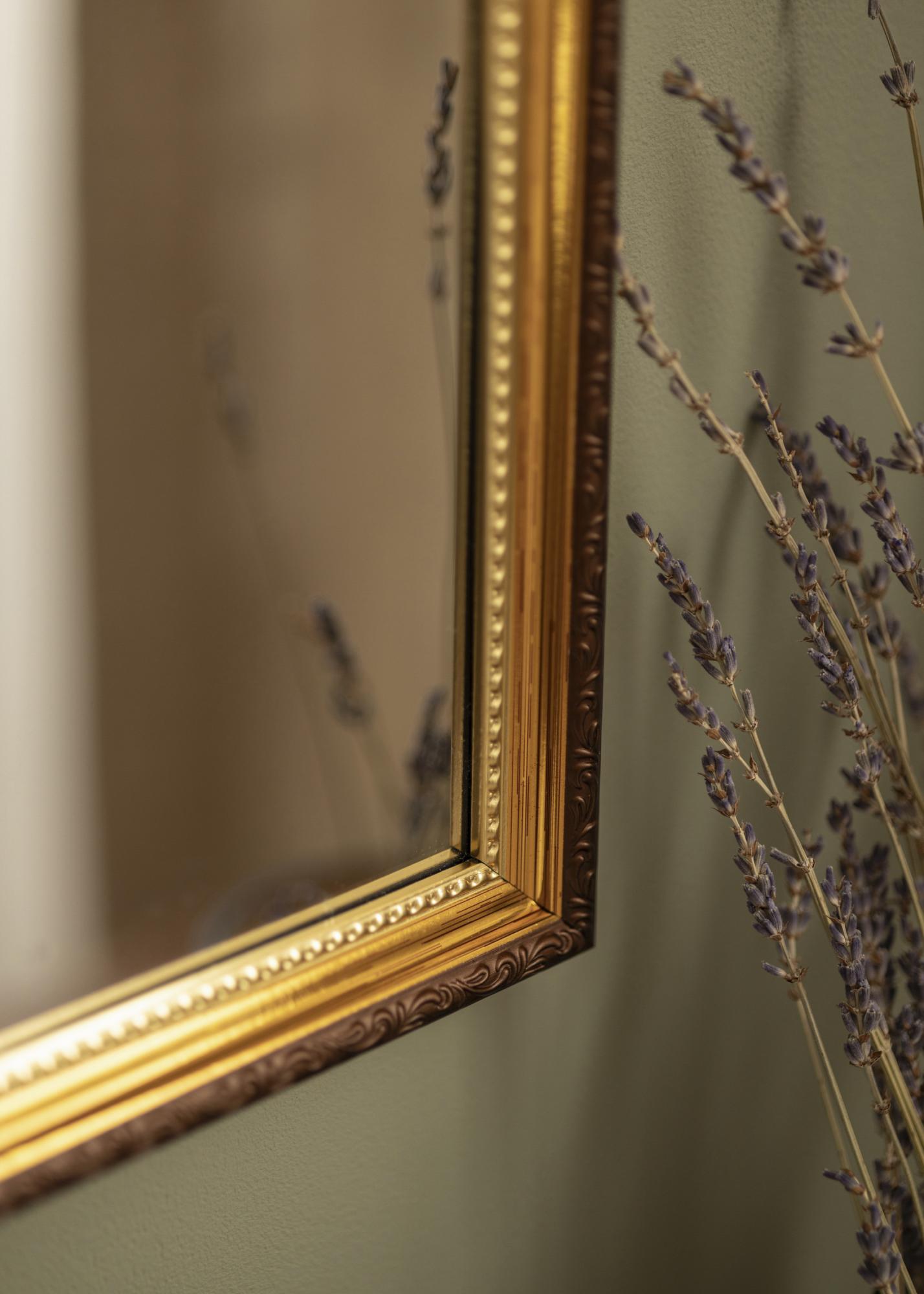 Abisko Złoto to lustro ścienne dla osób szukających dekoracyjnego lustra z eleganckim, retroinspirowanym wyglądem. Lustro ma ramę o szerokości 25 mm w brązowym odcieniu oraz ekskluzywnym złotym kolorze najbliżej tafli lustra. Rama ma pięknie zdobiony profil, co czyni lustro ścienne bardzo stylową dekoracją ścienną, która pasuje zarówno do przedpokoju, jak i sypialni.