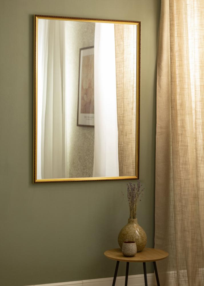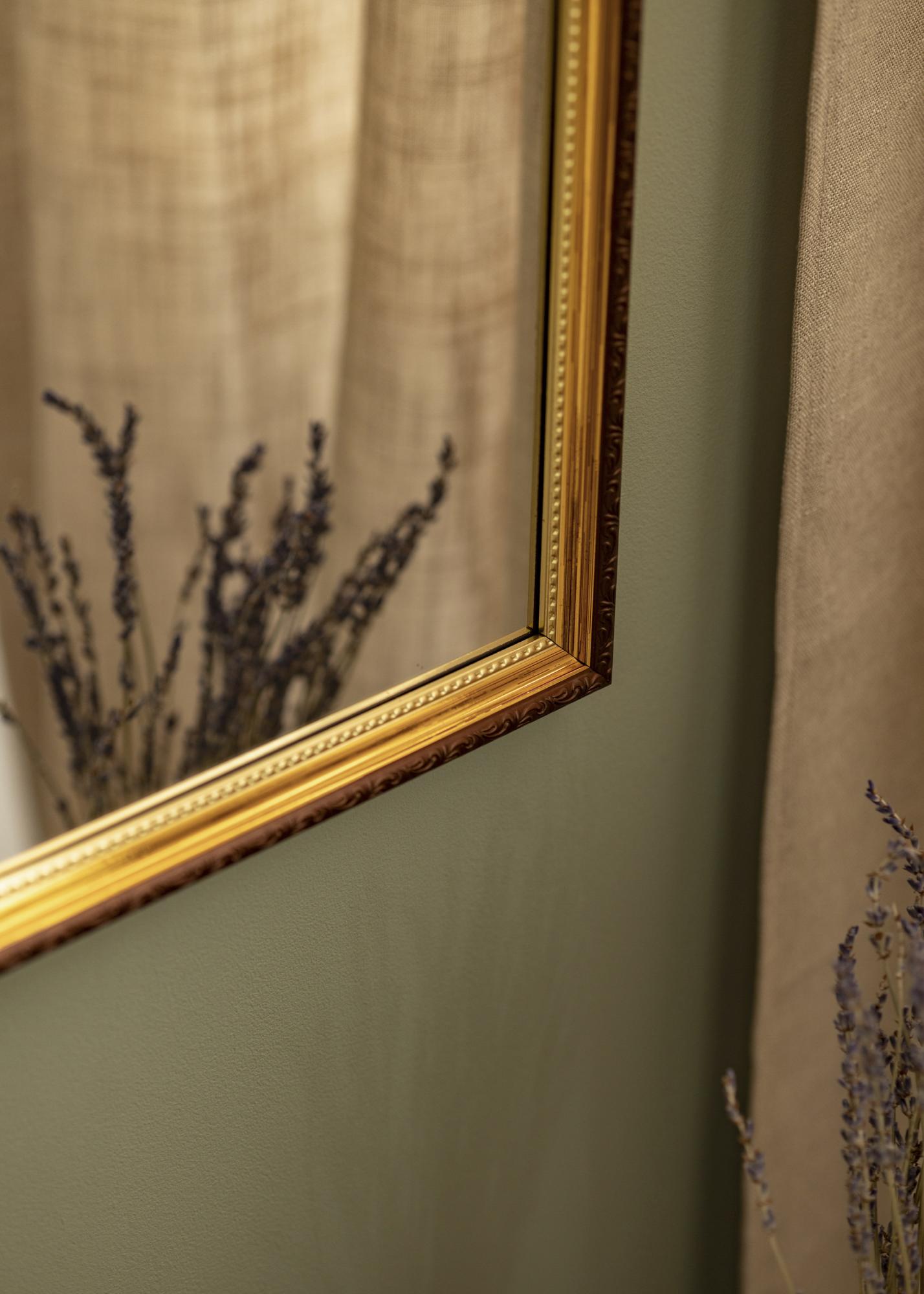 Abisko Złoto to lustro ścienne dla tych, którzy szukają dekoracyjnego lustra o eleganckim, retroinspirowanym wyglądzie. Lustro ma ramę o szerokości 25 mm w odcieniu brązu i ekskluzywnym złotym kolorze najbliżej szkła lustra. Rama ma pięknie zdobiony profil, co czyni to lustro ścienne bardzo stylową dekoracją ścienną, która pasuje zarówno do przedpokoju, jak i sypialni.
