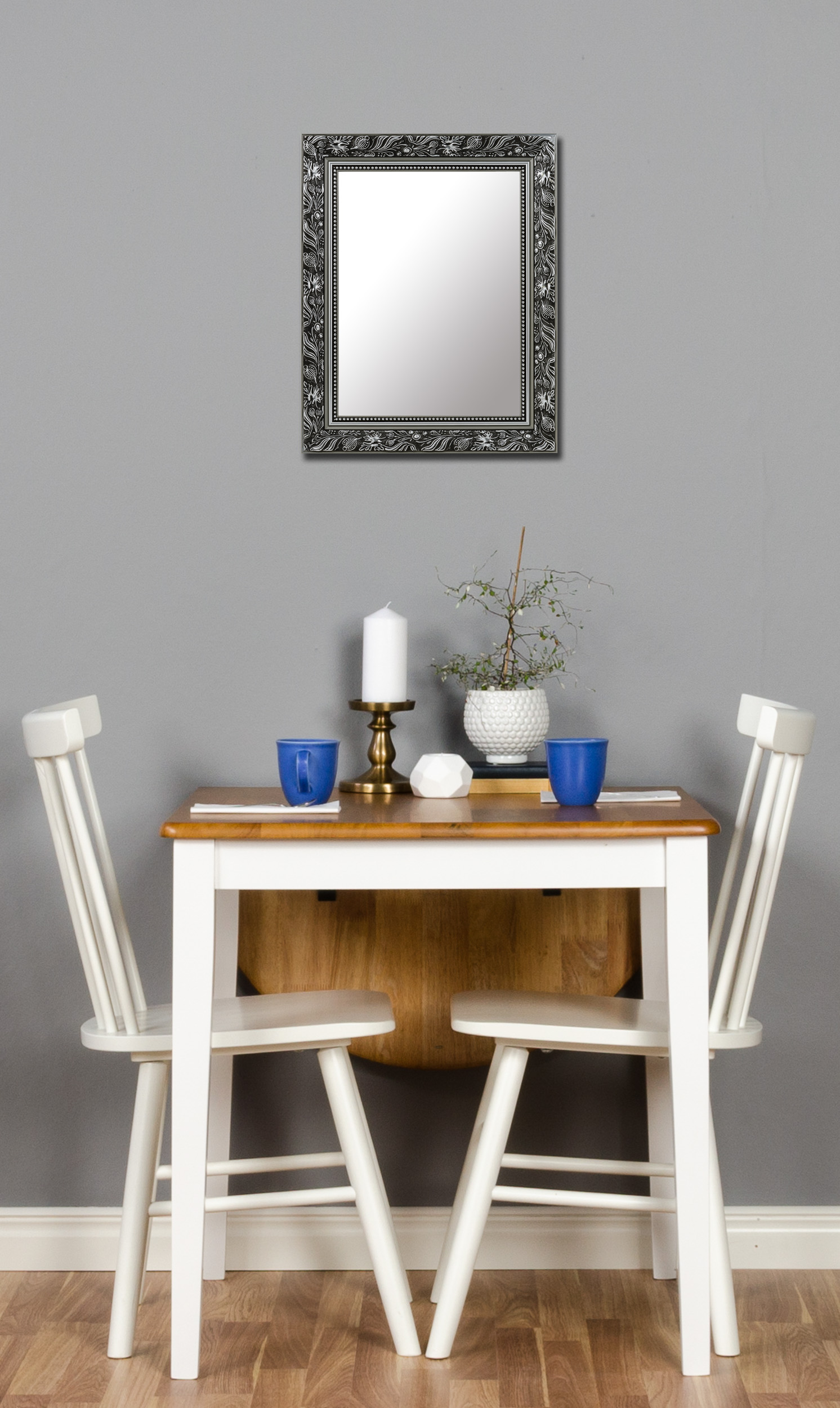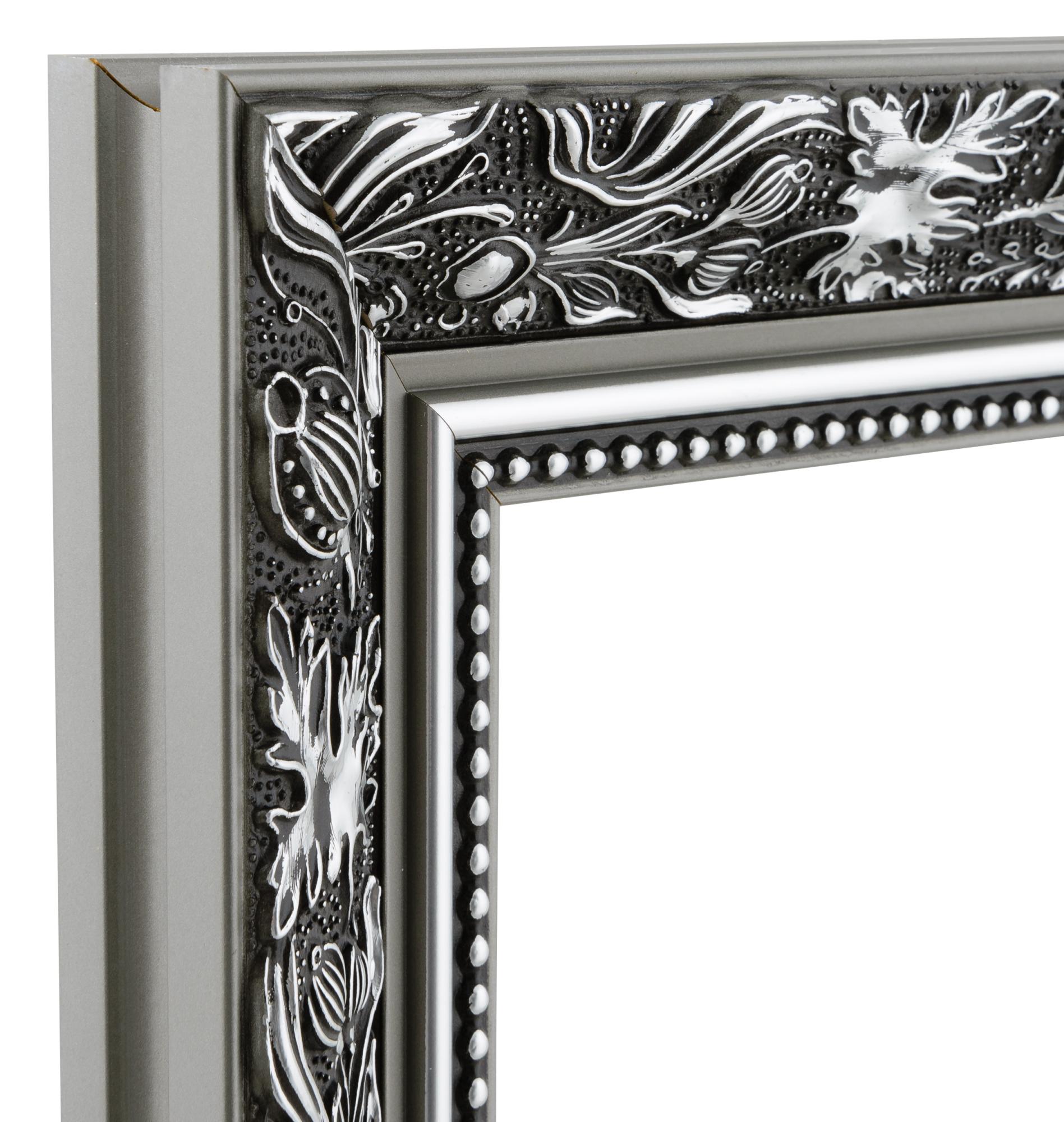 Przyglądaj się sobie z klasą w tym wytwornym lustrze w kolorach czarnym i srebrnym! Rama lustra ma zarówno matowe, jak i błyszczące detale, co czyni ją bardzo dekoracyjną. Z przodu znajduje się szeroki pas z motywem liści, gładkie części w matowym i błyszczącym srebrze oraz pasek z motywem pereł tuż przy szkle. Ponieważ lustro jest wytwarzane przez wykwalifikowany personel w naszej własnej pracowni ramowej, możesz oczekiwać produktu o wysokiej jakości!