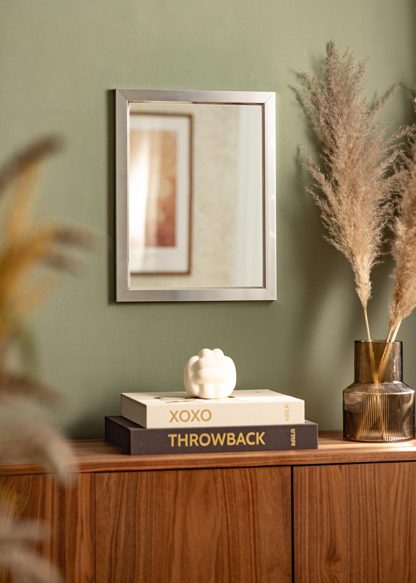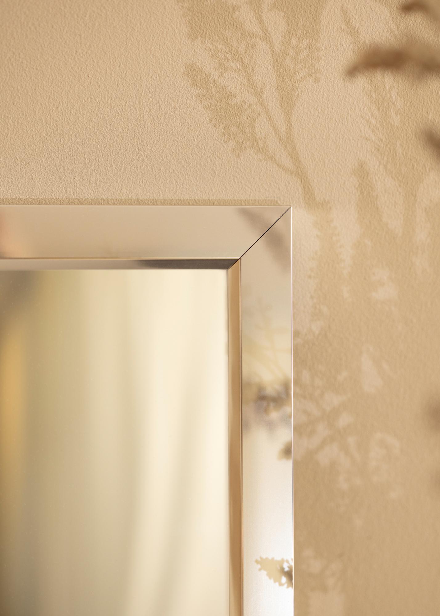 Niesamowite, stylowe lustro z wysoko połyskującą srebrną ramą z efektem szkła lustrzanego. Rama jest wykonana z aluminium w Niemczech i utrzymuje wysoką jakość. Wysokopołyskowy wygląd ramy lustra przyciąga uwagę i efektywnie odbija światło, co jest korzystne, jeśli chcesz używać lustra, aby rozjaśnić ciemne pomieszczenie. Czysta forma lustra dobrze pasuje zarówno do minimalistycznych nowoczesnych wnętrz, jak i do domów, w których łączy się nowe i stare elementy.