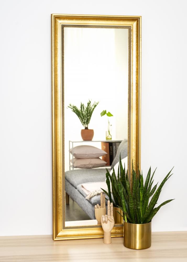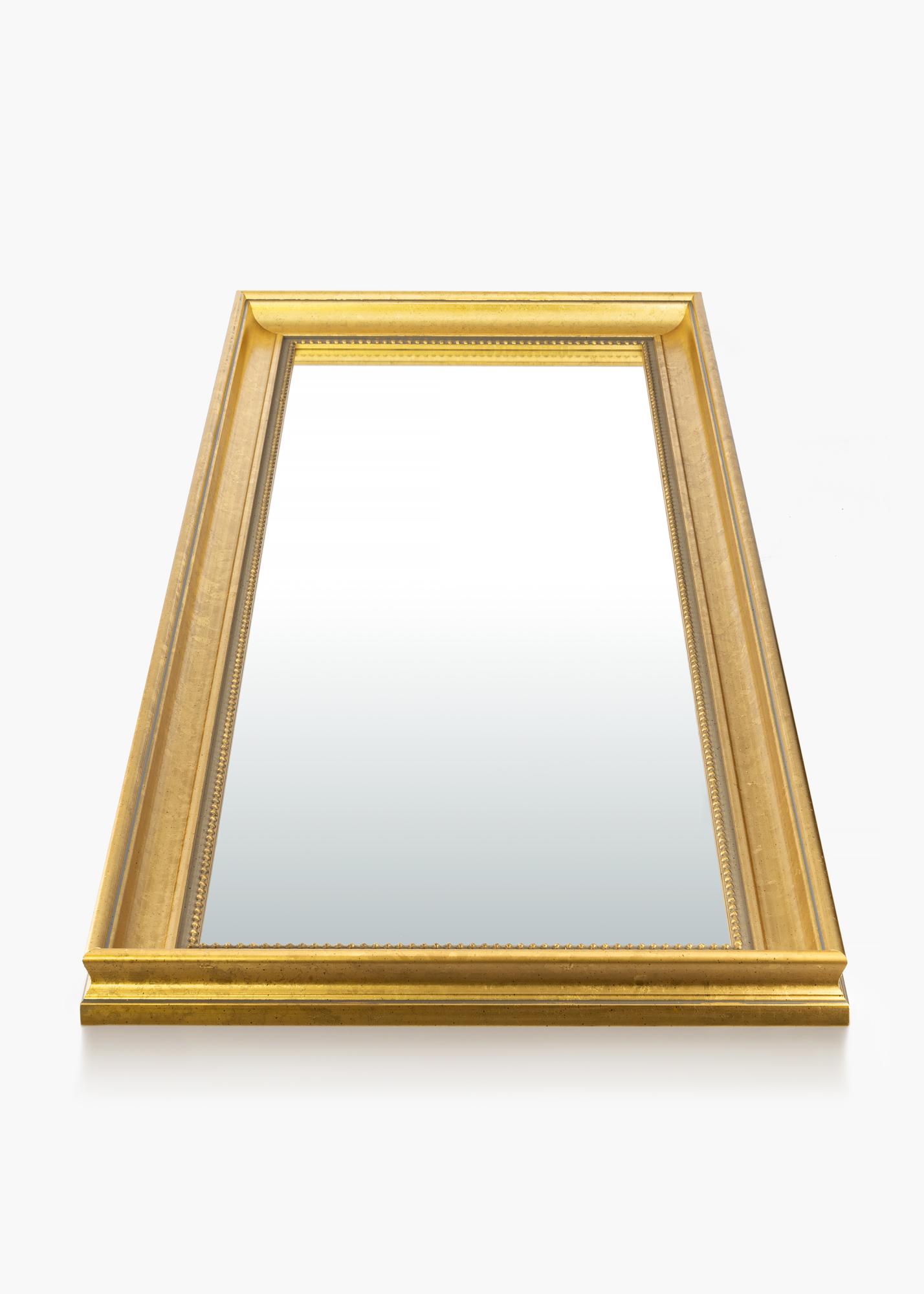 Zaopatrz się w eleganckie lustro i dodaj wnętrzu przedpokoju, salonu lub łazienki dodatkowego luksusu. To stylowe lustro jest dostępne w kilku różnych rozmiarach, dzięki czemu łatwo znajdziesz takie, które pasuje do Twojego celu. Rama lustra ma klasyczny design z szeroką ramą i dyskretnym wzorem perełek blisko szkła. Drewno pochodzi z zrównoważonego leśnictwa i jest pomalowane na piękny złoty odcień.