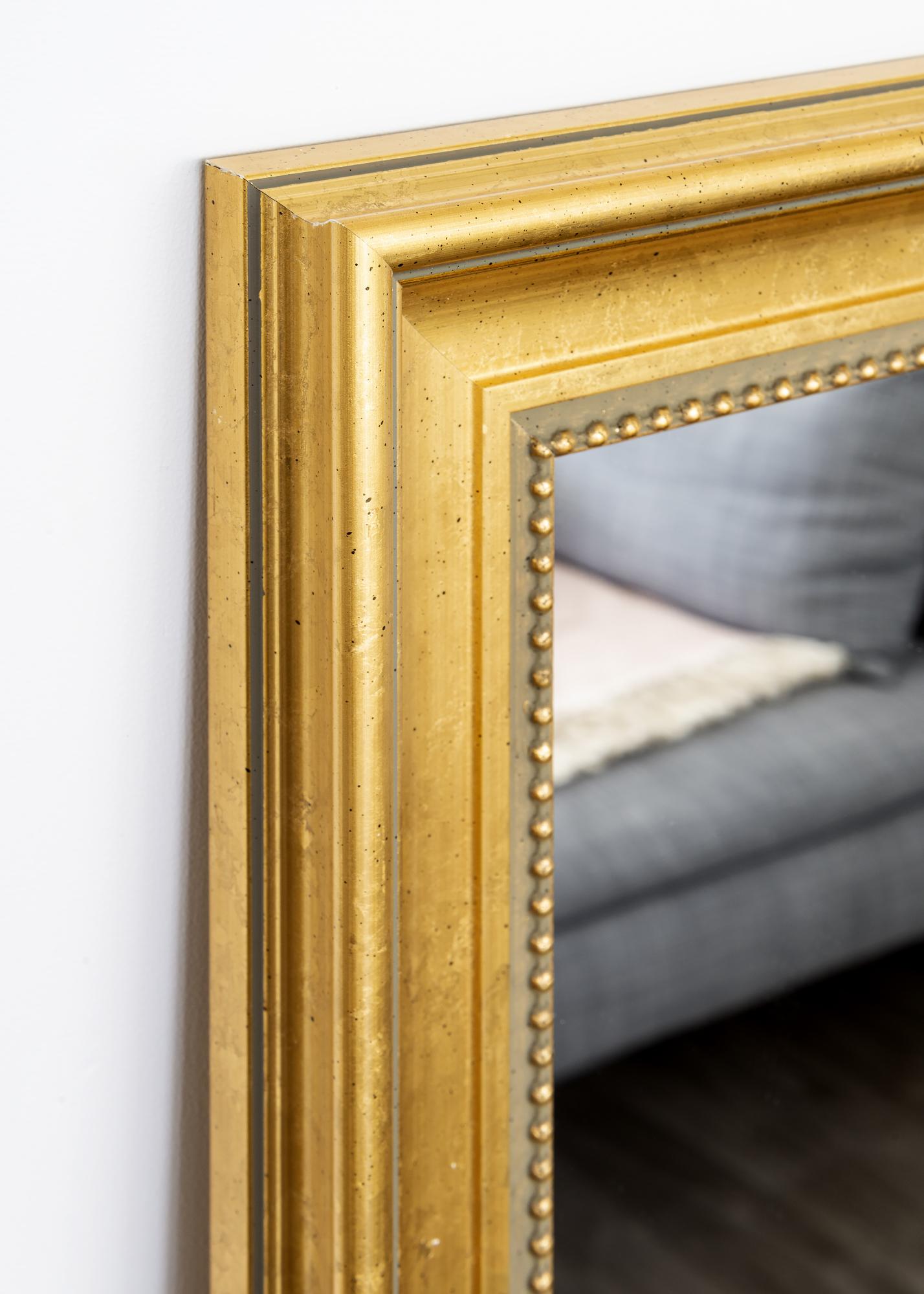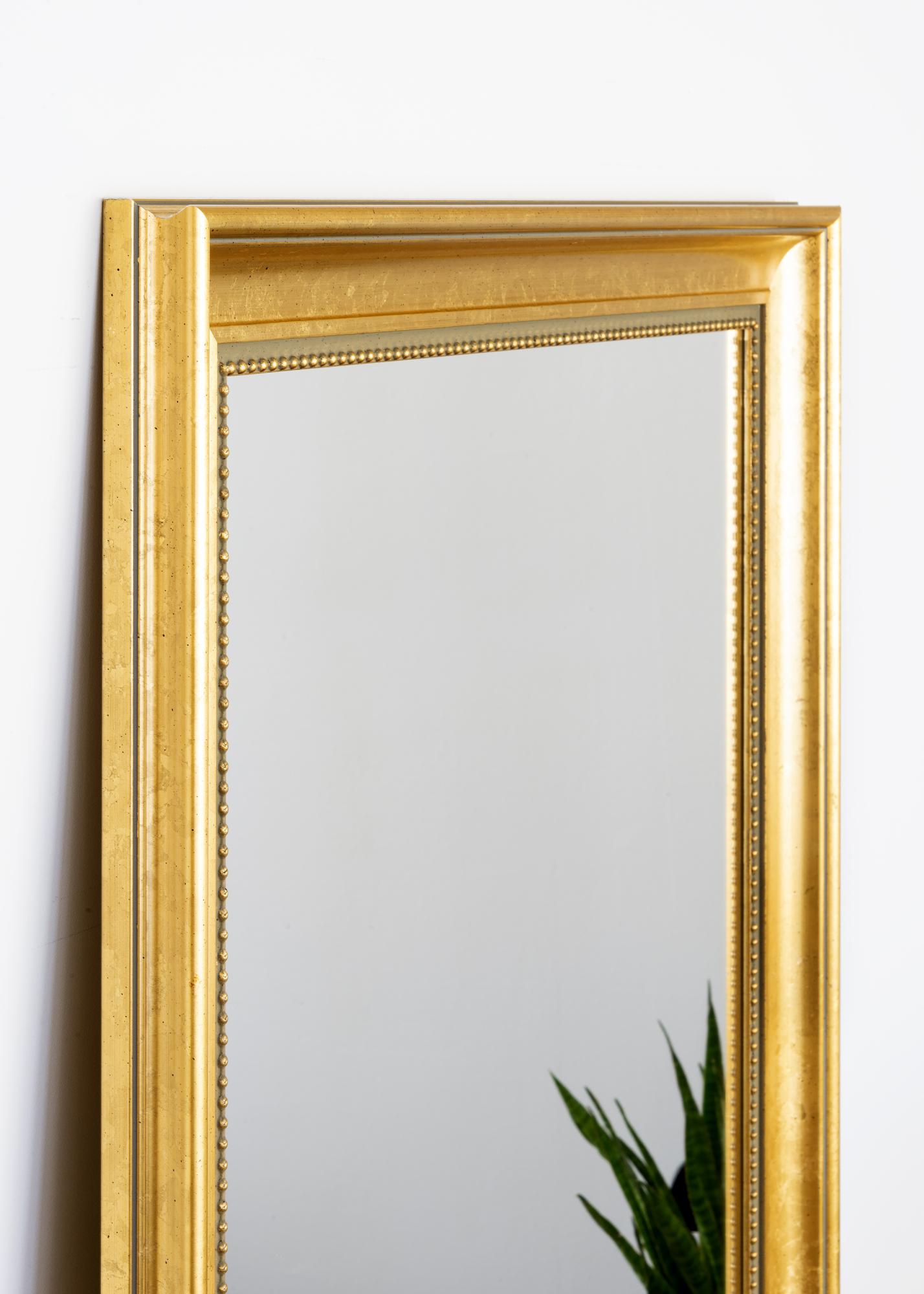 Zakup eleganckie lustro i spraw, by wnętrze korytarza, salonu lub łazienki stało się bardziej luksusowe. To stylowe lustro jest dostępne w różnych rozmiarach, więc łatwo znajdziesz takie, które będzie odpowiadać Twoim potrzebom. Rama lustra ma klasyczny design z szeroką ramą i subtelnym wzorem perełek blisko szkła. Drewno pochodzi z zrównoważonego leśnictwa i jest pomalowane na piękny odcień złota.