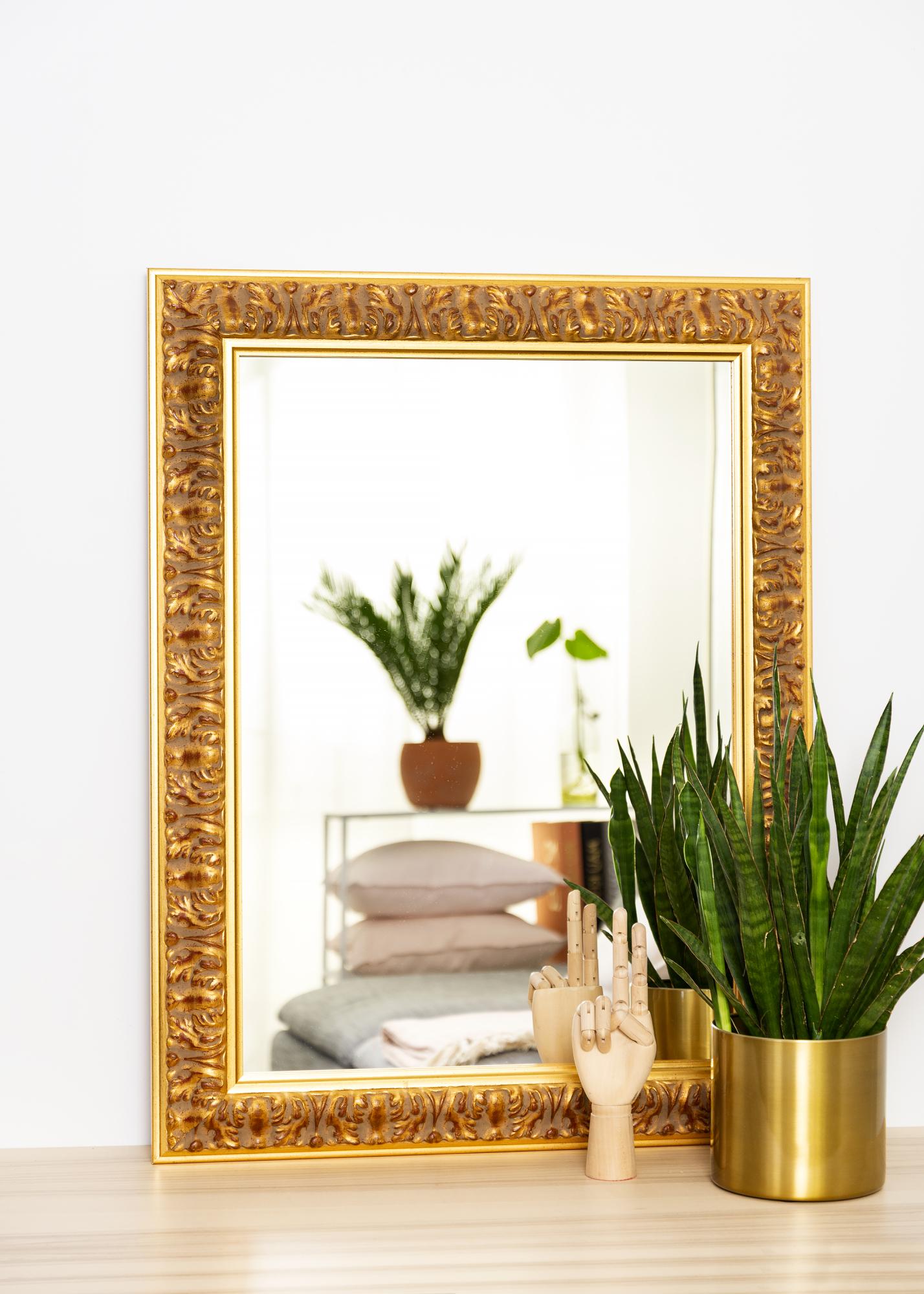 Nadaj swojemu domowi luksusowy wygląd dzięki dekoracjom przywodzącym na myśl barok. To lustro jest wykonane z wysokiej jakości materiałów i posiada wspaniałą ramę w stylu barokowym. Rama jest wykonana z drewna zrównoważonego pochodzenia i jest pomalowana na różne odcienie złota. Bezpośrednio przy szkle biegnie wąska, jasna złota listwa. Dzięki temu, że lustro jest dostępne w 7 różnych rozmiarach, znajdziesz zarówno lustro do toaletki, jak i takie na całą sylwetkę.