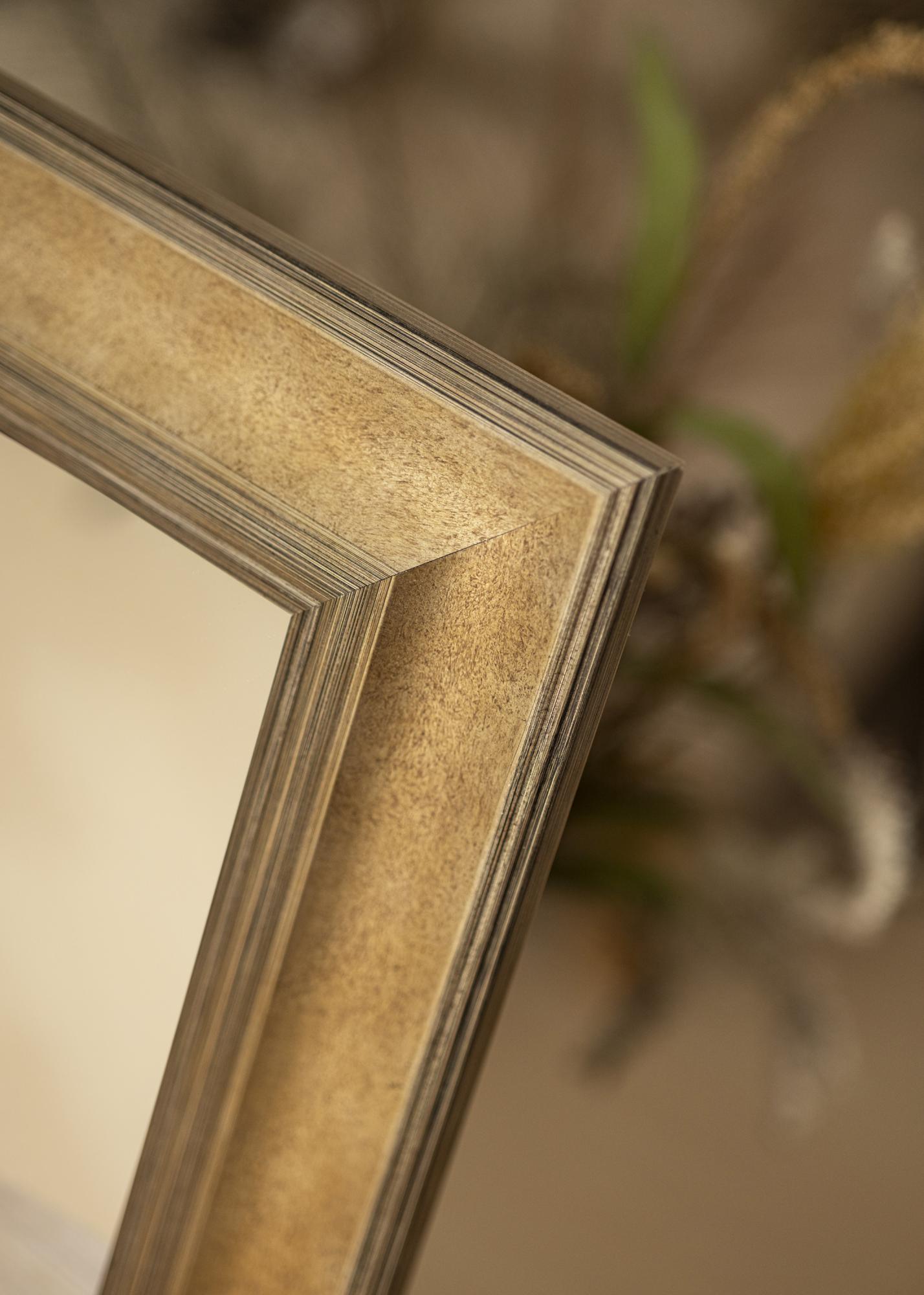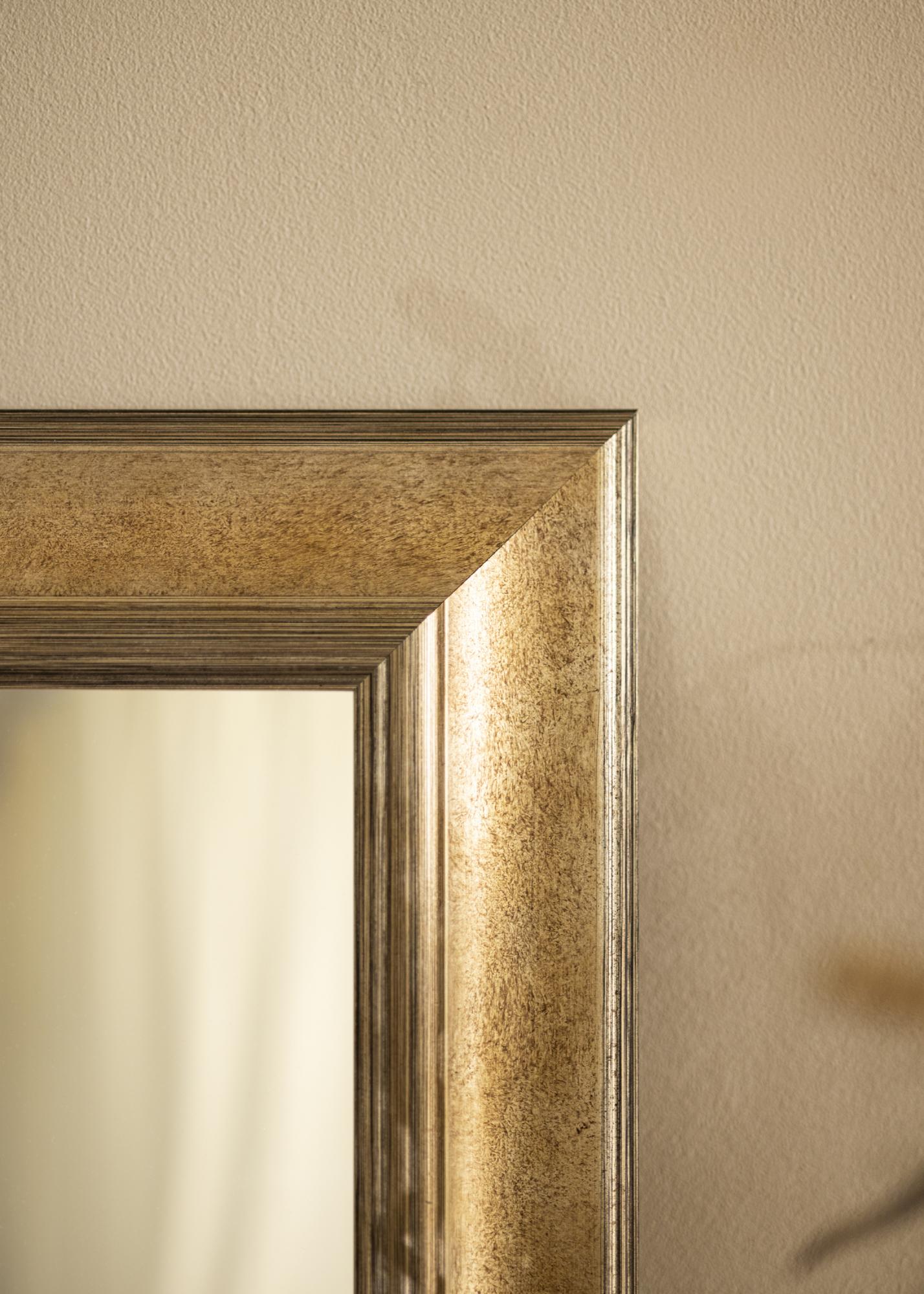 Ciemny srebrzysty odcień lustra nadaje mu klasyczny i ponadczasowy charakter, co ułatwia dopasowanie do różnych stylów wnętrzarskich. Szczotkowana powierzchnia ma subtelne zmiany kolorów, które podkreślają zarówno głębię, jak i strukturę, nadając lustrze unikalny charakter. Cienkie, liniowe dekoracje wzdłuż krawędzi dodają dodatkowego wymiaru elegancji i wyrafinowania.