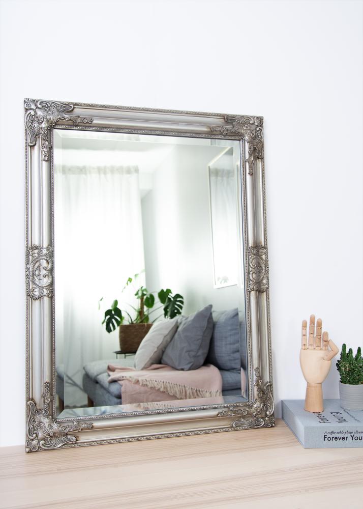 Seria luster Bologna Srebrna posiada łacińskie wzornictwo z bogatym zdobieniem w narożnikach i przy środkach boków ramy. Nieco węższa rama niż w wielu innych lustrach w tym stylu. Rama wykonana jest z drewna, a zdobienia zostały odlane z gipsu przed nałożeniem na ramę.