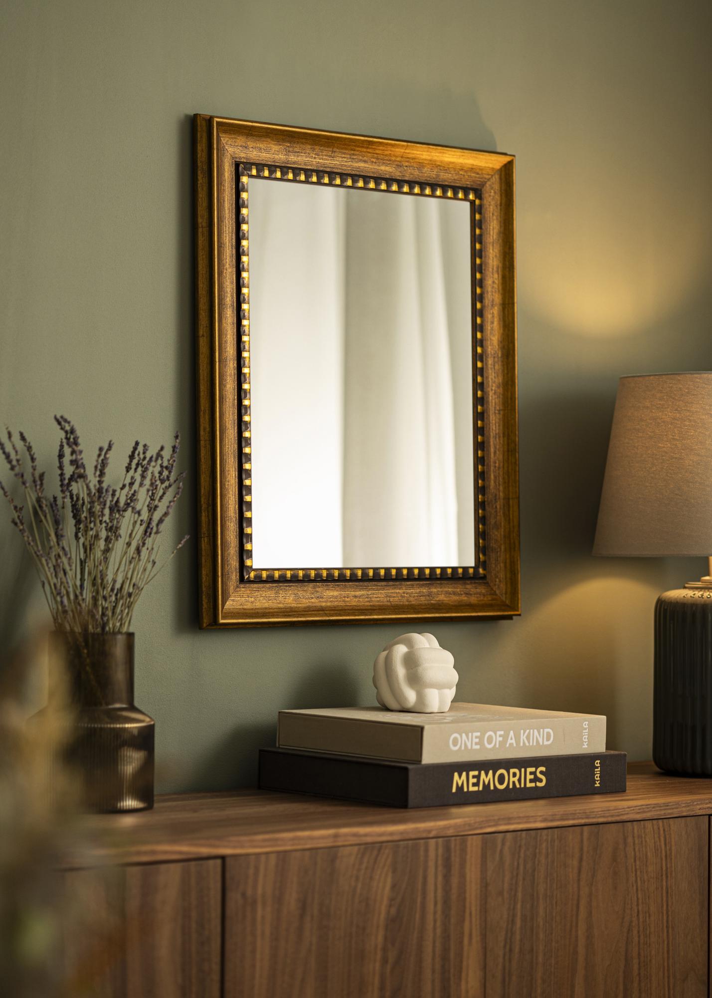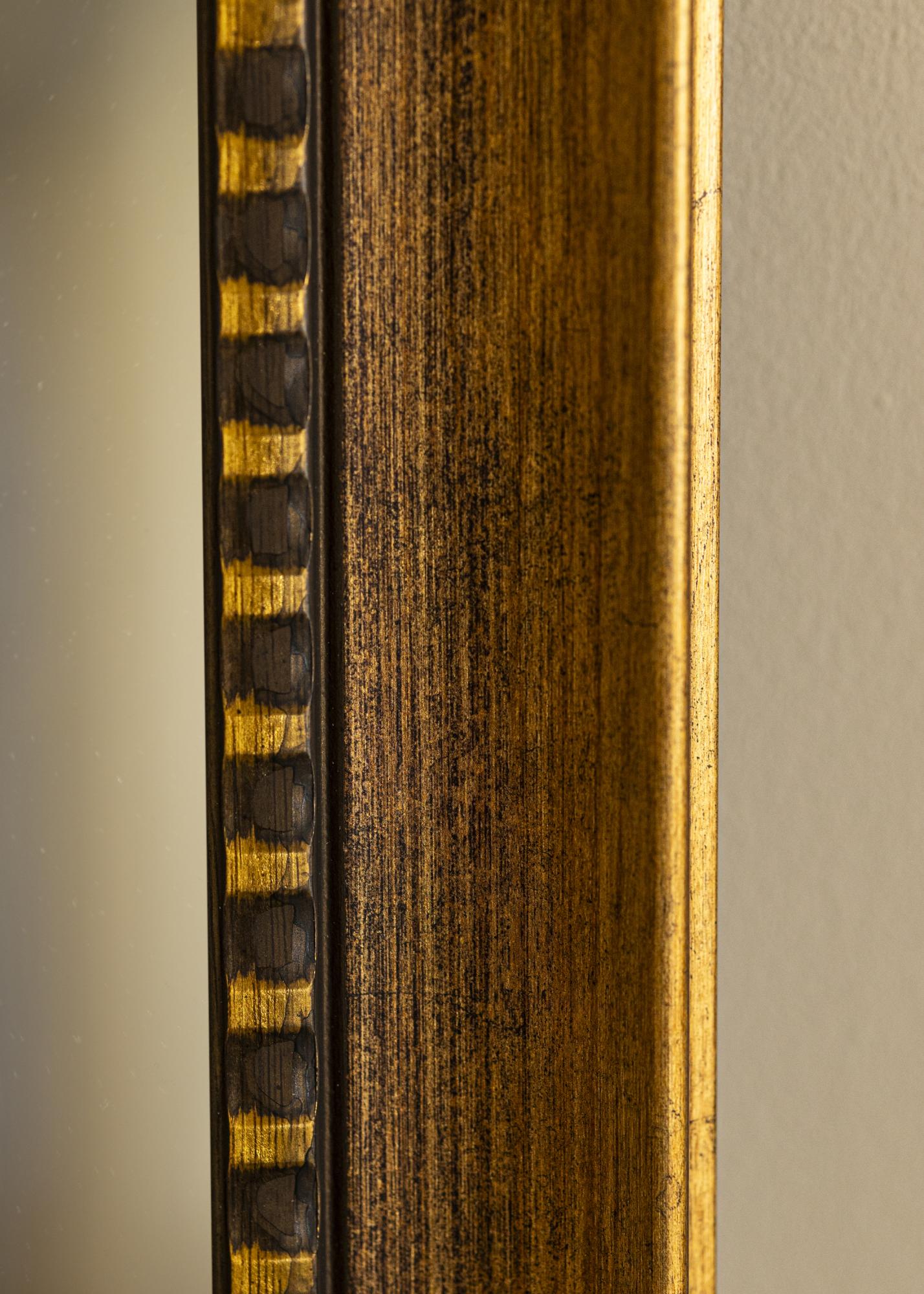 To lustro ma ciepły brązowy kolor z eleganckim antycznym wykończeniem, które nadaje pomieszczeniu ponadczasowy urok. Szeroki profil ma subtelny połysk i jest ozdobiony wyraźną prążkowaną detalą w złocie i czerni wzdłuż wewnętrznej krawędzi. Tworzy to piękny kontrast i przyciąga wzrok do centralnego punktu lustra.