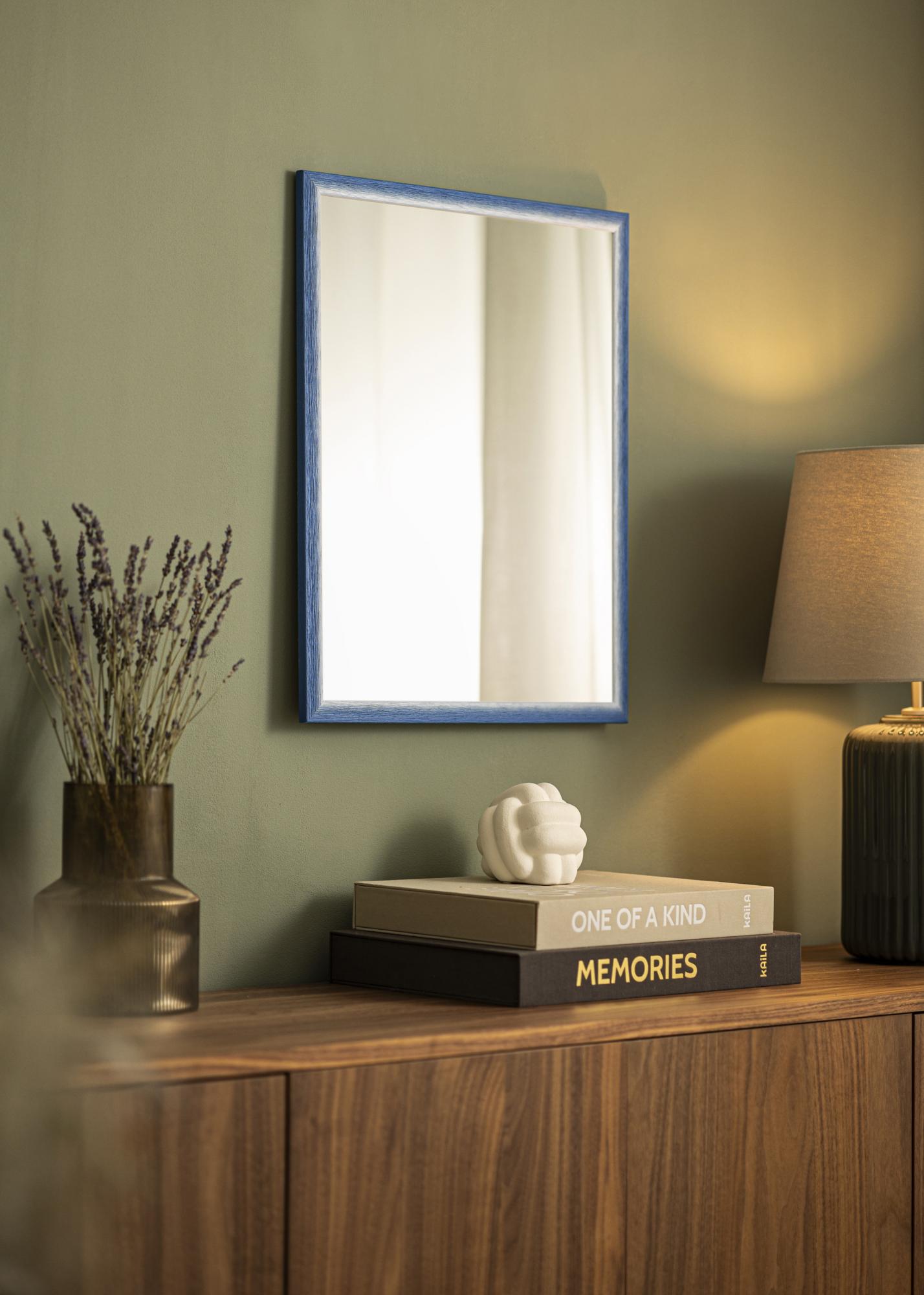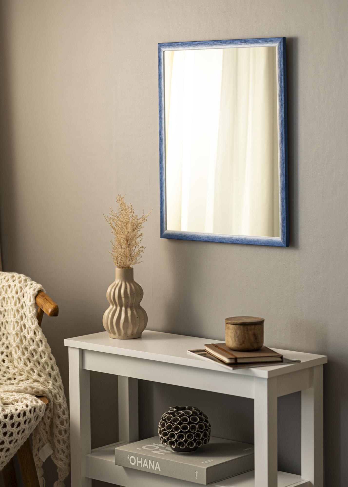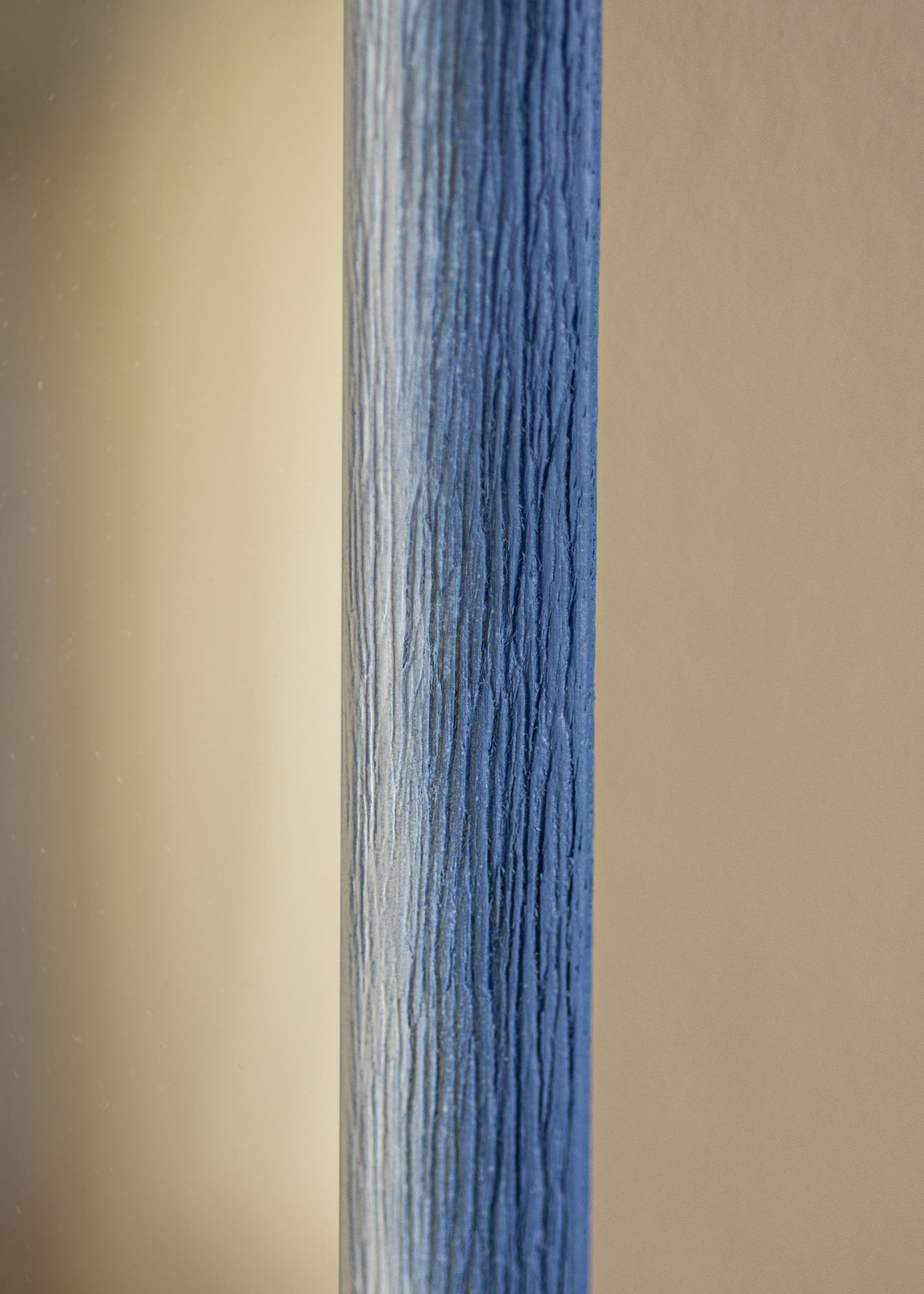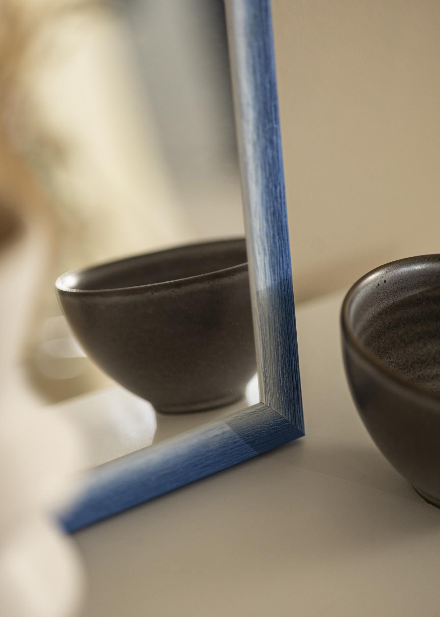 To lustro posiada żywą paletę kolorów, która zmienia się od jasnej, niemal białej tonacji do głębszego niebieskiego. Ta różnorodność kolorów nadaje lusteru dynamiczny wygląd, który może się zmieniać w zależności od światła w pomieszczeniu. Powierzchnia ma wyraźną strukturę drewna z pionowymi słojami, co daje naturalne i dotykowe odczucie. Przejścia między różnymi odcieniami są łagodne i dają ramie malowany ręcznie, unikalny wyraz.