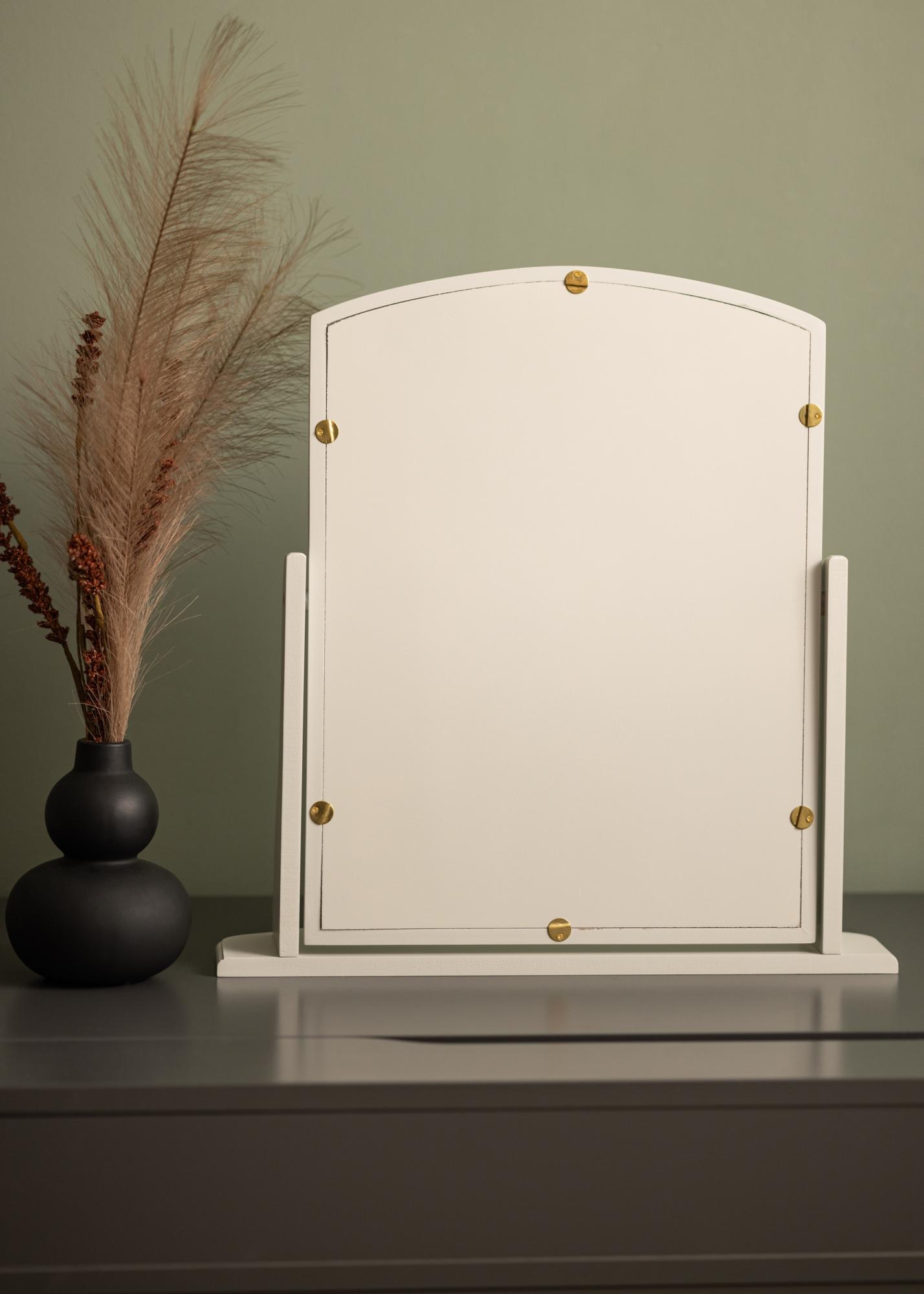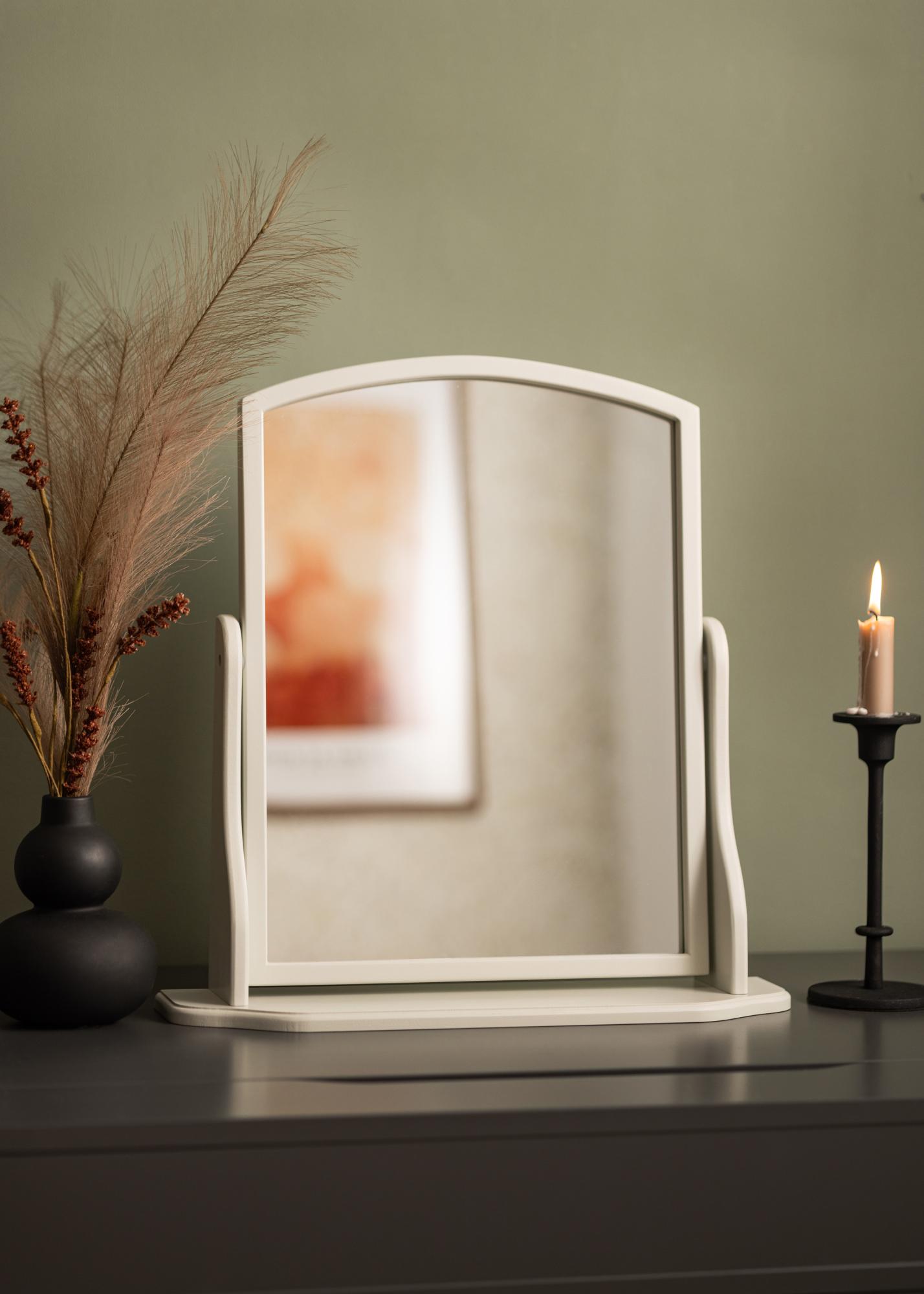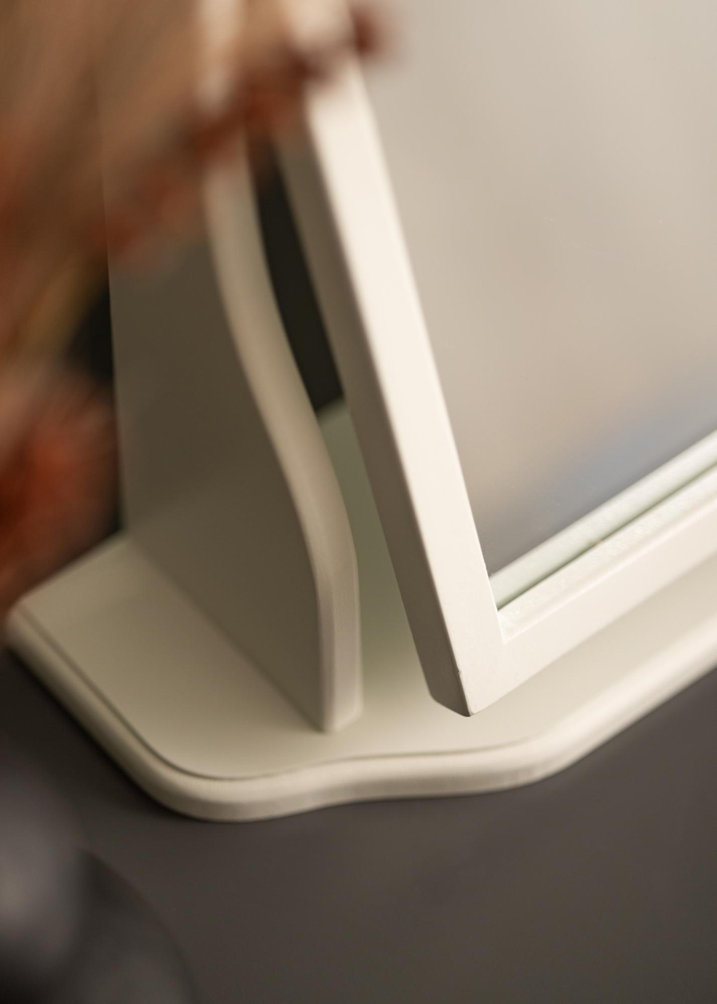 To lustro jest zaprojektowane z szarą ramką, która dodaje subtelny i wyrafinowany akcent do pokoju. Stoi stabilnie na solidnej podstawie, co czyni go idealnym do użycia na stole lub komodzie, gdzie przygotowujesz się na dzień lub wieczór.