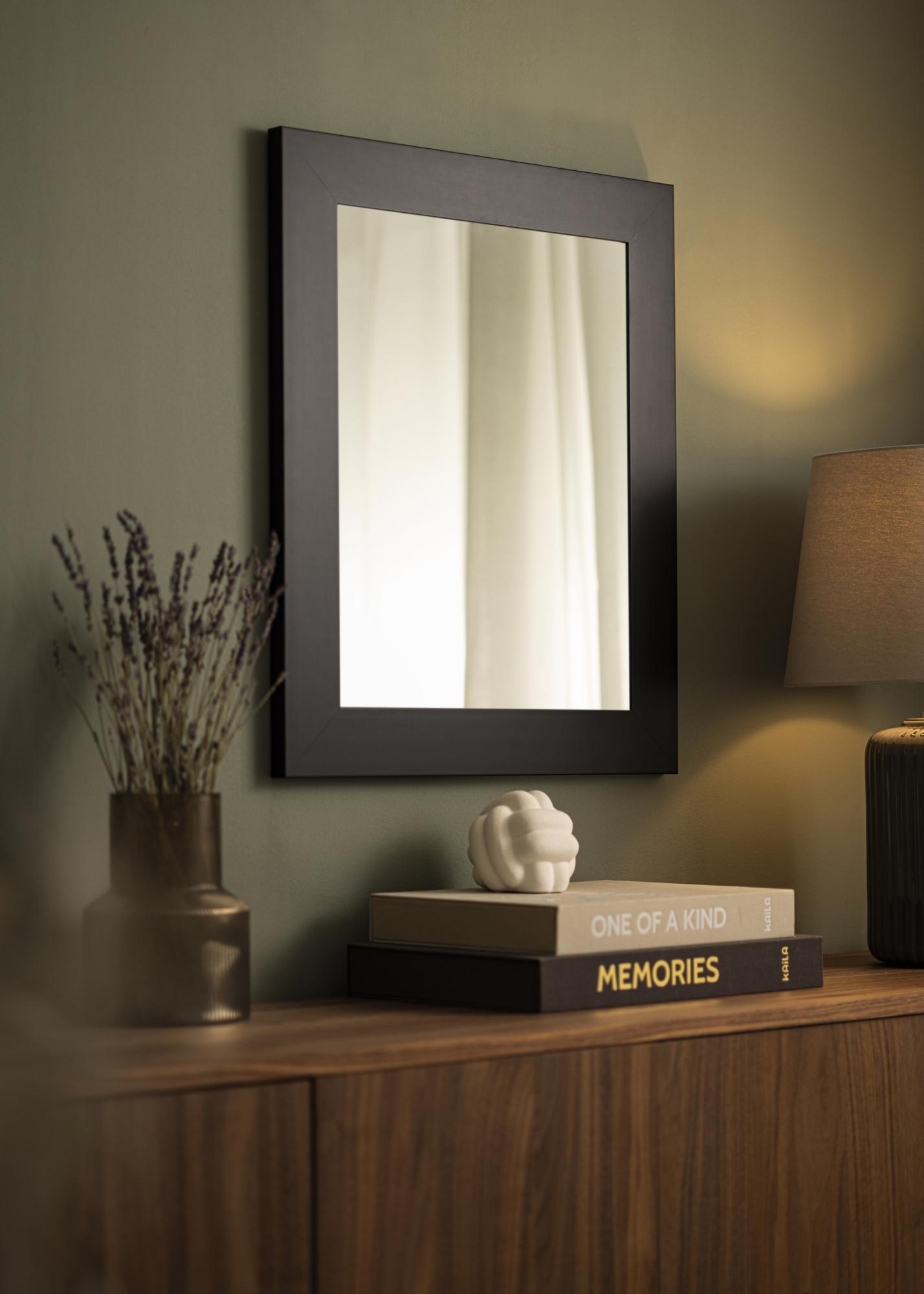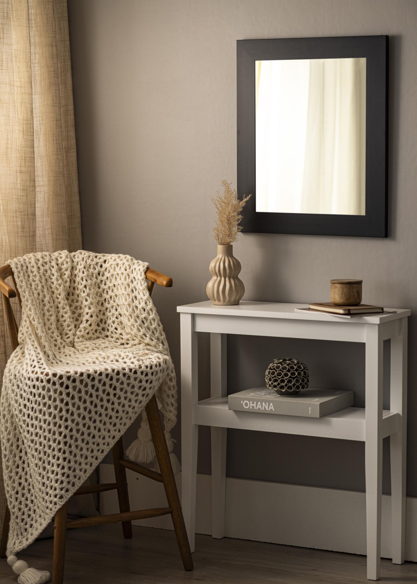 To lustro ma elegancki czarny kolor, który nadaje nowoczesny i stylowy wygląd. 69 mm szeroka rama z matowego czarnego drewna Ayos przyczynia się do wyrafinowanego wyglądu lustra i sprawia, że jest doskonałym uzupełnieniem zarówno klasycznych, jak i nowoczesnych stylów wnętrzarskich. Z głębokością 22 mm, lustro posiada solidną konstrukcję, która zapewnia jego trwałość i stabilność.