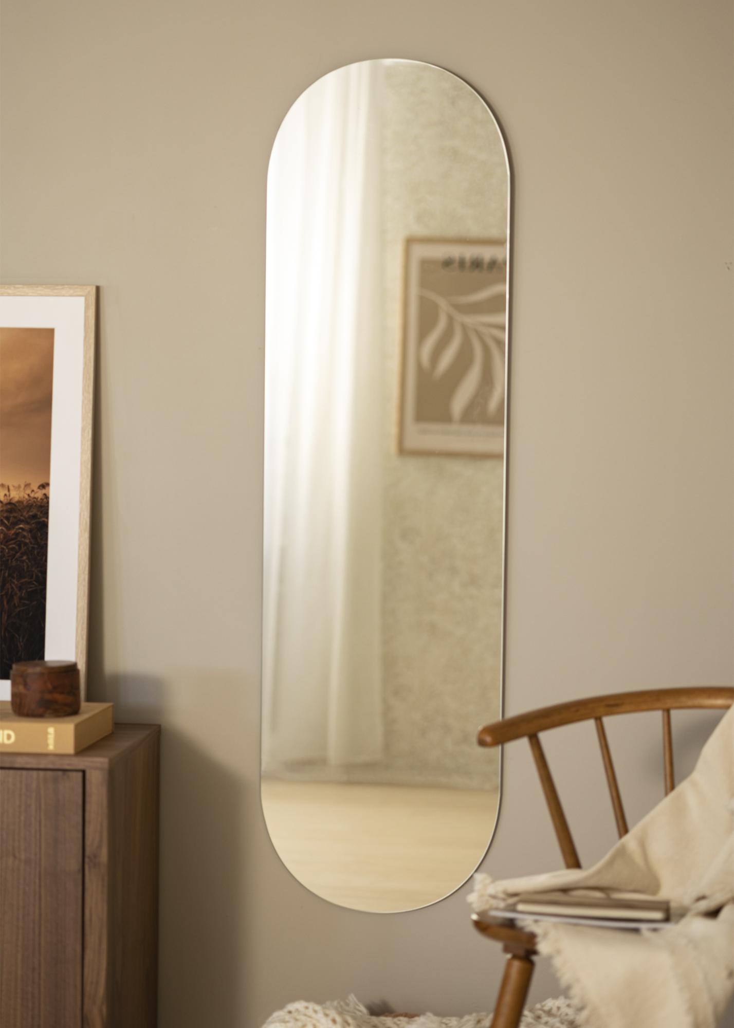 Odkryj eleganckie i wszechstronne lustro ścienne, które zostało zaprojektowane, aby uzupełniać każde pomieszczenie w Twoim domu. Dzięki swoim hojnym wymiarom 40x140 cm, to lustro oferuje praktyczną i dekoracyjną funkcję w Twojej przestrzeni. Jego organiczny i podłużny kształt z zaokrąglonymi krawędziami i miękkim wygięciem u góry nadaje nowoczesny i delikatny wygląd, który wtapia się w różne style wnętrzarskie.