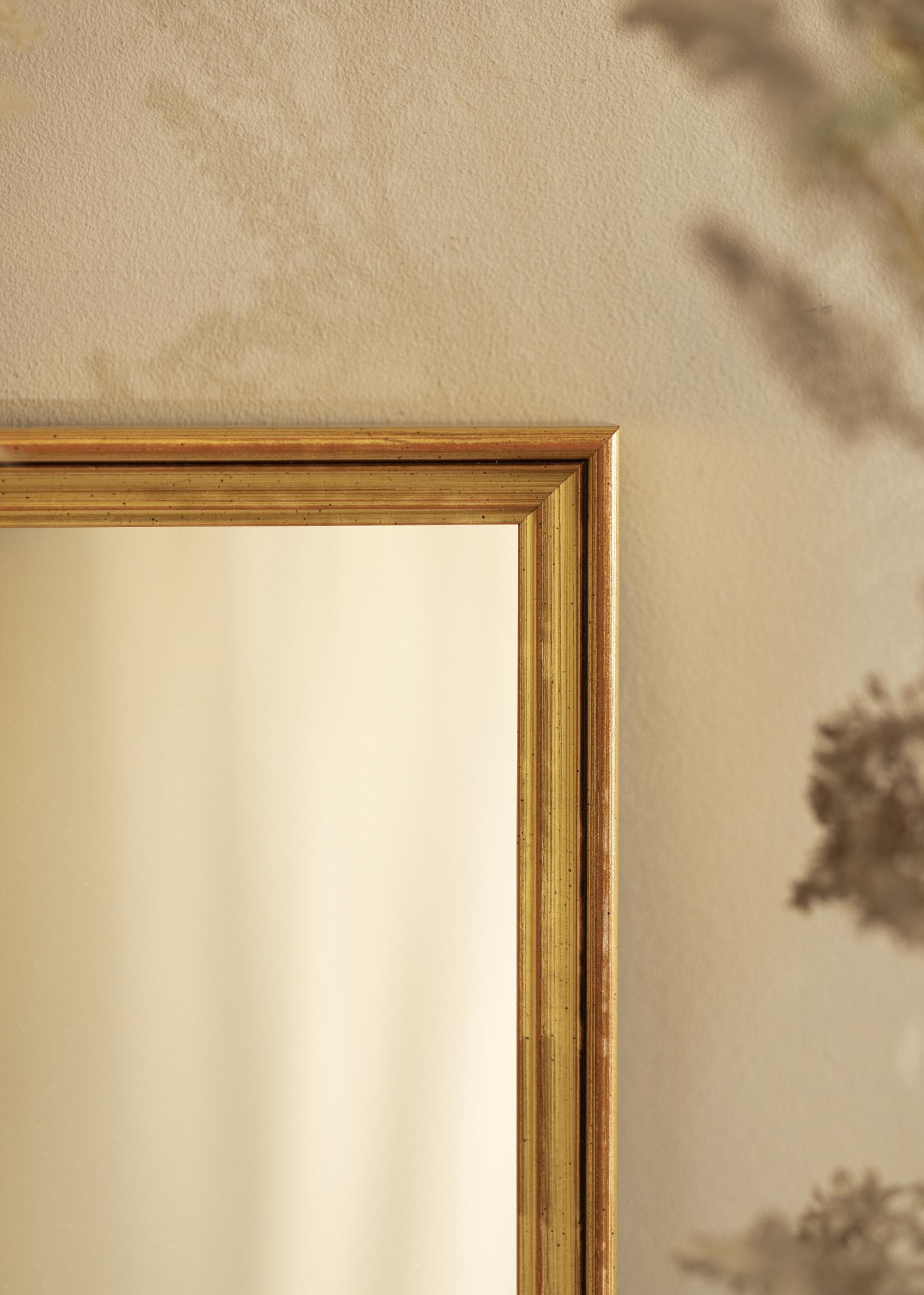 To lustro ma głębokość 39 mm, co nadaje mu solidność, nie będąc przy tym zbyt ciężkim czy dominującym. Wykonane z sosny, łączy trwałość z lekkością, co sprawia, że jest łatwe do zawieszenia na ścianie. Złota powierzchnia ma delikatne antyczne wykończenie z małymi ciemnymi detalami, co tworzy ponadczasowy charakter pasujący zarówno do nowoczesnych, jak i klasycznych stylów wnętrz.