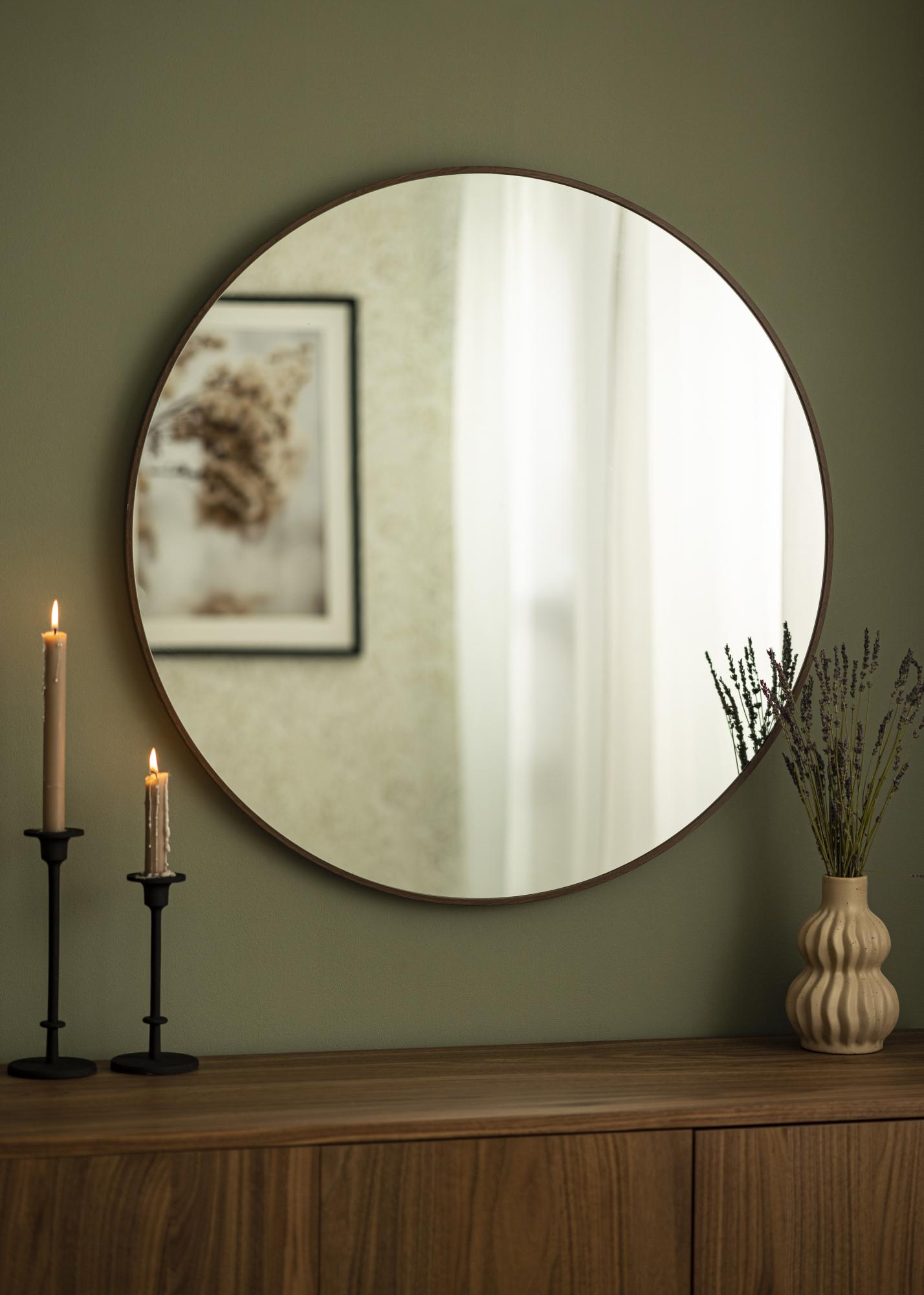 Odkryj elegancję i styl dzięki naszej ściennej lustrze, idealnej do dodania poczucia przestrzeni i światła w Twoim domu. Z imponującą średnicą 80 cm, to lustro stanie się natychmiastowym punktem centralnym w każdym pomieszczeniu. Jego okrągły kształt nadaje miękkie i przyjemne wrażenie, podczas gdy rama z aluminium w kolorze orzecha włoskiego dodaje odrobinę wyrafinowania.