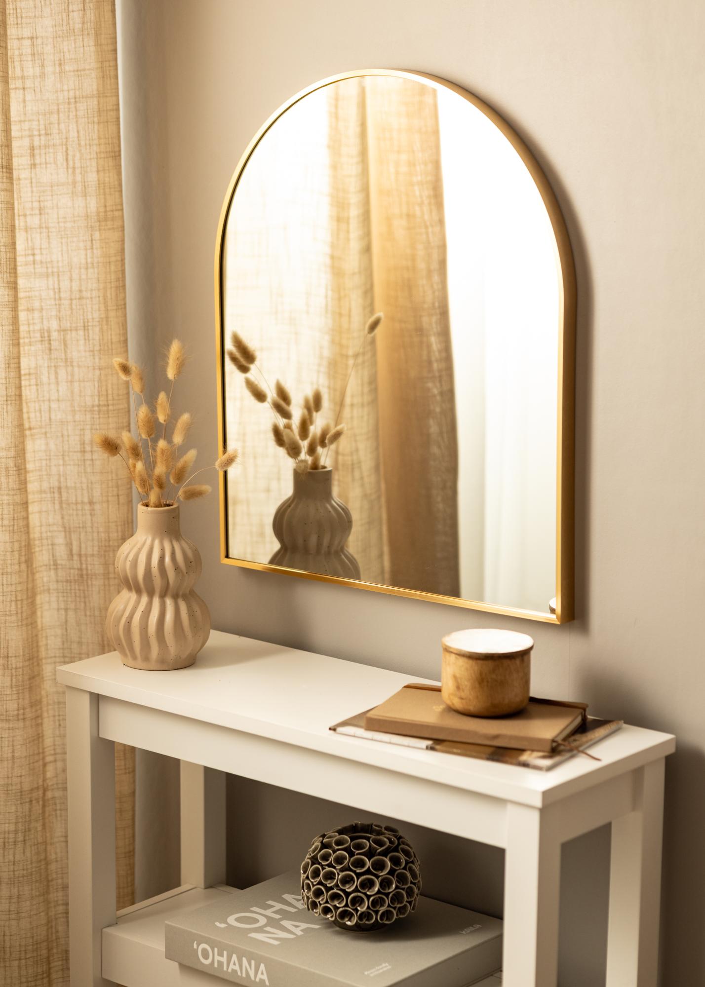 To nowoczesne lustro ścienne, które można używać w każdym pomieszczeniu. Możesz uczynić je modnym elementem sypialni lub salonu, albo używać jako lustro łazienkowe lub lustro do przedpokoju, aby właściwie się przejrzeć, przygotowując się na dzień. Lustro ma 28 mm głęboką ramę z metalu, z ekskluzywnym złotym odcieniem, który nadaje mu doskonałą elegancję. Stylowy, inspirowany łukiem kształt dodatkowo podkreśla luksusowy wygląd.