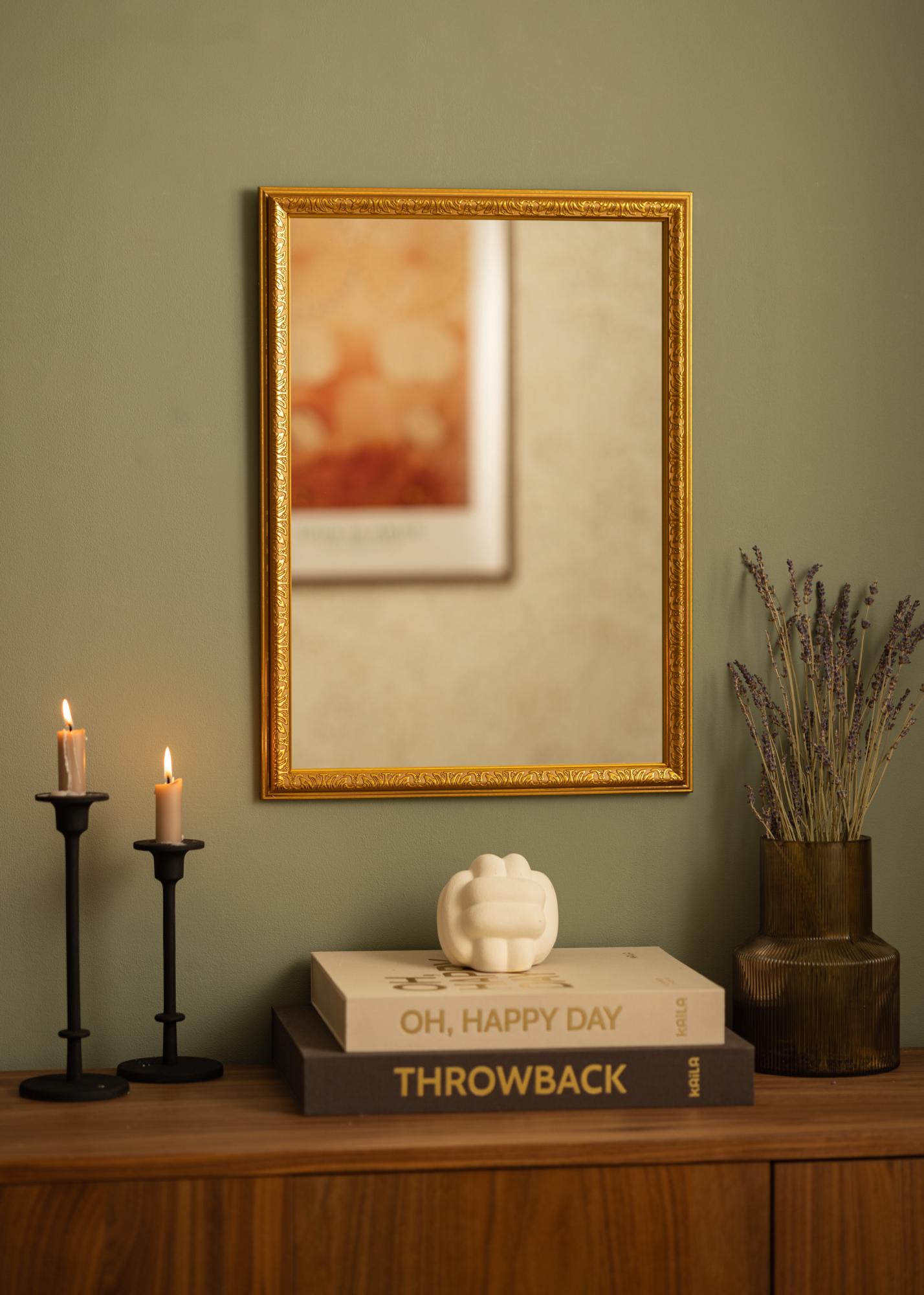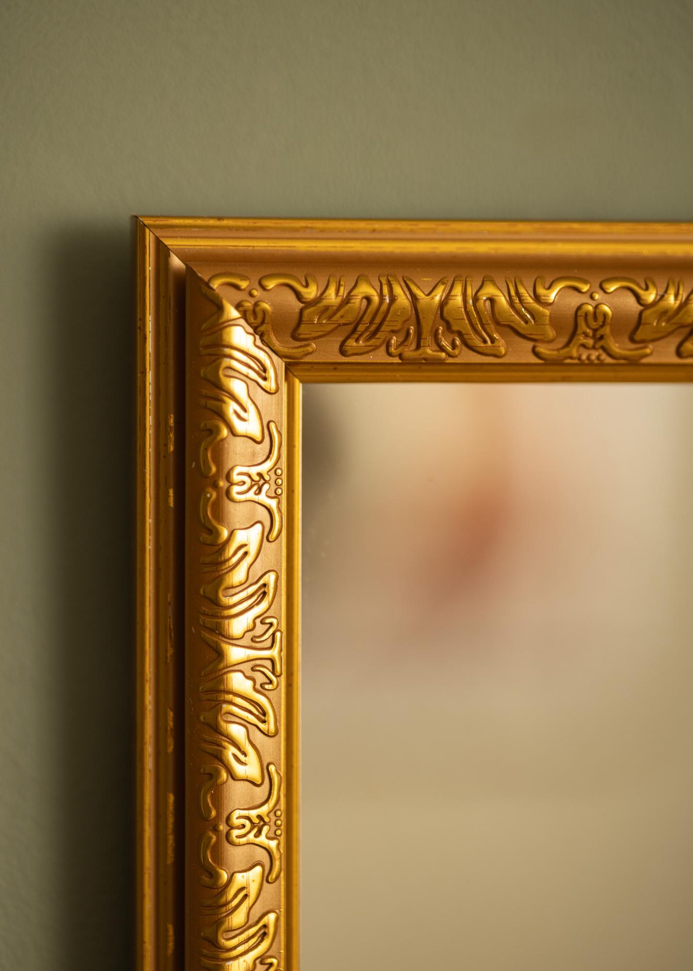 Czy szukasz luksusowego lustra o złotym kolorze? Już nie musisz szukać dalej. Nostalgia Złoto to lustro ścienne z ramą o szerokości 2,8 cm z eleganckim profilem i pięknym dekoracyjnym wzorem. Szkło lustra będzie odbijać światło w twoim pokoju, jednocześnie samo lustro stanie się stylowym detalem na twojej ścianie. Na tylnej stronie znajduje się uchwyt do łatwiejszego zamocowania na ścianie.