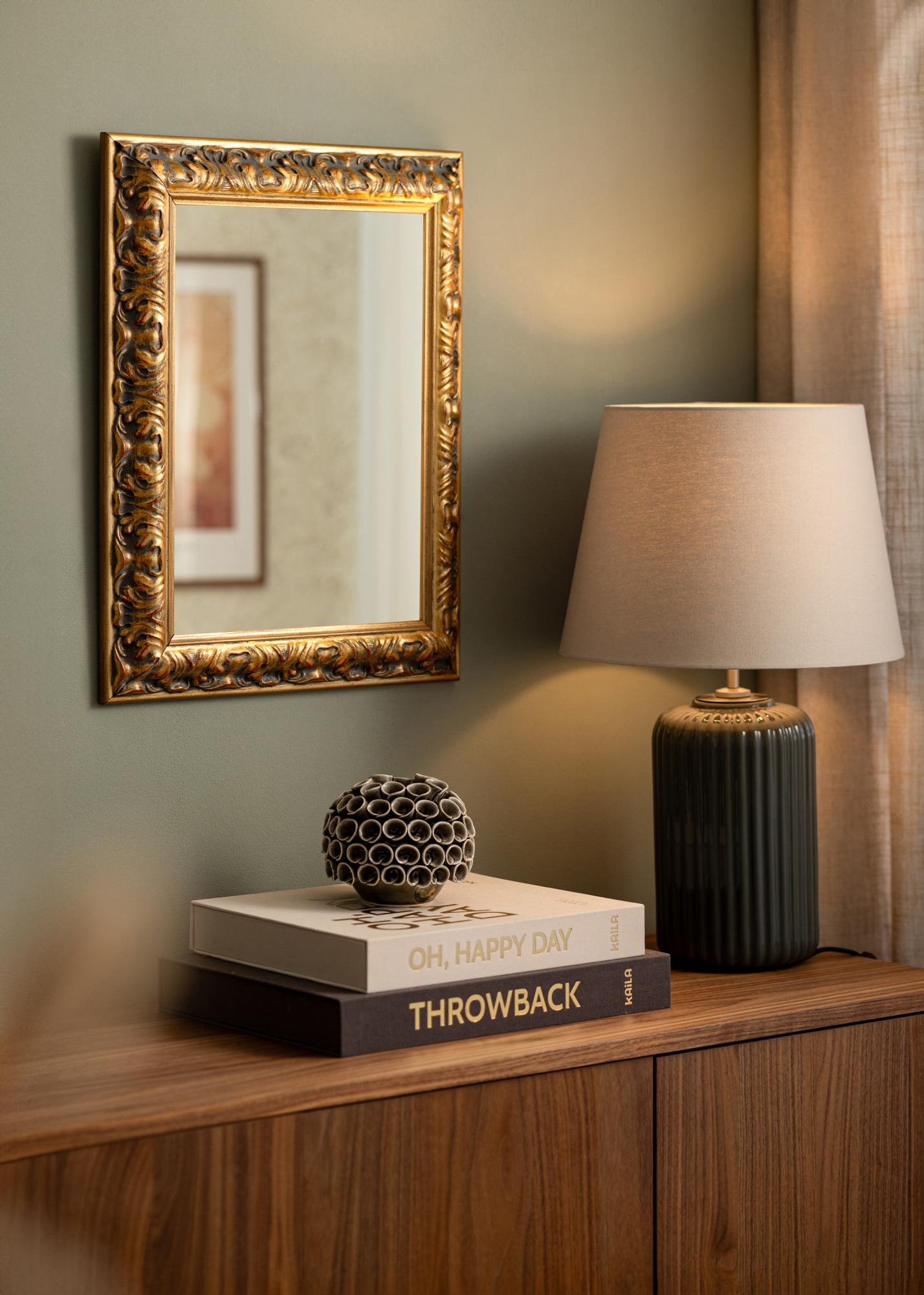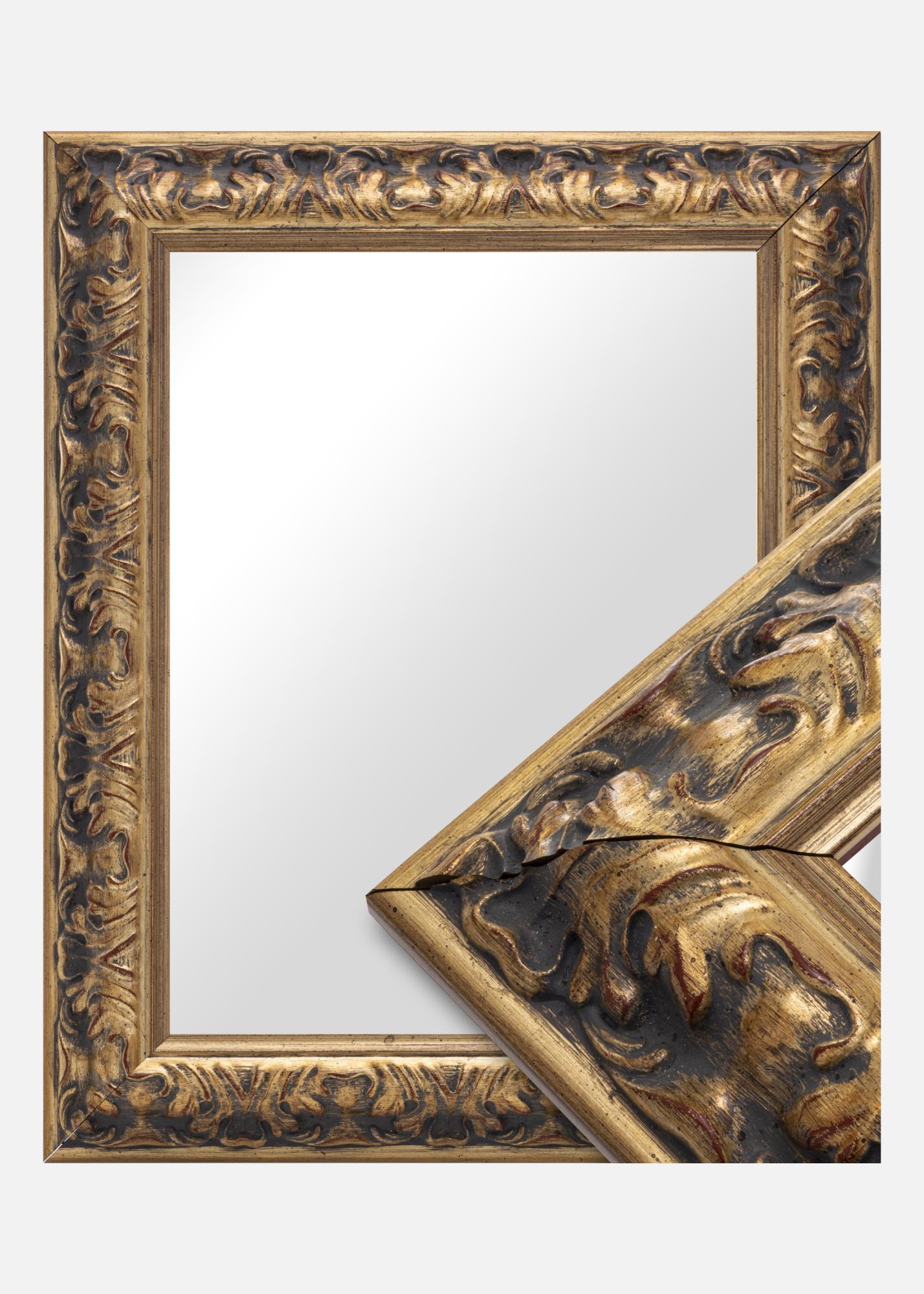 Lustro Odin Złote/Czerwone to eleganckie i stylowe lustro produkowane na wymiar. Z ozdobną, złotą ramą i antyczną patyną stanowi przyciągający wzrok element w każdym pomieszczeniu. Rama, która ma 64 mm szerokości i 38,5 mm głębokości, wykonana jest z sosny i ozdobiona detalami w stylu barokowym. Rzeźbione wzory w reliefie nadają lustru unikalny charakter i są podkreślone subtelną kontrastem między złotem a ciemnymi akcentami.