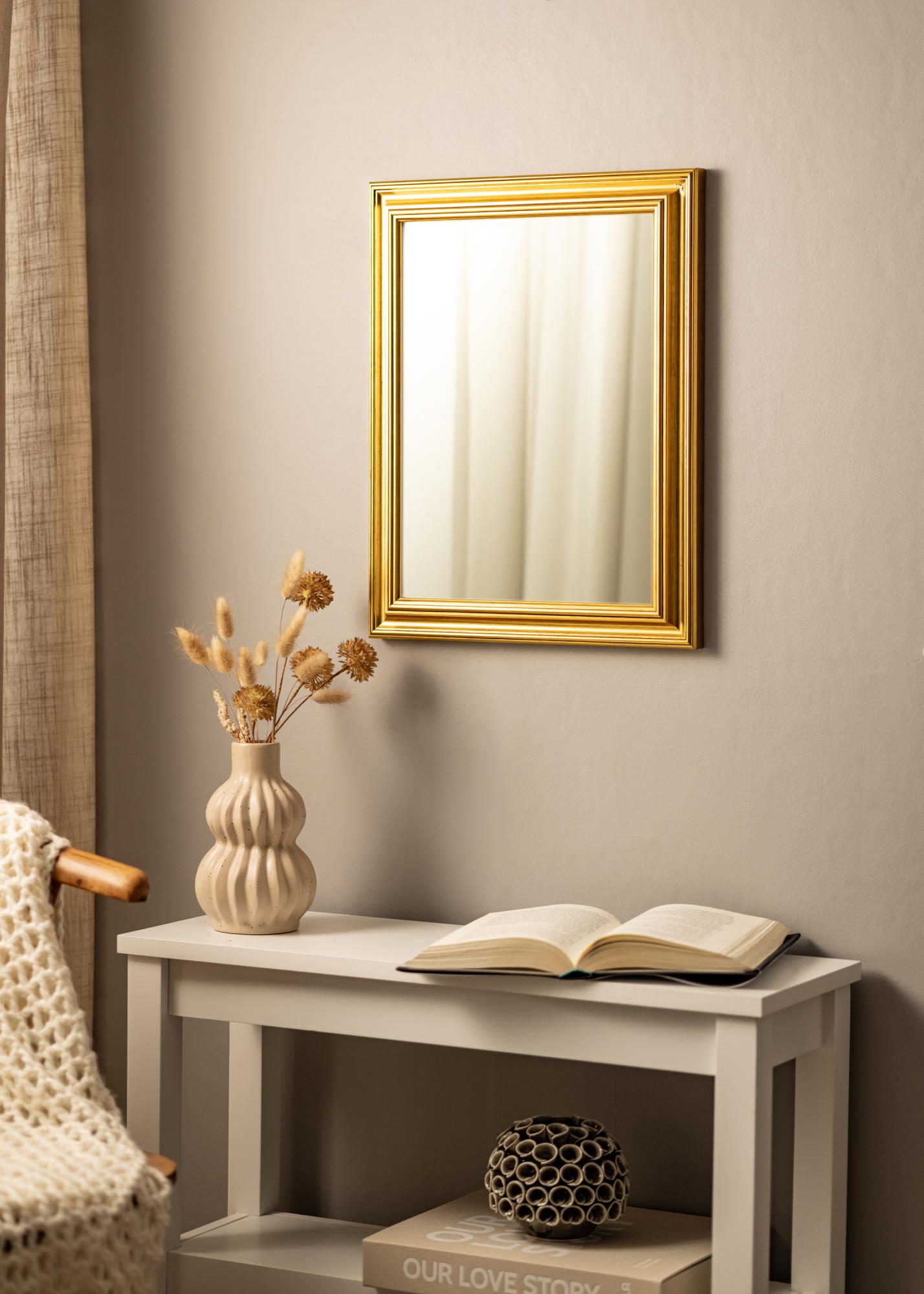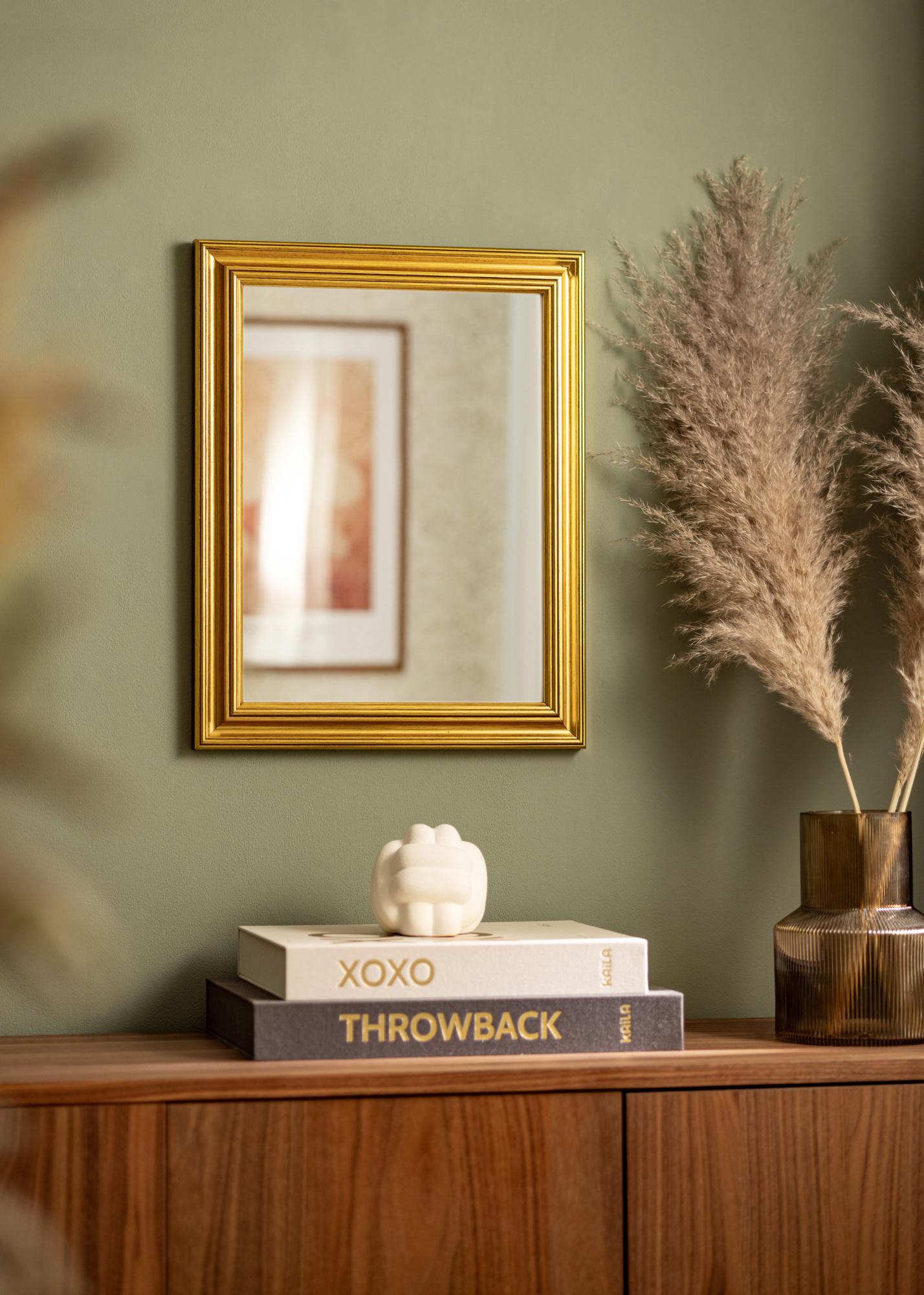 Klasyczne profilowane lustro w kolorze złota z ramą z drewna, które wygląda na ręcznie malowaną, co nadaje lustrze żywy wygląd i piękny blask. Szeroka listwa ramy nadaje lustrze ekskluzywny wygląd i sprawia, że pasuje zarówno do domu urządzonego w stylu antycznym, jak i do nowoczesnego domu z romantycznym lub eleganckim wystrojem. Połącz lustro z parą mosiężnych kinkietów i obrazów w złotych ramach, aby stworzyć spójną atmosferę w pomieszczeniu.