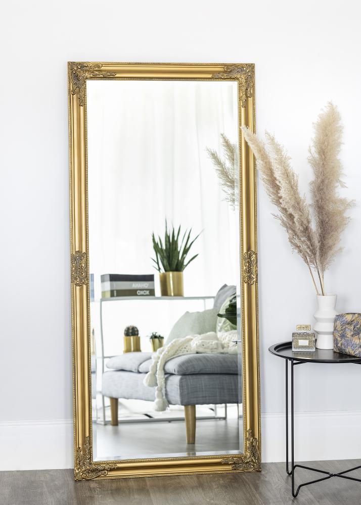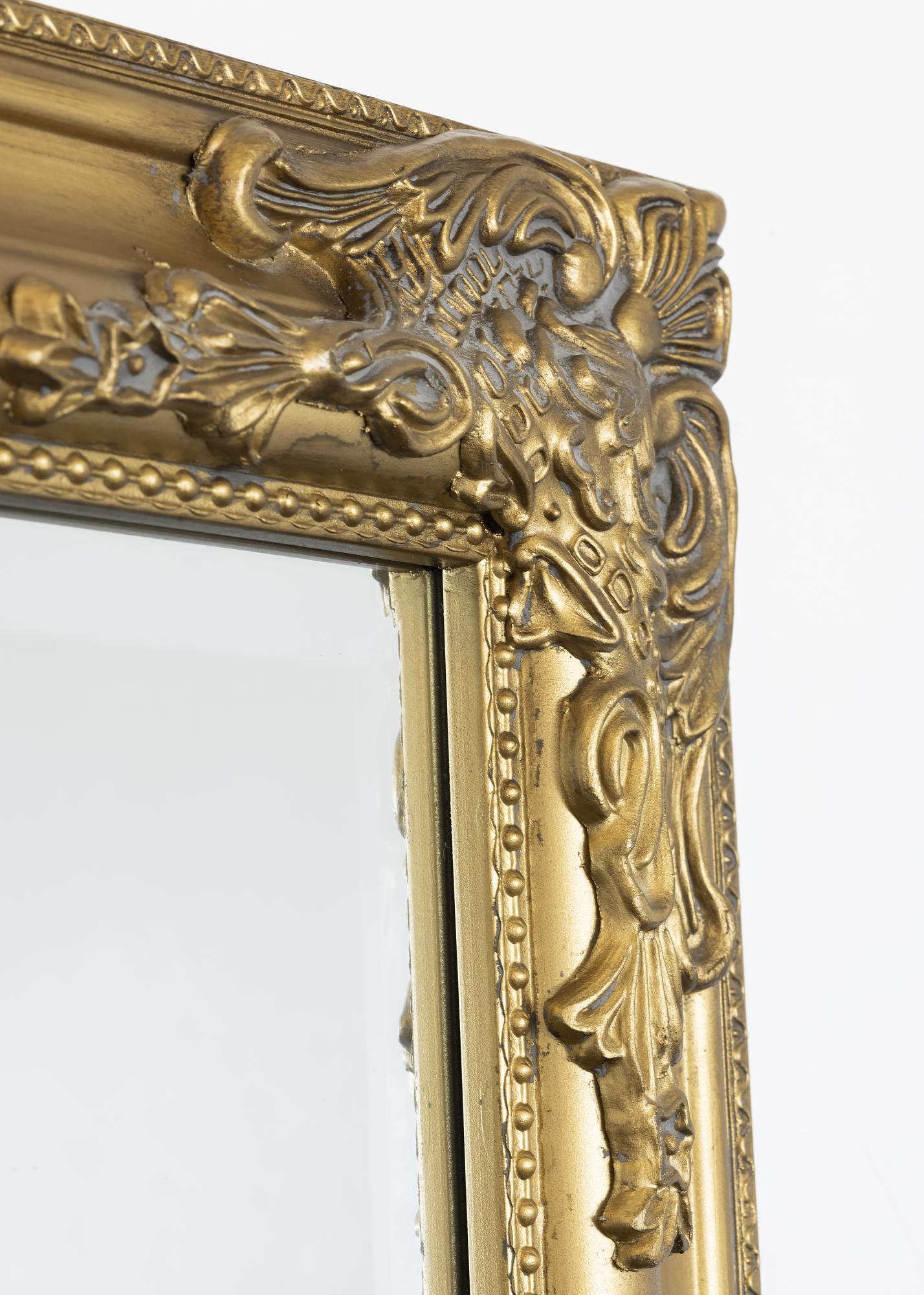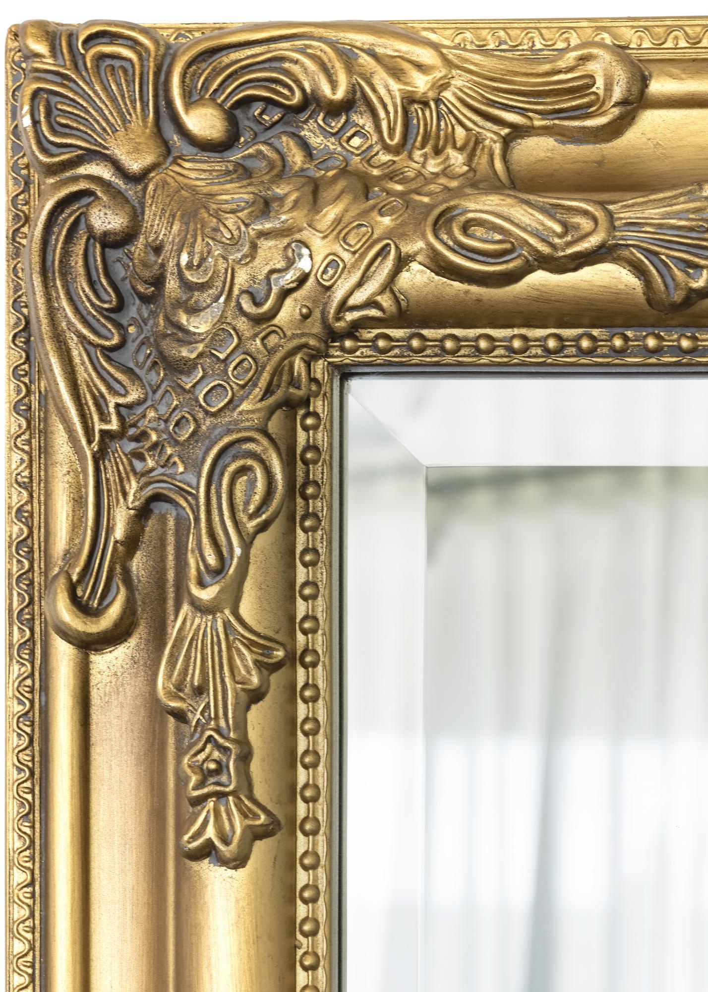 Lustro z pięknym profilem w złotym kolorze, z antycznym wrażeniem, ozdobione kwiatowymi ornamentami. Klasyczny styl ramy lustra sprawia, że pasuje do stylów wnętrz z starszymi meblami, ale można go również użyć do stworzenia ciekawego kontrastu w nowoczesnym, minimalistycznym wnętrzu. Lustro będzie się pięknie prezentować zarówno w korytarzu, sypialni, jak i w garderobie, podkreślone w piękny sposób wraz z akcesoriami dekoracyjnymi w odcieniach mosiądzu lub złota.