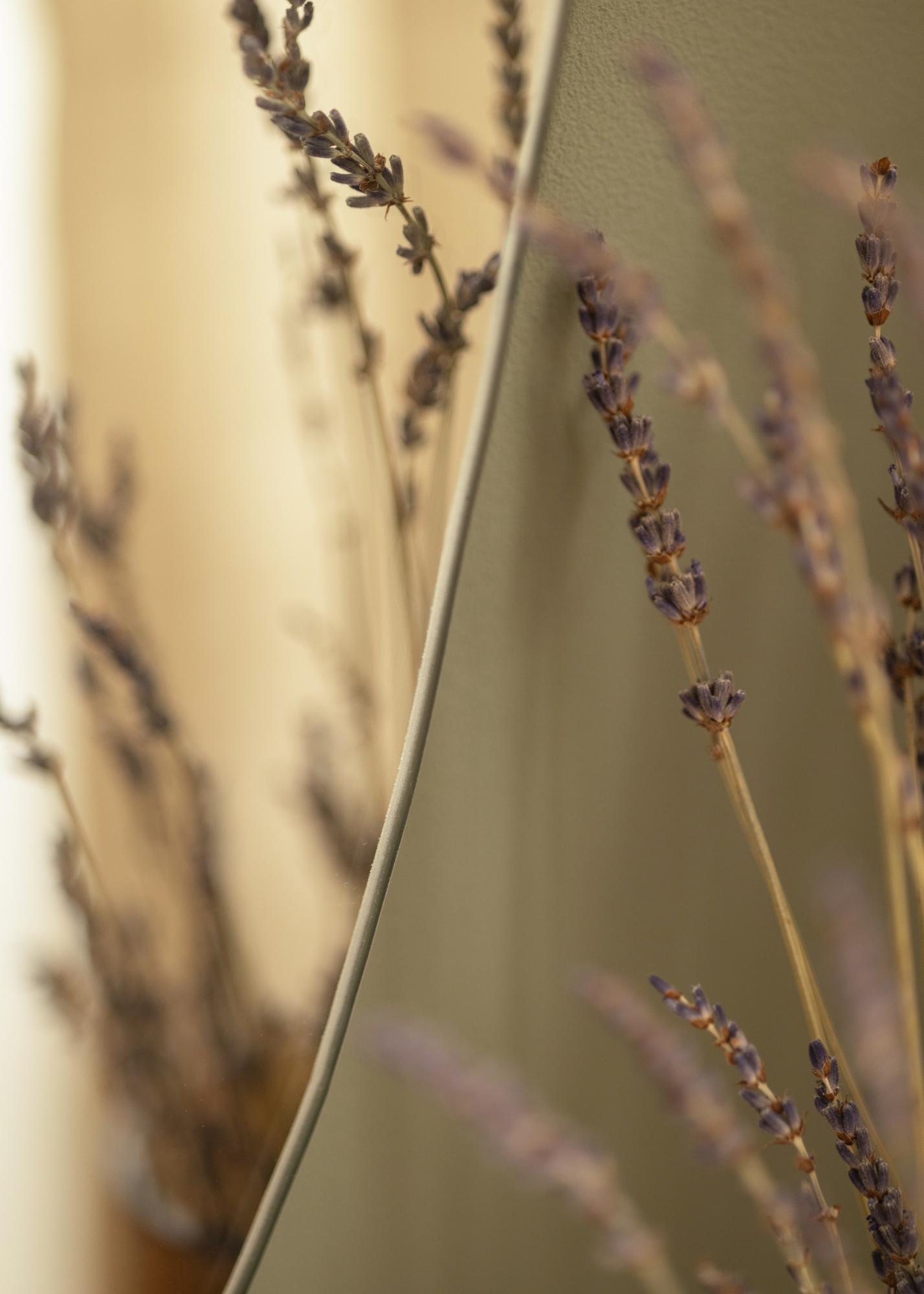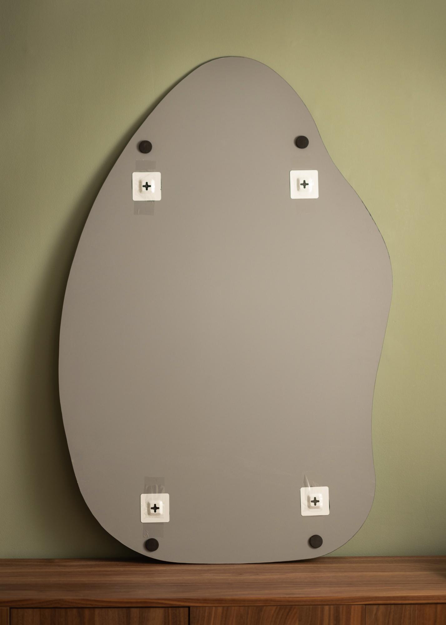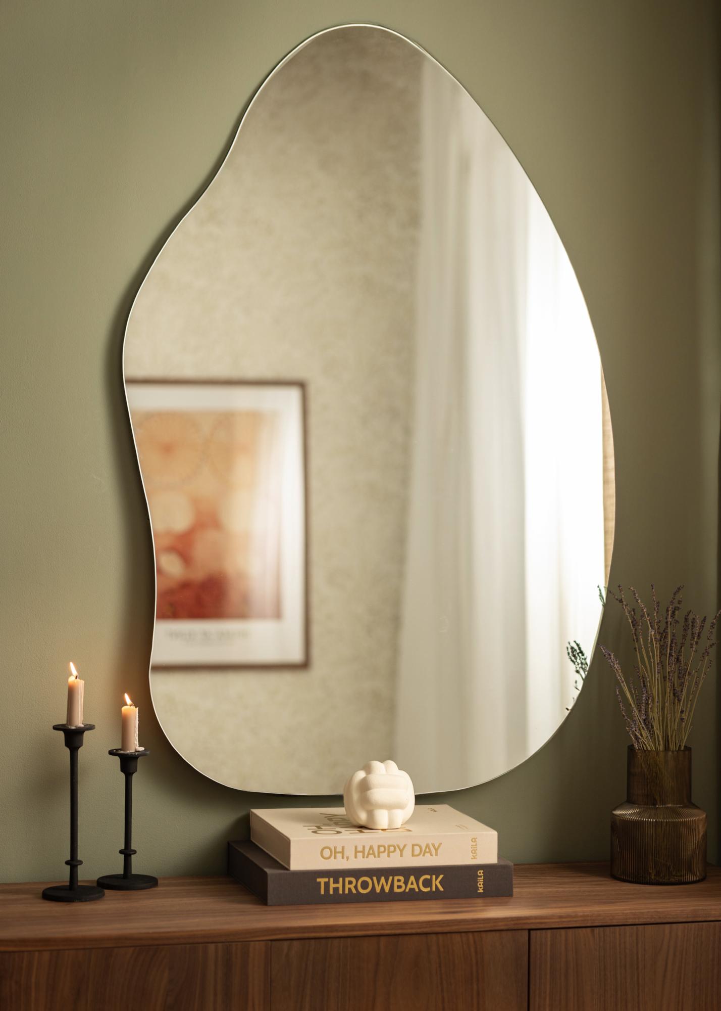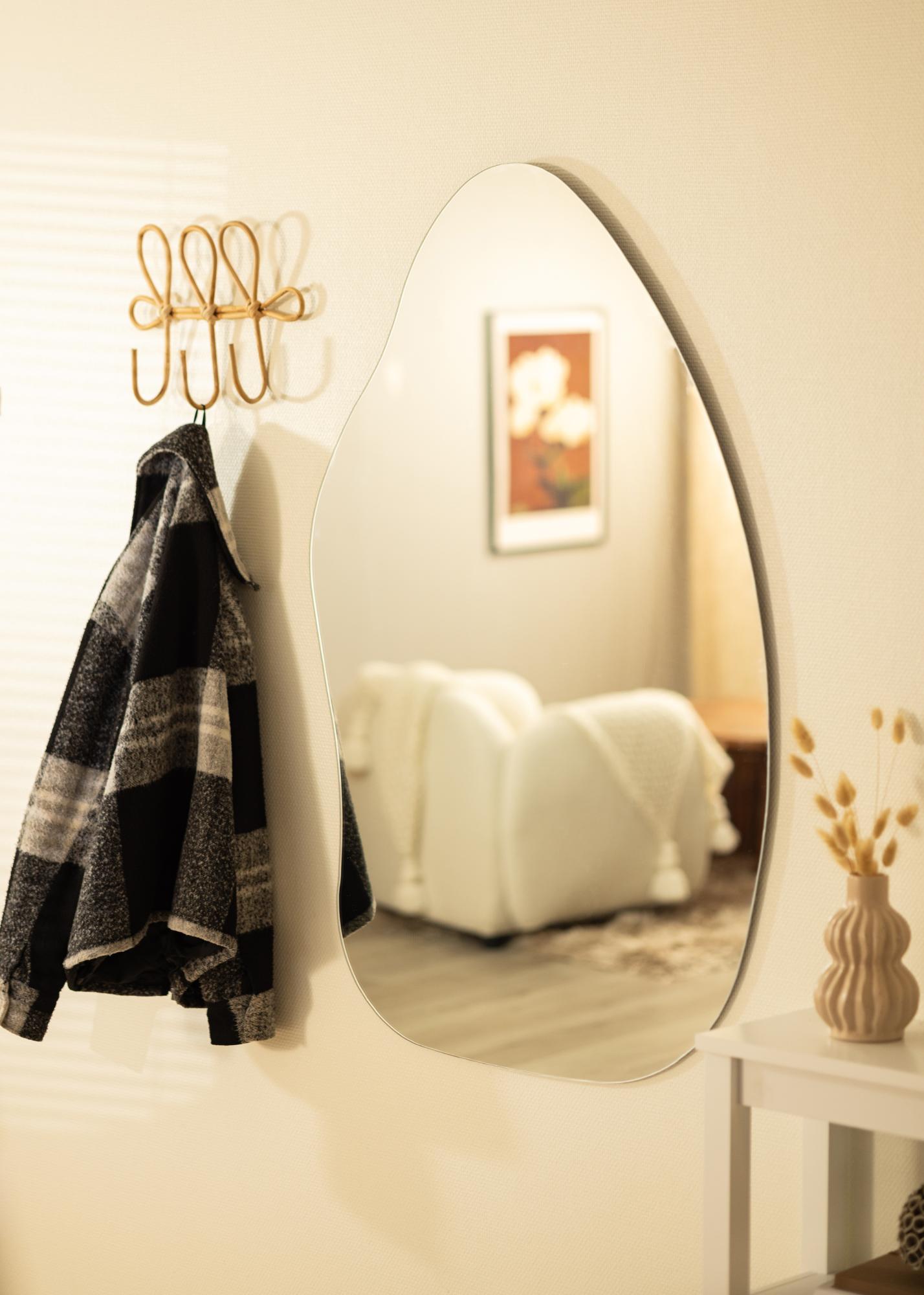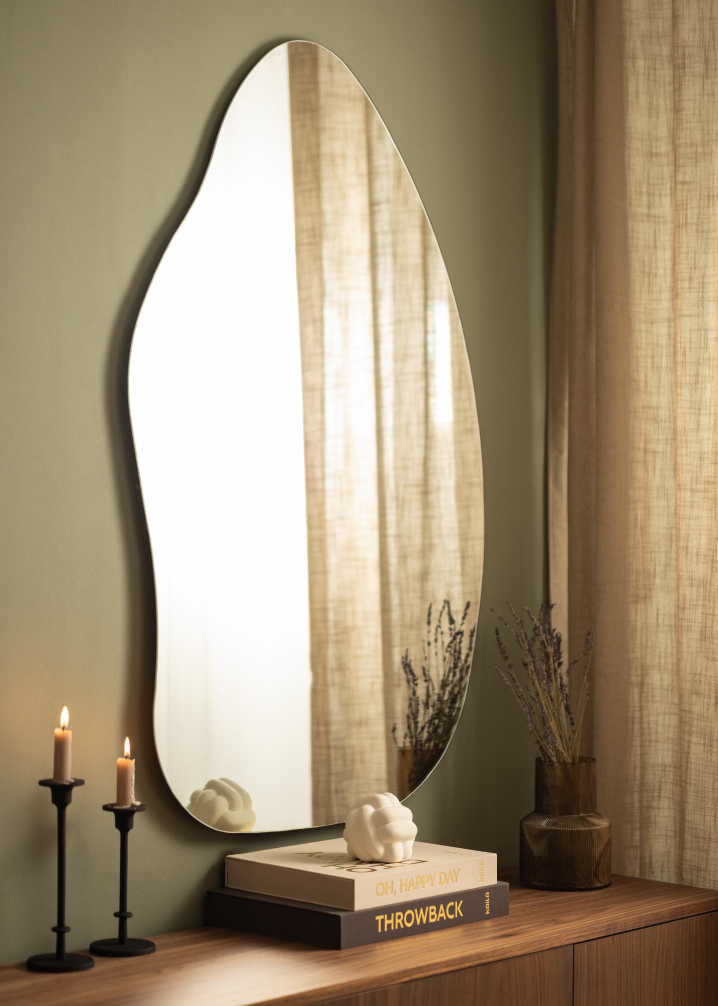 Lustro ma miękką i organiczną formę przypominającą kroplę wody lub stojący liść, co nadaje elegancki i nowoczesny charakter pomieszczeniu. Ta unikalna forma sprawia, że lustro staje się tematem do rozmowy i dziełem sztuki samym w sobie, jednocześnie spełniając swoją praktyczną funkcję.