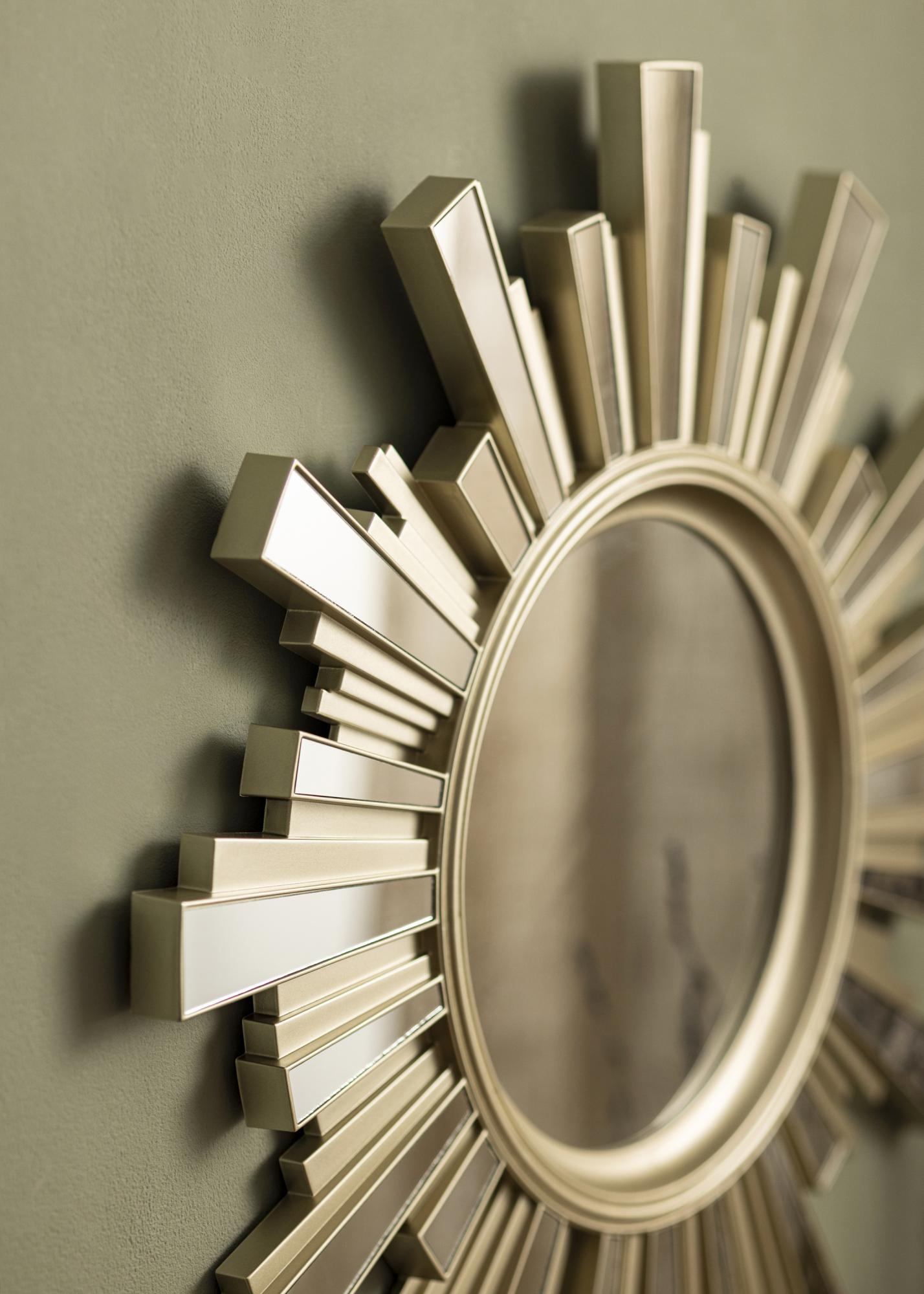 Ta okrągłe lustro ma bardzo dekoracyjną ramę w kształcie słońca. Rama jest w kolorze złotym, co nadaje lusterku elegancki i czysty wygląd.