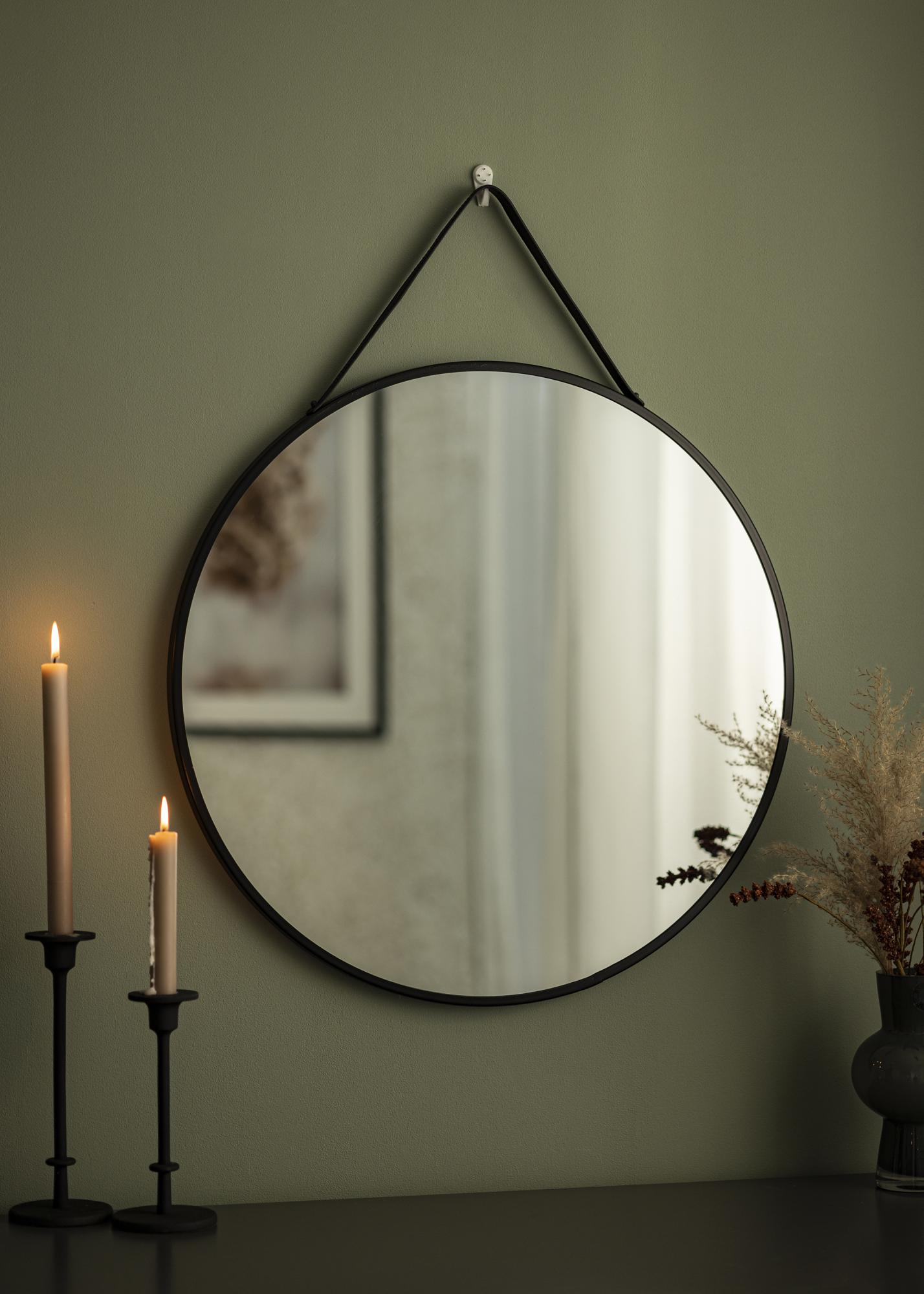 Trapani to eleganckie lustro ścienne z nutą czegoś wyjątkowego. Lustro jest okrągłe i otoczone stylową ramą z czarnego metalu. Lustro przymocowane jest do ściany za pomocą bardzo dekoracyjnego paska z ekoskóry.