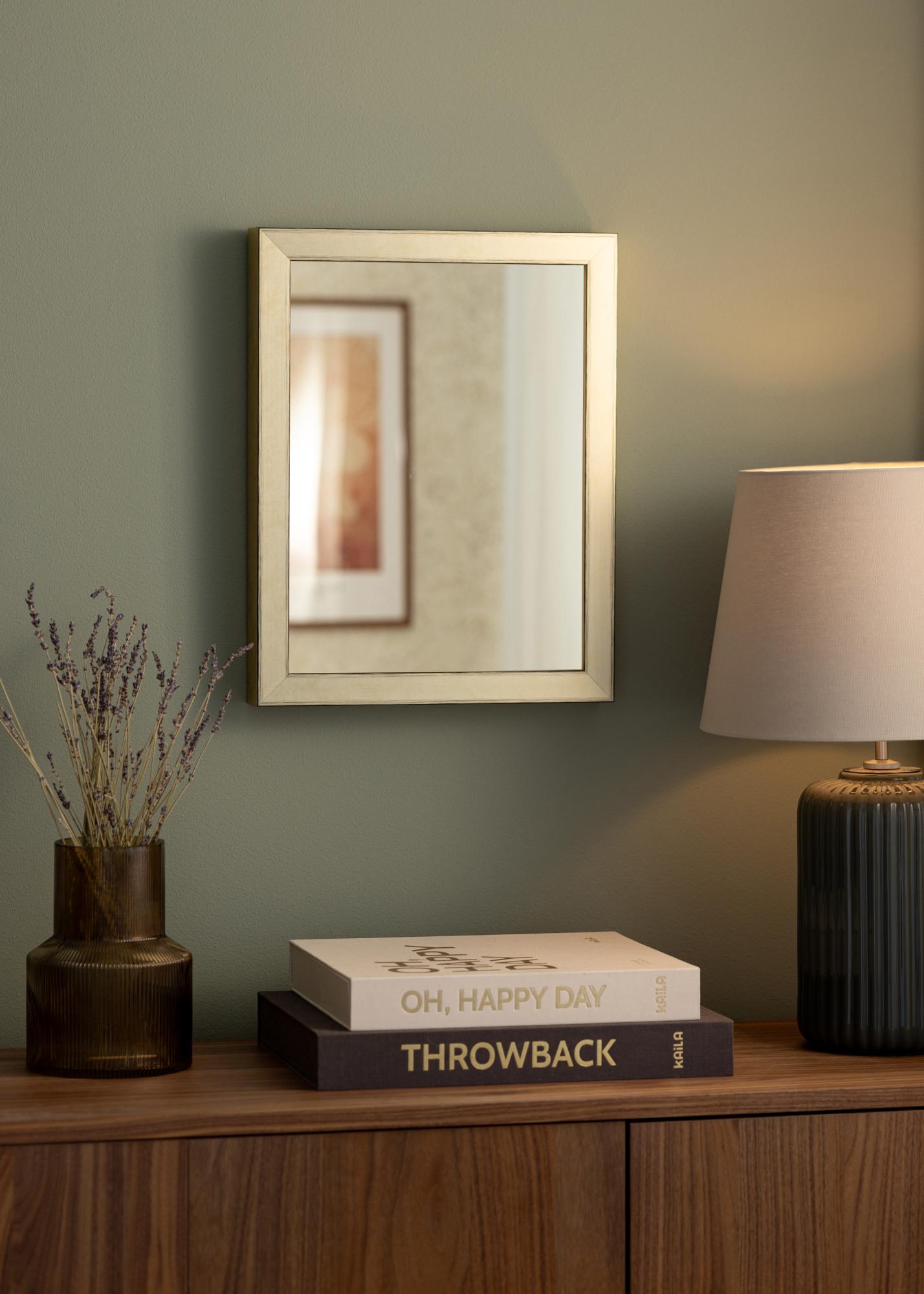 Rama lustra Tyr Złote ma szerokość 30 mm i głębokość 50 mm, co nadaje lustrze solidny i masywny wygląd. Wykonana z sosny, łączy trwałość z estetyką. Subtelna patyna na ramie nadaje lustrze unikalny charakter, nie dominując w pomieszczeniu, co czyni je doskonałym wyborem do wszystkich typów wnętrz.