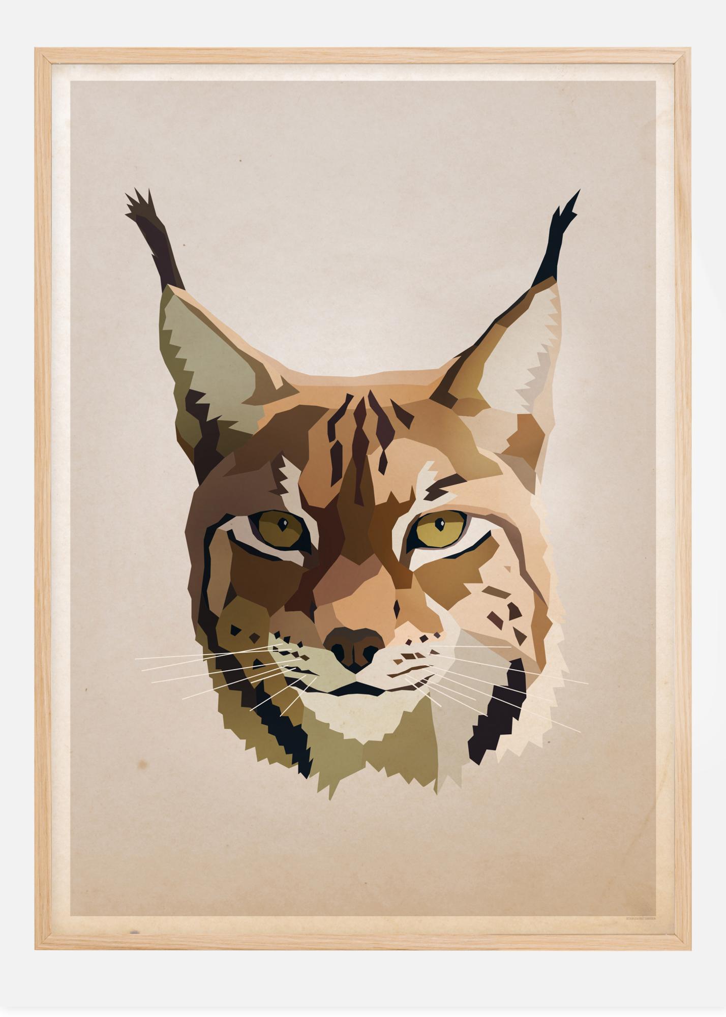 Intensywny plakat w pastelowych kolorach z pięknym rysiem. Na jasnoróżowym tle oczy zwierzęcia przedstawiają uważne, a jednocześnie dominujące spojrzenie. Różne brązowe i zielone pastelowe kolory pięknie wtapiają się w oczy rysia.