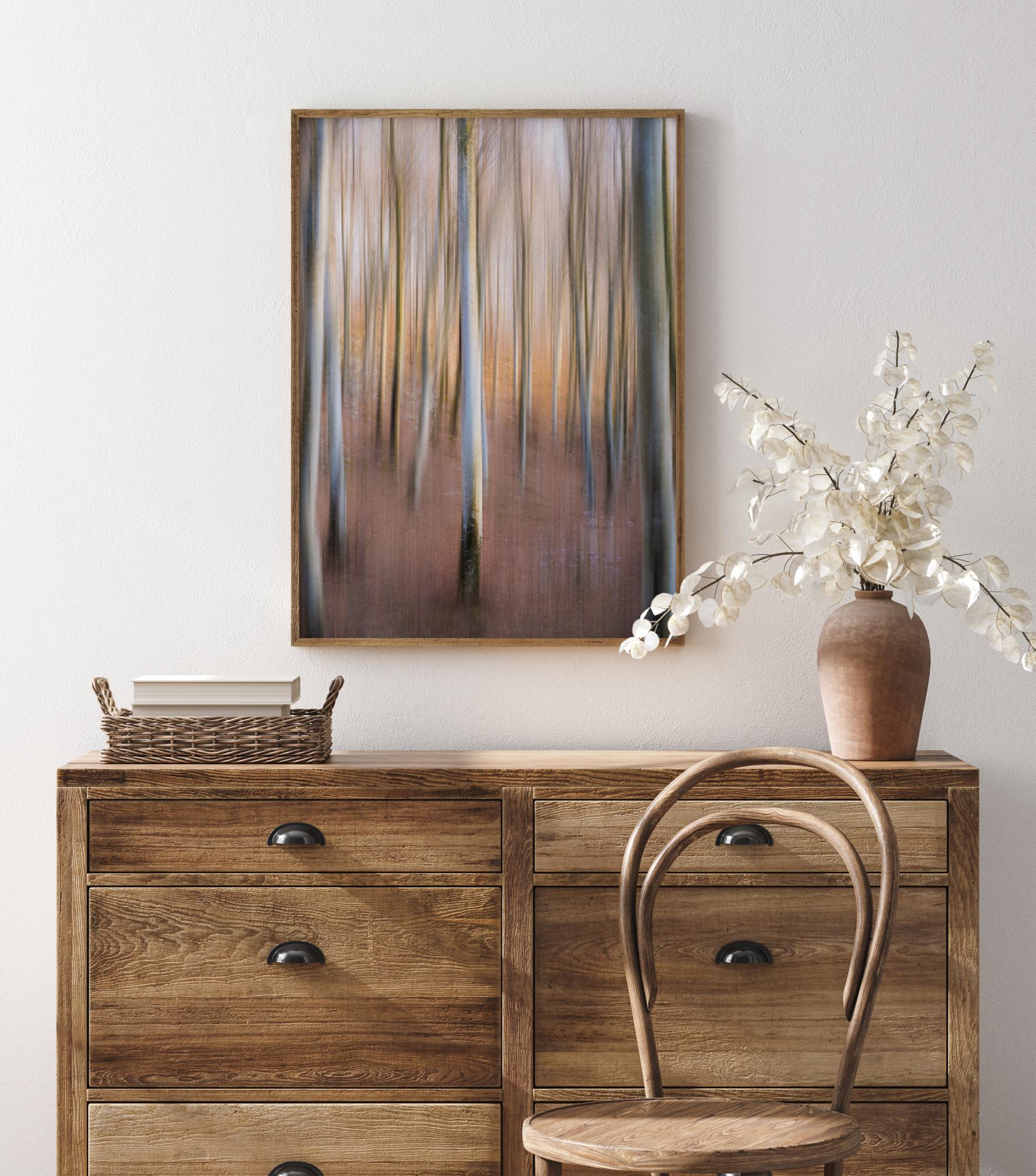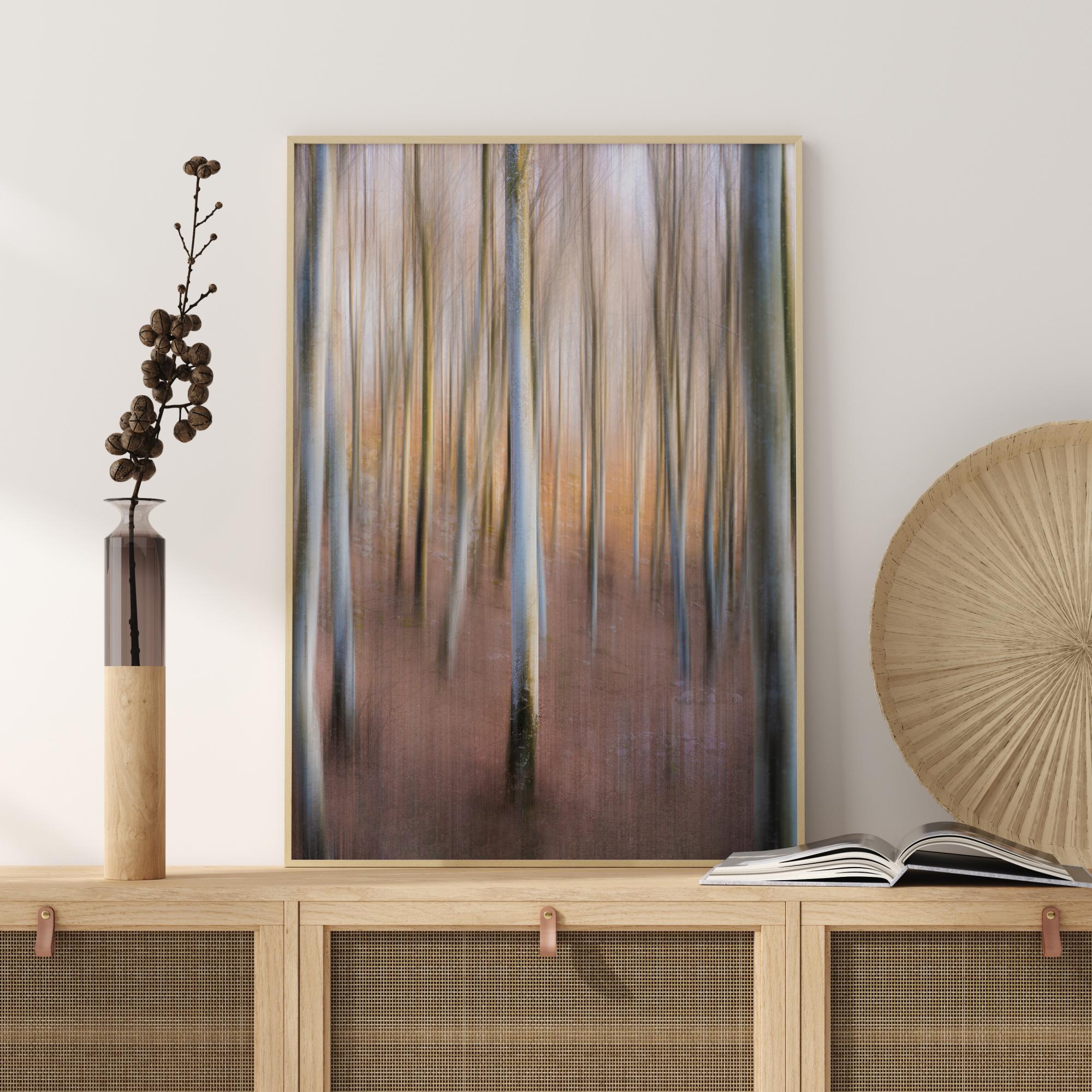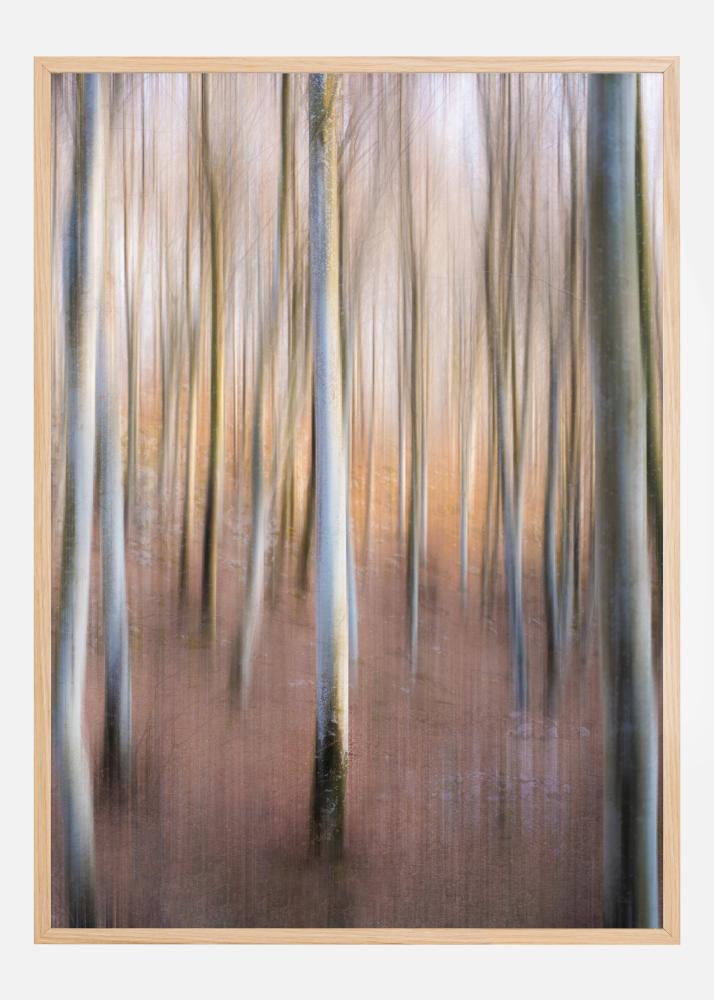 Piękny, ale tajemniczy plakat z magicznym lasem. Dzięki naturalnemu światłu przenikającemu przez drzewa, magiczne pastelowe kolory podkreślają wysokie pnie drzew. Usłysz ciszę lasu, gdy powiesisz ten obraz w swoim domu.
