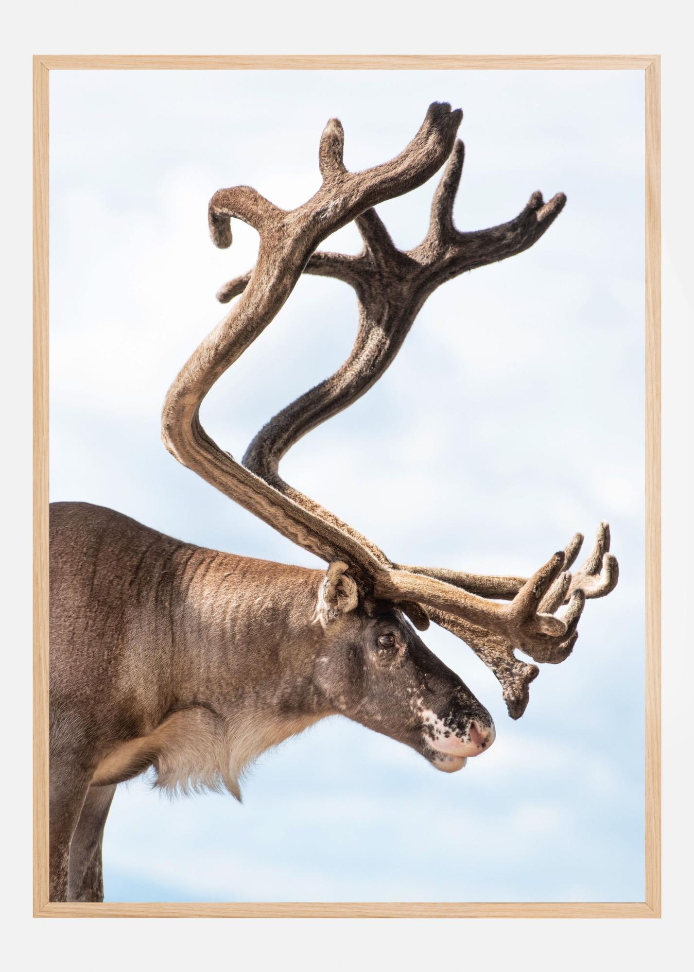 Ten motyw przedstawia dostojnego renifera w profilu z imponującymi, rozgałęzionymi porożami na tle miękkiego i jasnego nieba. Zdjęcie ma naturalny, nordycki charakter, który doskonale sprawdzi się jako plakat lub afisz w salonie, sypialni czy górskiej chacie. Bogactwo detali na fotografii oddaje poczucie dzikiej przyrody, spokoju i siły – to oczywisty wybór dla miłośników motywów zwierzęcych, skandynawskiego designu i modnych nadruków inspirowanych naturą.