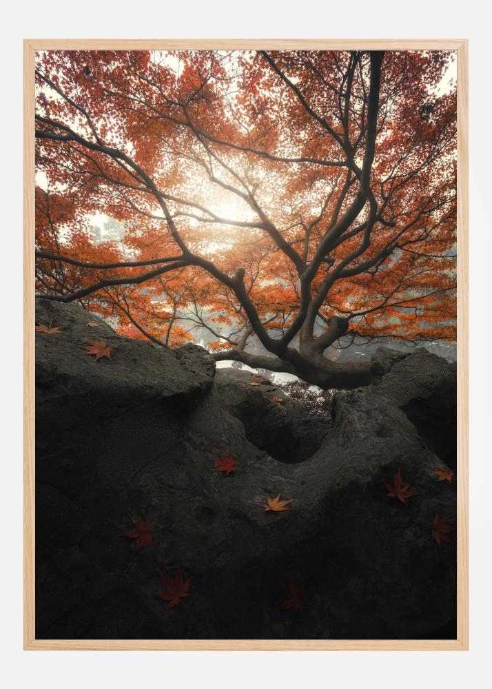 Oszałamiający plakat przyrodniczy z pięknym, pomarańczowym klonem. Fotografowany z perspektywy żabiej, silne światło słoneczne prześwieca przez gałęzie, tworząc ciepłe i relaksujące wrażenie. W tle pojedyncze czerwone i pomarańczowe liście spadły na pień. Dodaj odrobinę natury do swojego domu z tym wydrukiem.