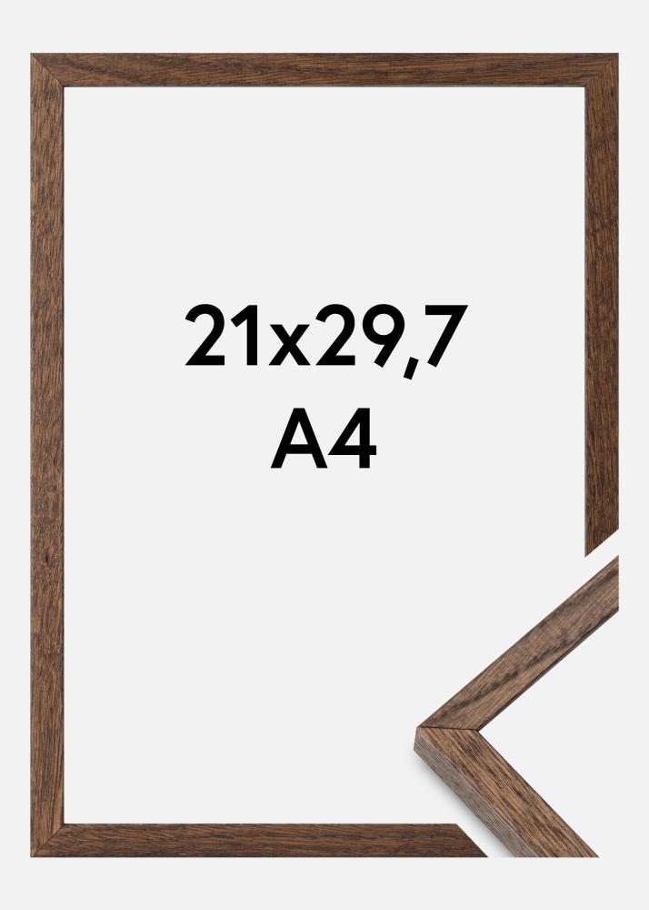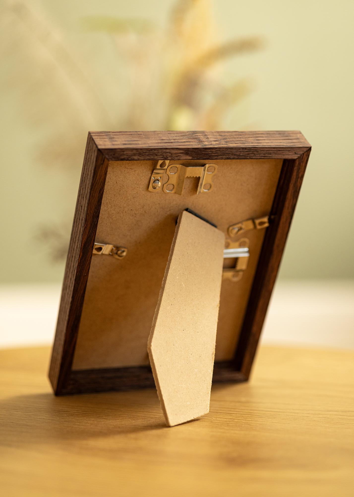 Ta elegancka ramka na zdjęcia w kolorze ciemnego dębu jest idealna do wyeksponowania Twoich ulubionych motywów w rozmiarze 21x29,7 cm (A4). Listwa ramy ma szerokość 13,5 mm i głębokość 22,5 mm, oferując stabilne i eleganckie obramowanie. Wykonana z sosny, ta ramka na zdjęcia daje naturalne i ciepłe odczucie dzięki swojej ciemnobrązowej drewnianej strukturze.