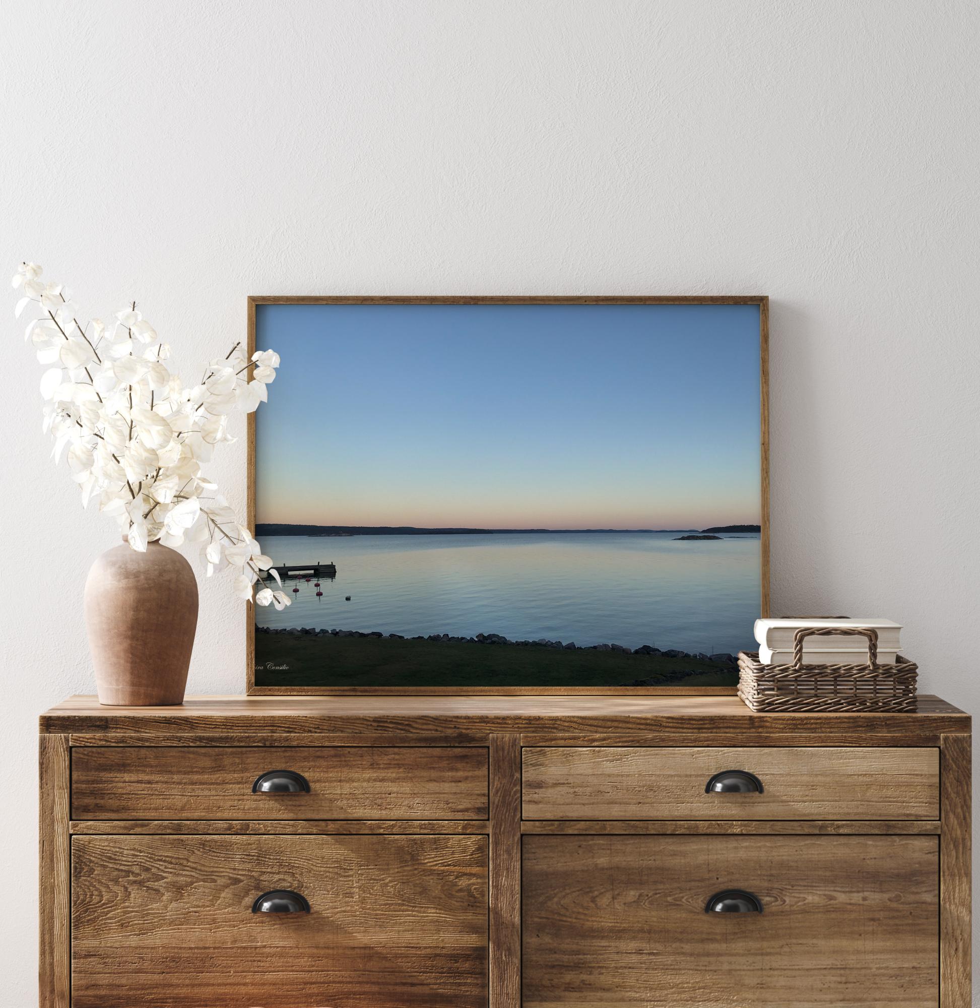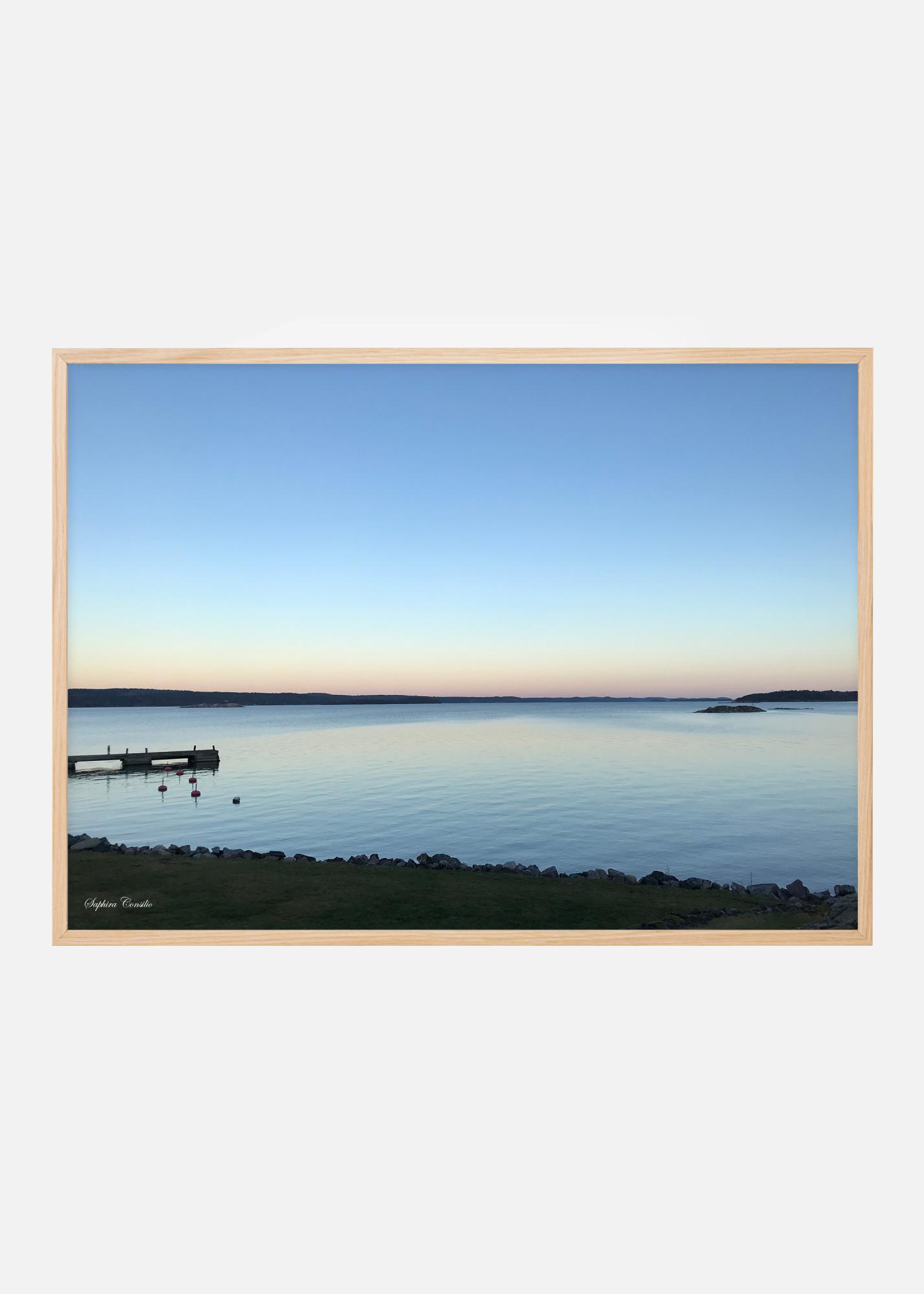 Fotograficzny plakat szwedzkiego archipelagu z jego wyspami i skałami w pięknym zachodzie słońca. Pomost z przylegającymi bojami dodaje obrazowi nieco więcej życia. Wspaniale kojący plakat stworzony przez fotografkę Saphira Consilio.